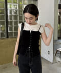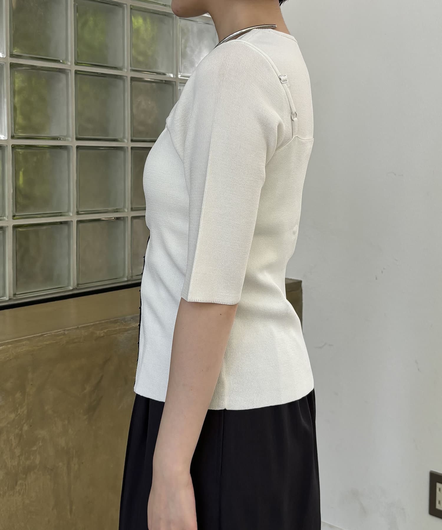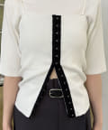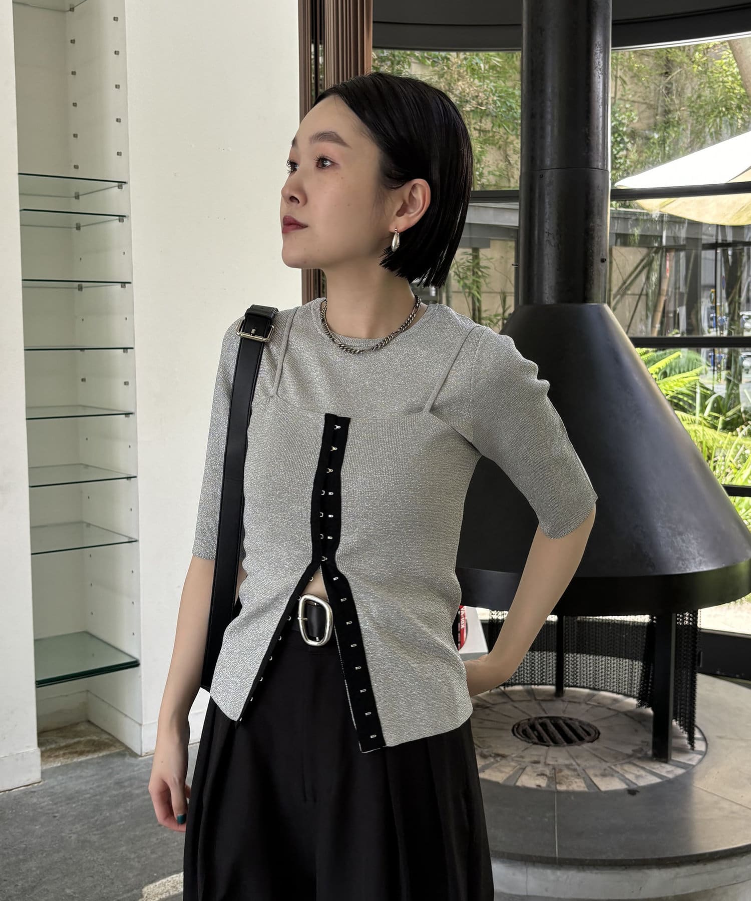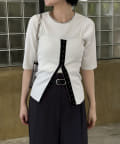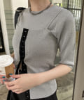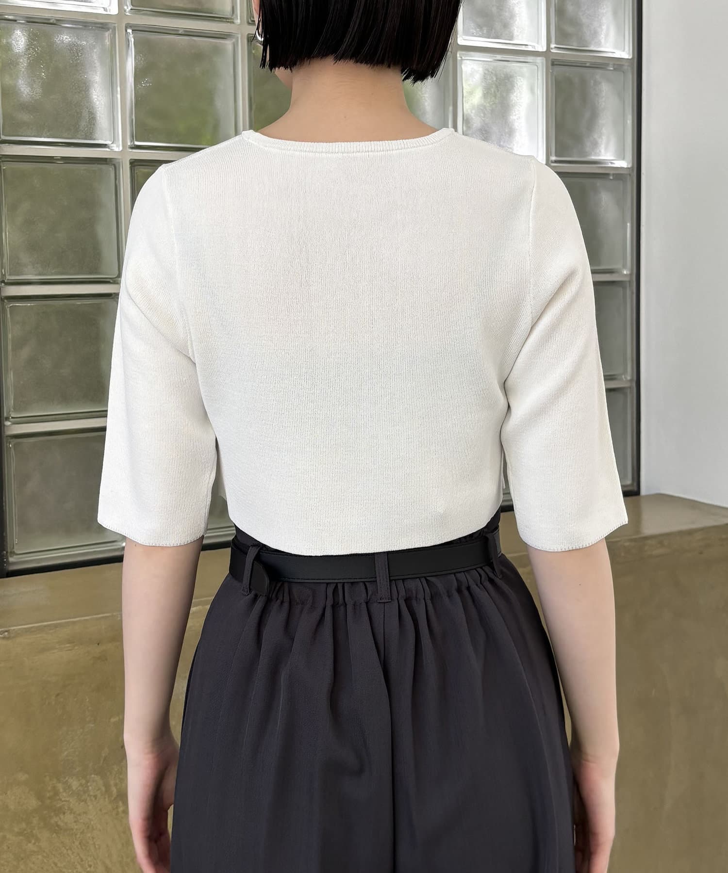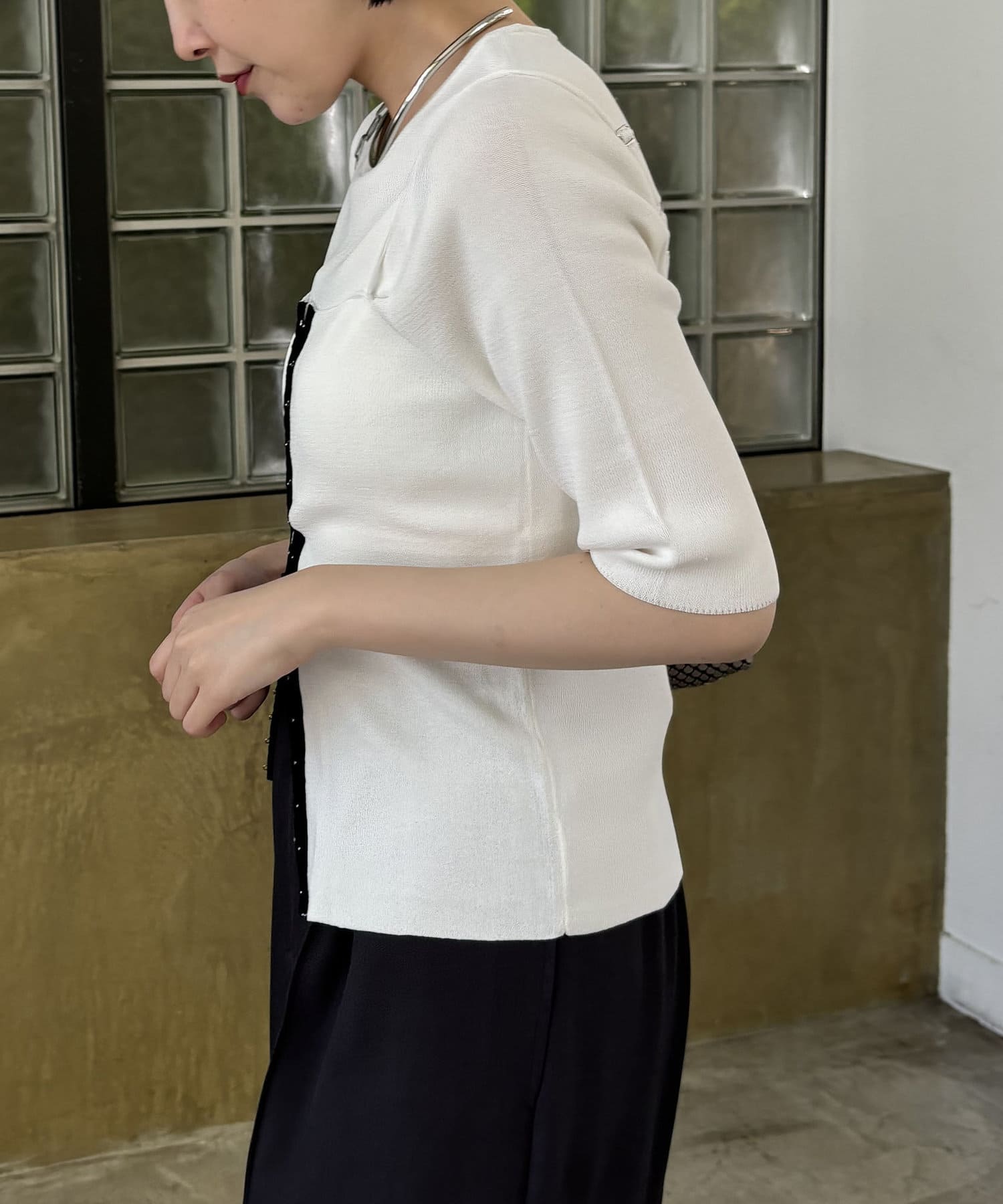 ・トレンドライクな短丈トップスと前開きキャミのレイヤードニット