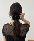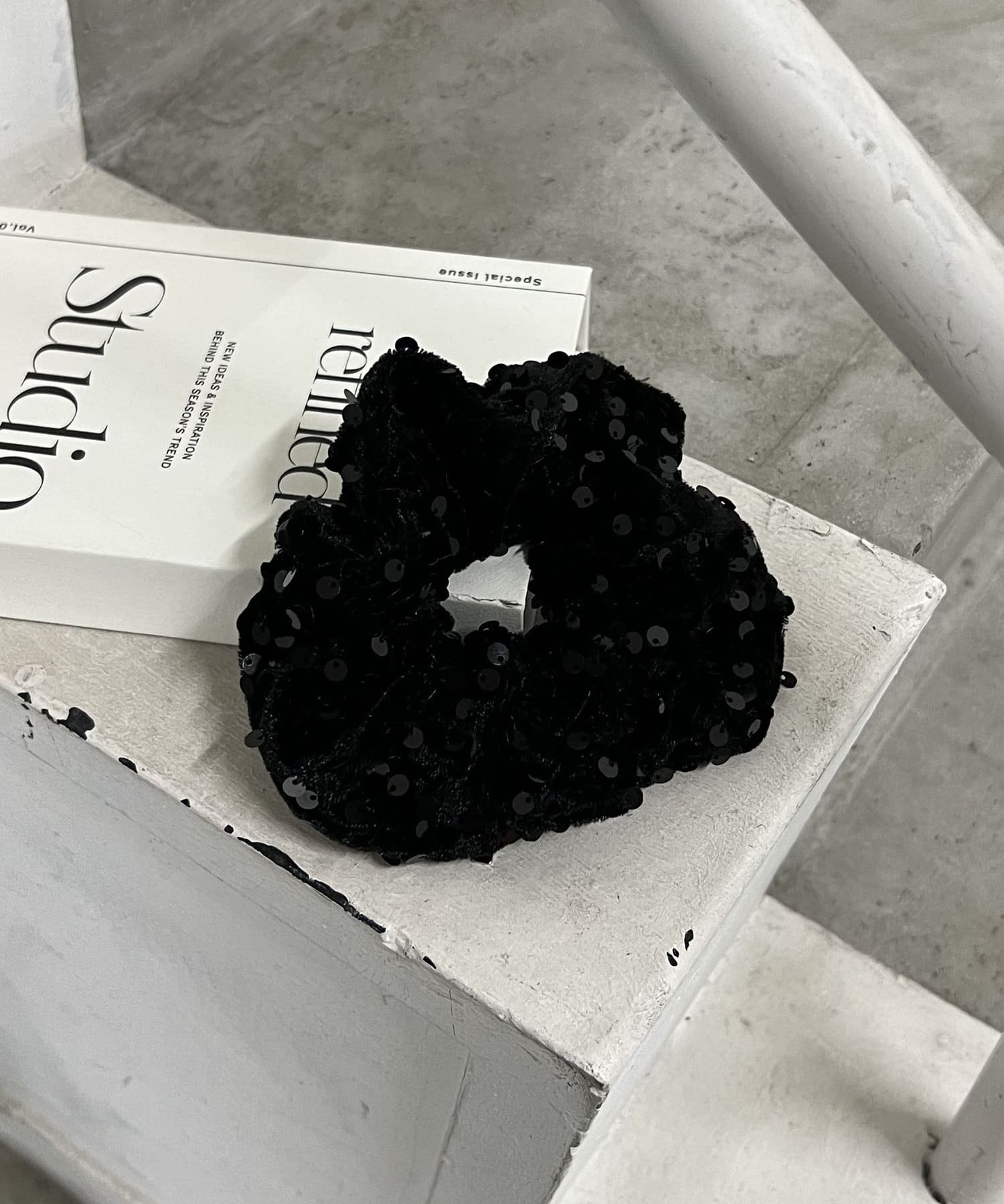 ベロア生地にあしらわれたスパンコールの輝きが目を惹くシュシュ