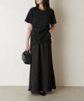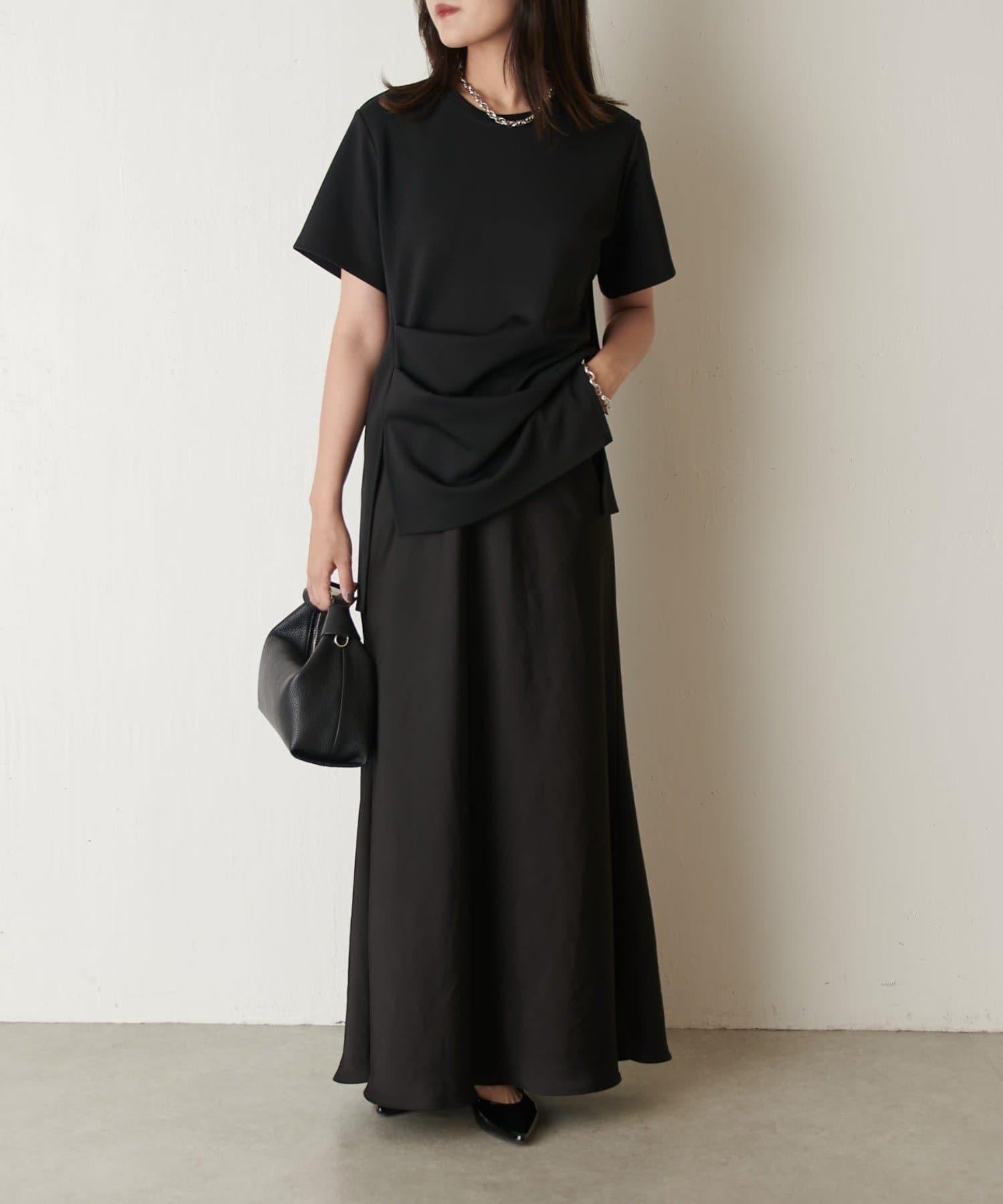 ヒップ下から裾に向かって流れるようなドレープとフレアラインが女性らしさを高めてくれます。