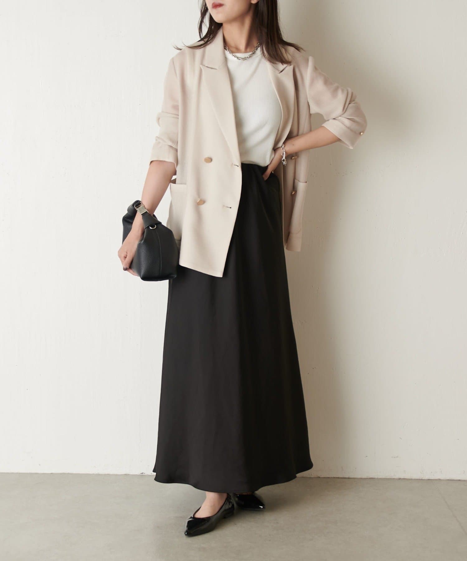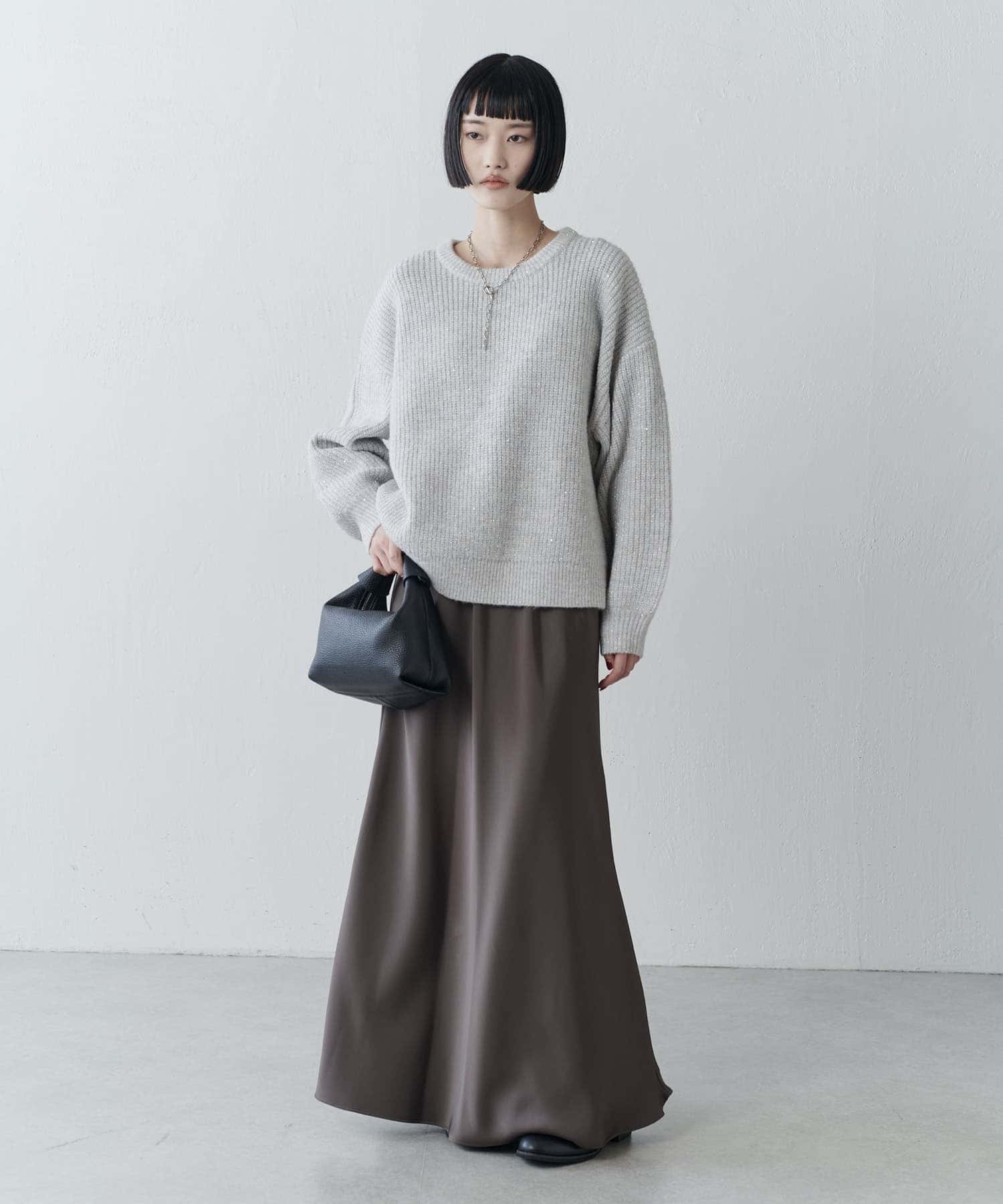 サテン生地の軽いスカートなのでざっくりしたニットやオーバーなスウェット等の重めなトップスと合わせたバランスが今年らしくておすすめです!