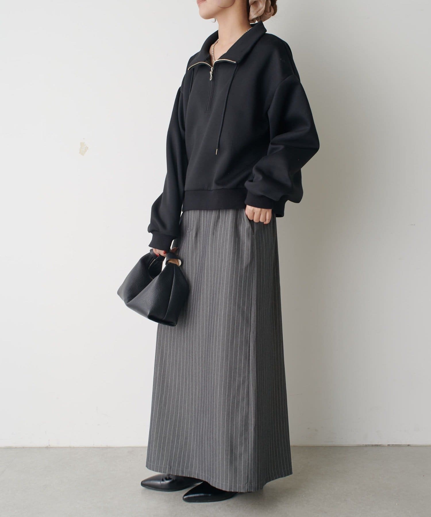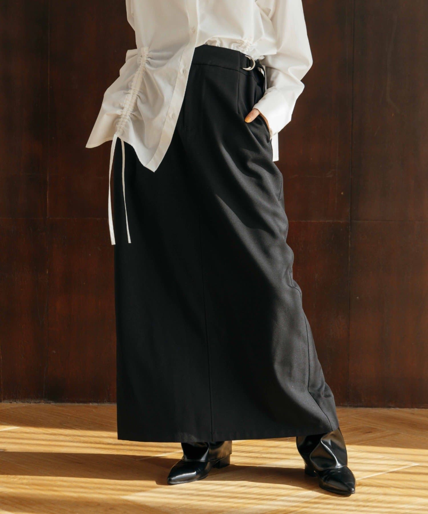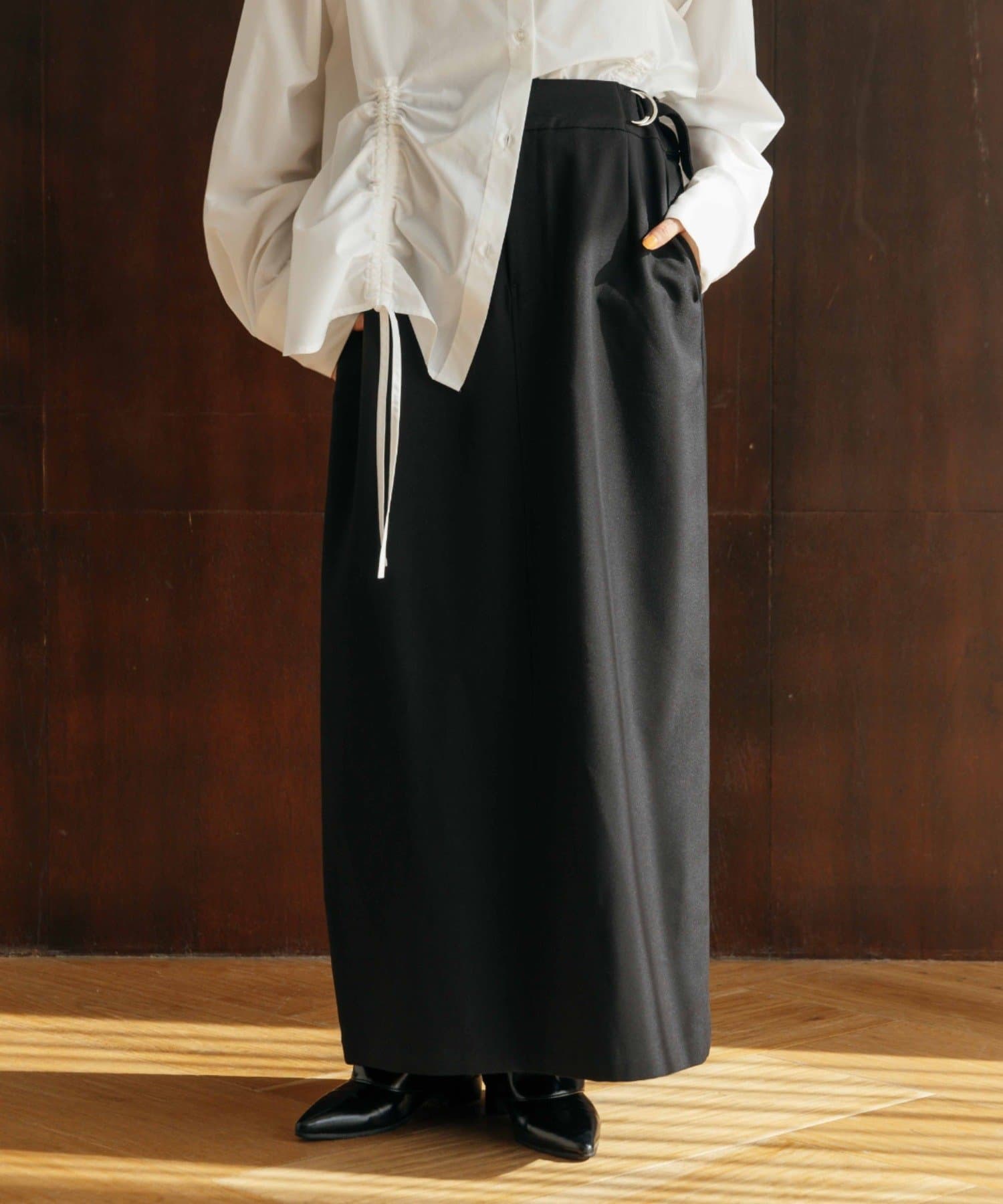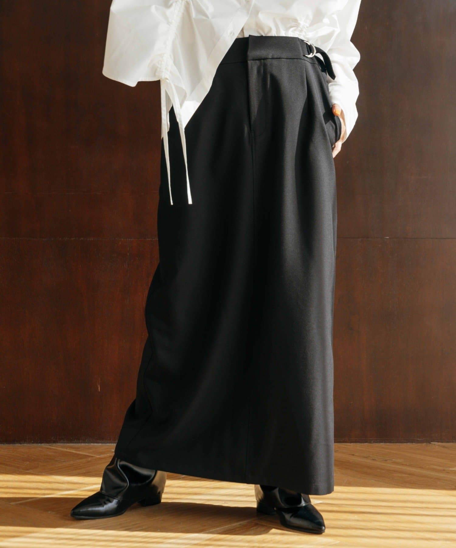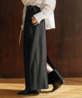 マニッシュな印象に仕上げた今季トレンドのIラインロングスカート。