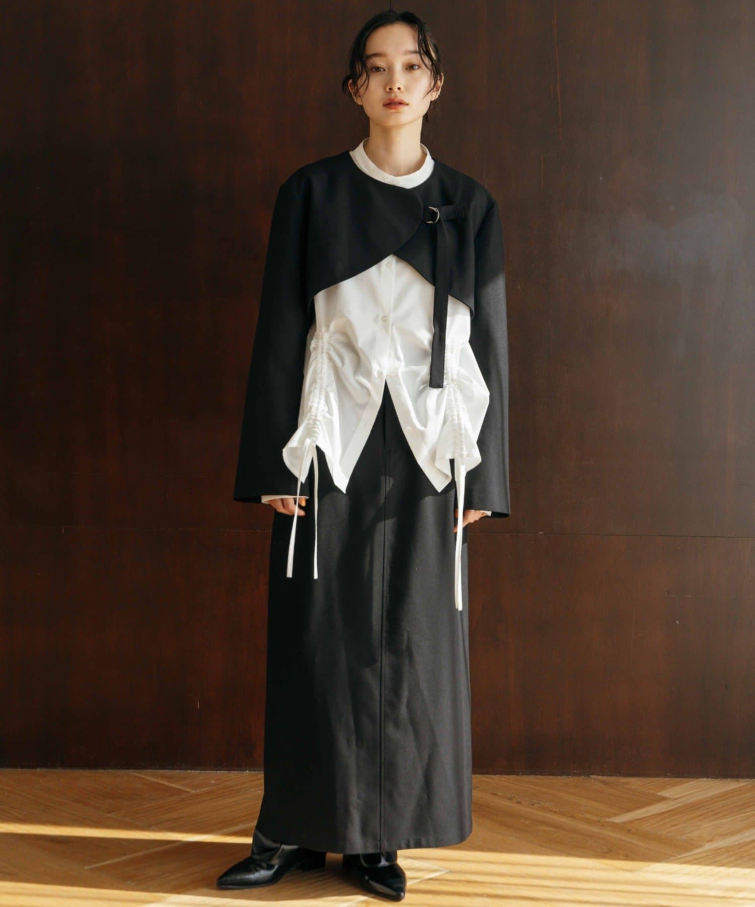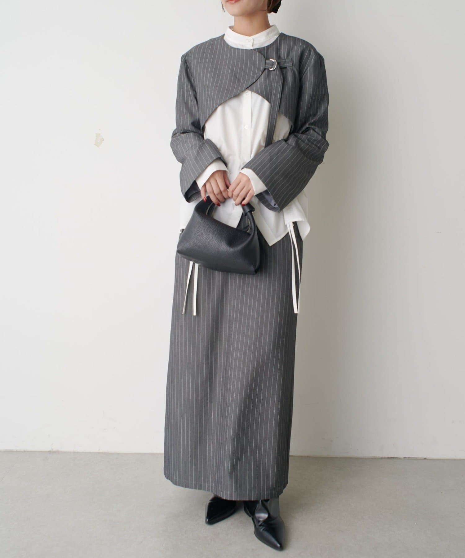 サイドにベルトを付けて、シンプルでキレイめな印象ながらも遊び心のある印象に。