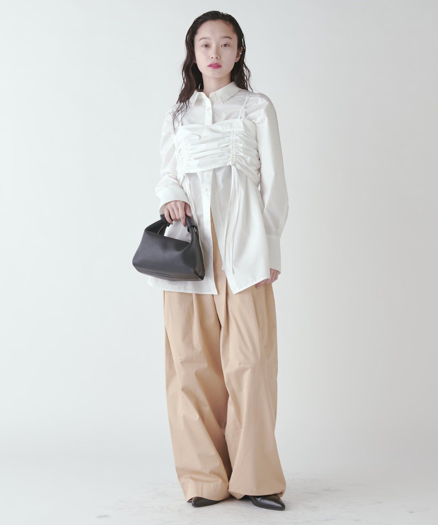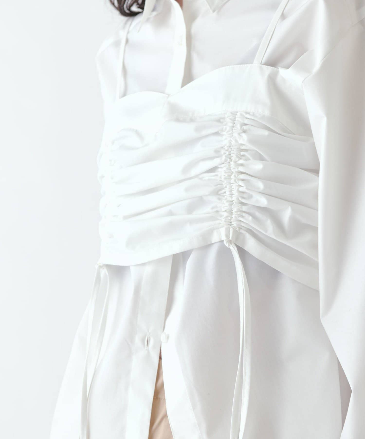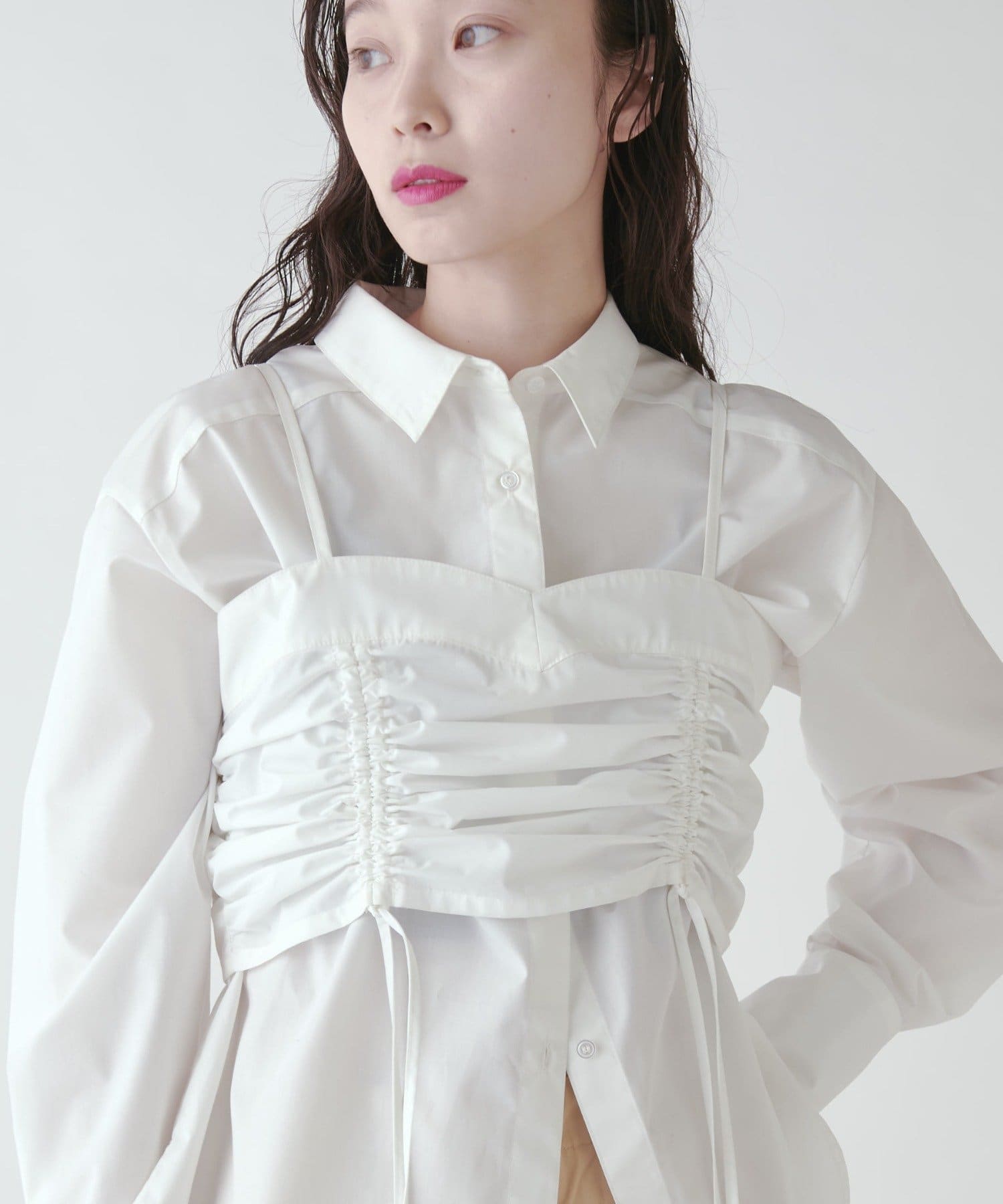 同素材のビスチェトシャツがセットで、クリーンでまとまりのあるスタイリングに。