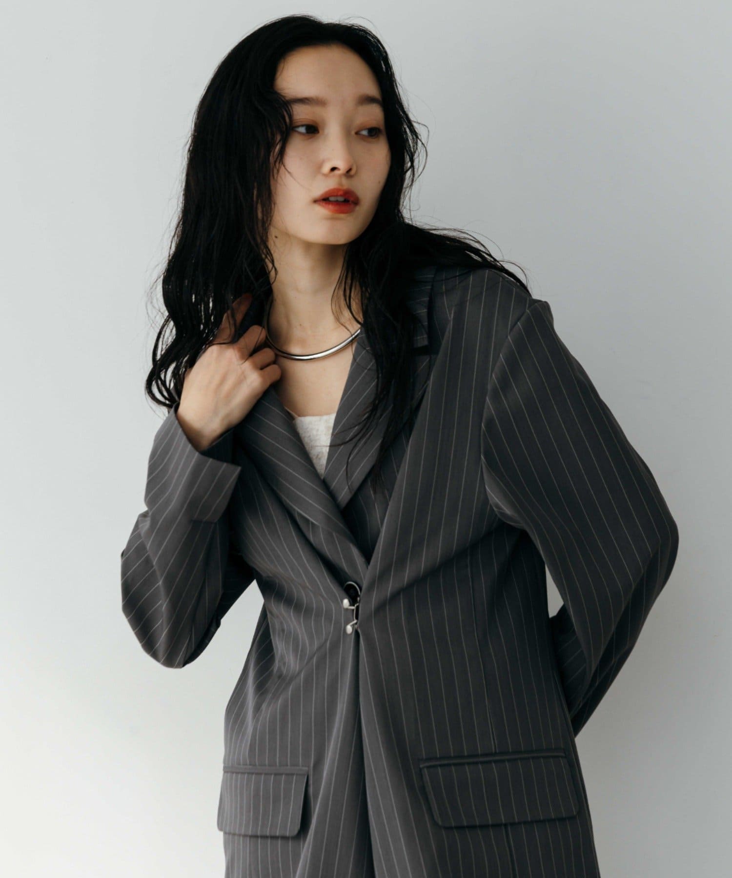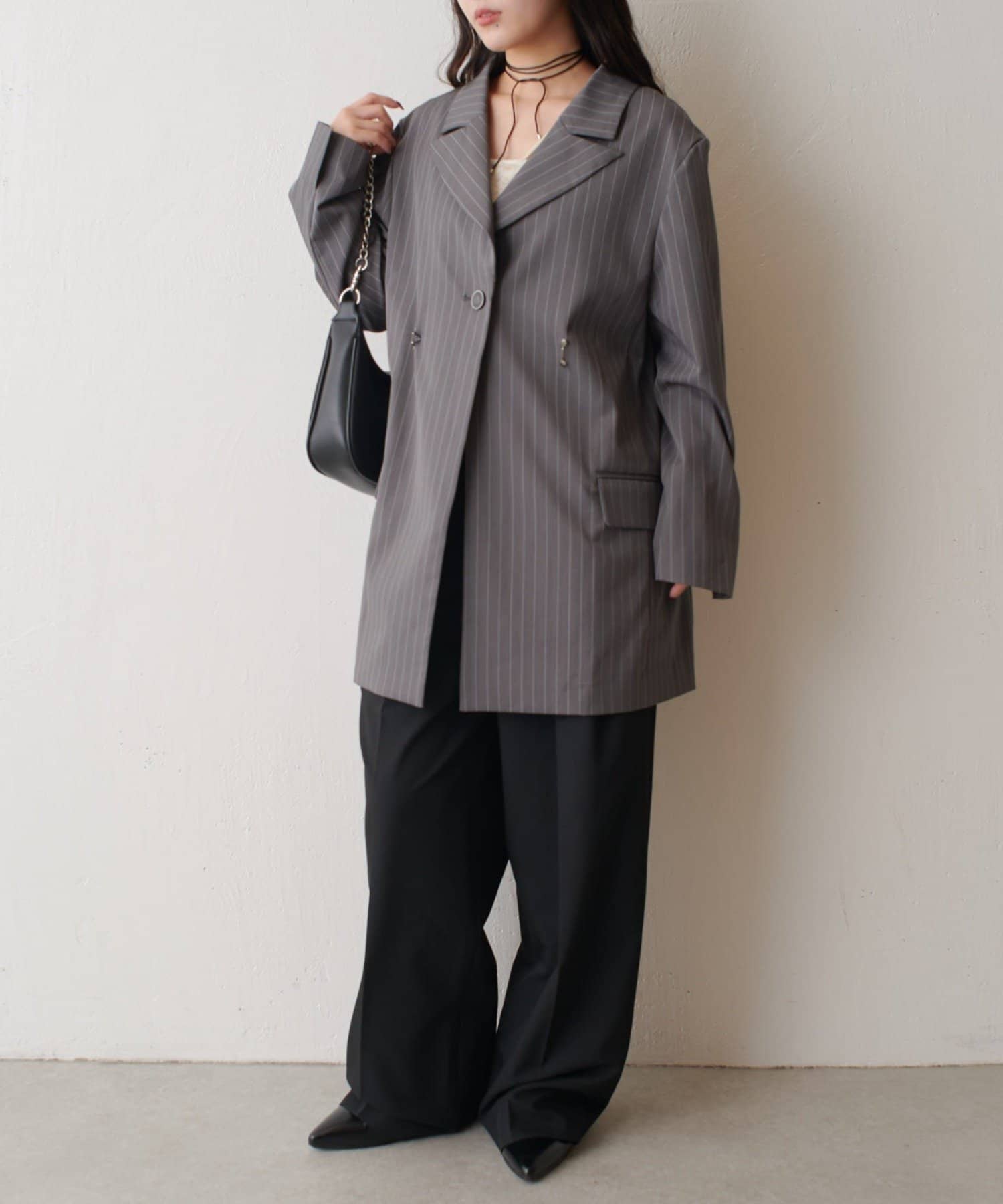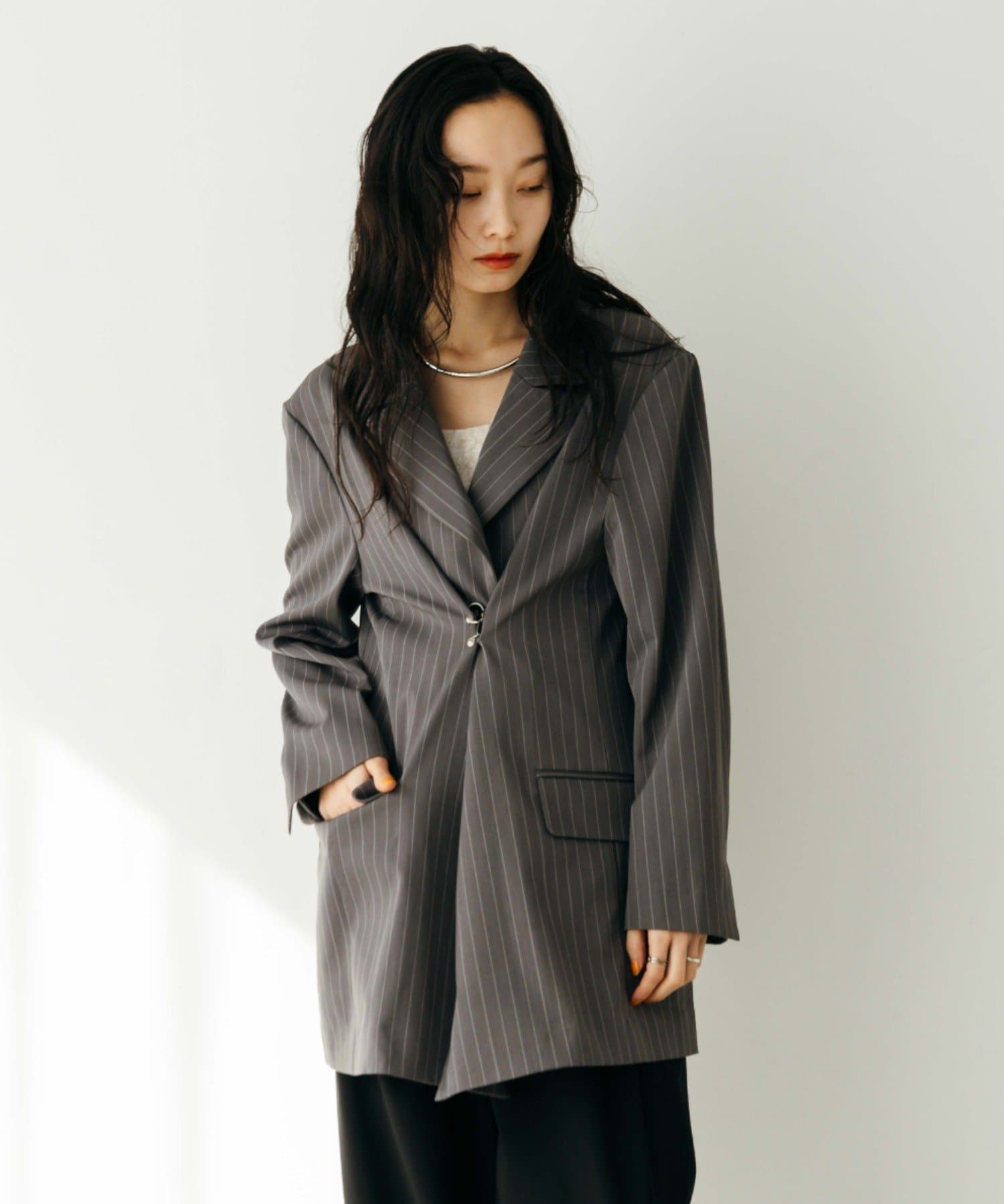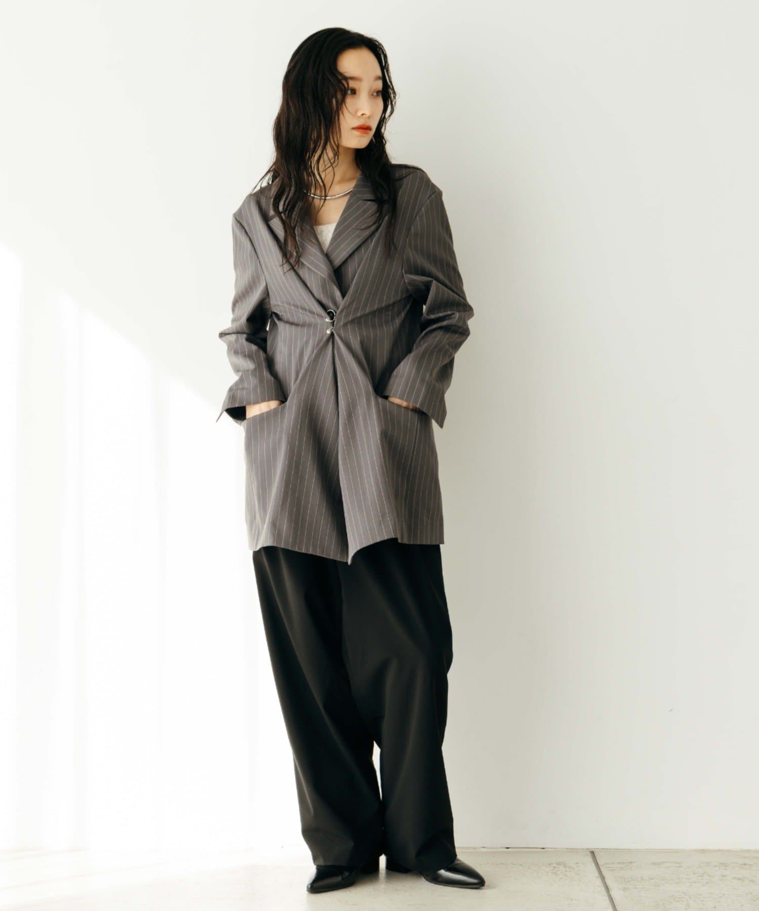 存在感のある大き目のラペルはモードな雰囲気が演出されます。