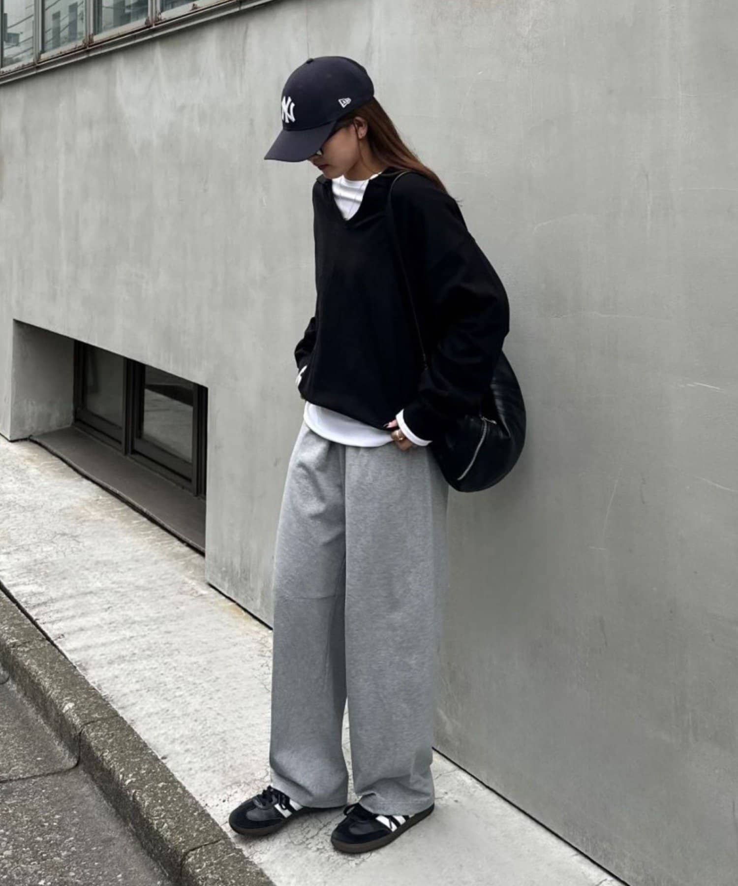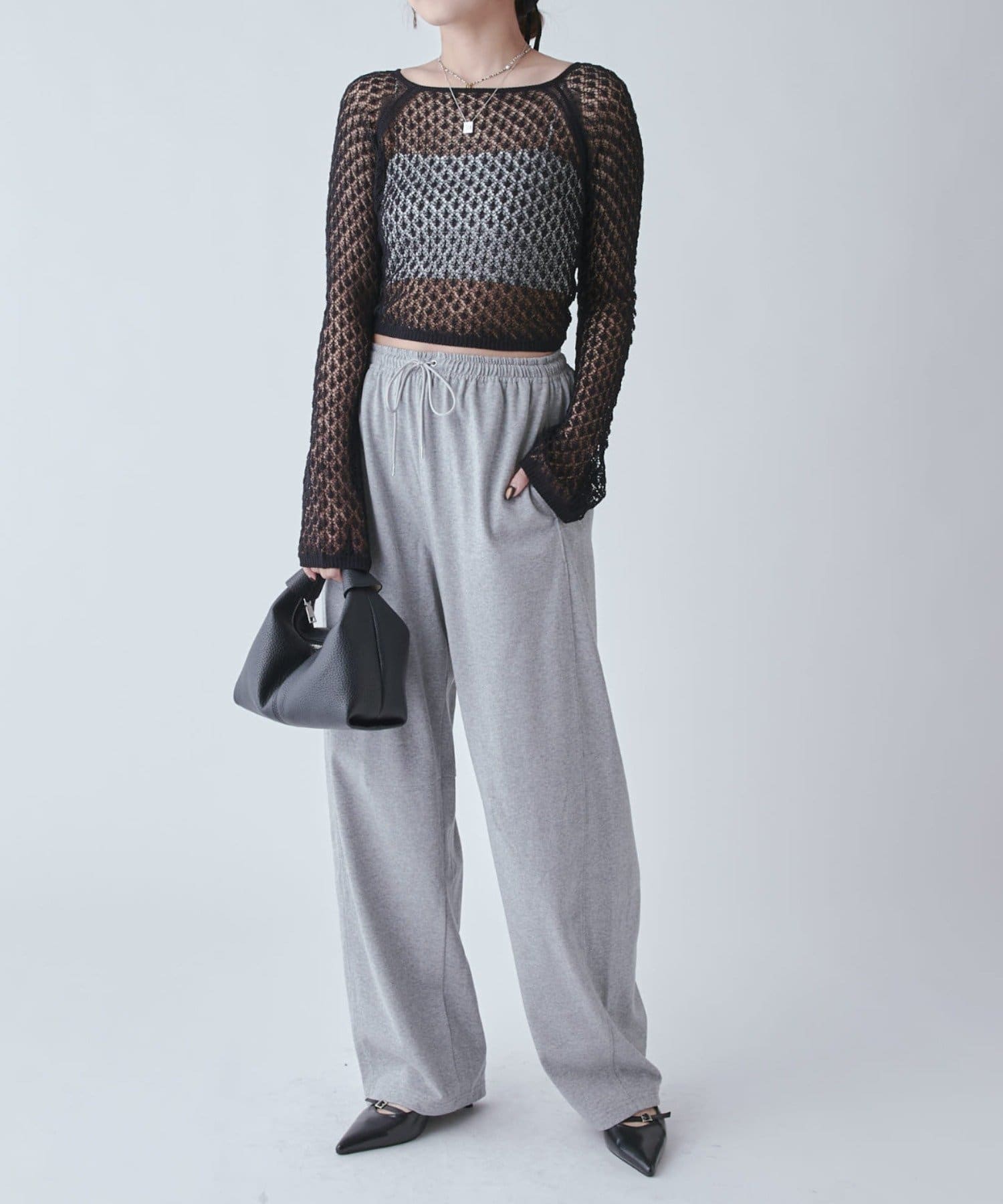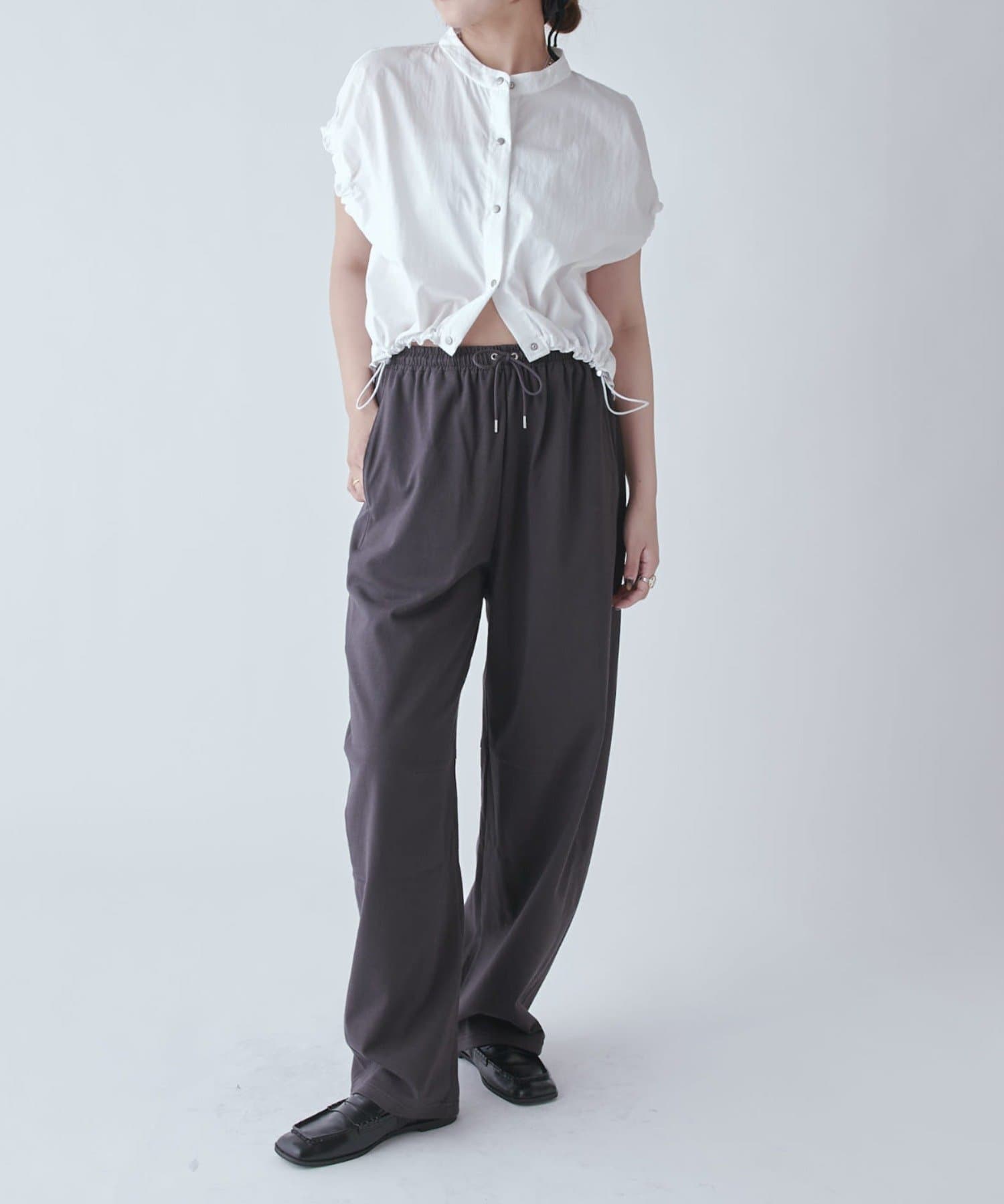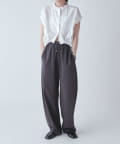 カジュアル見えしがちなスウェットパンツですが、このデザインと素材感なのでキレイめアイテムにしっかりハマります。