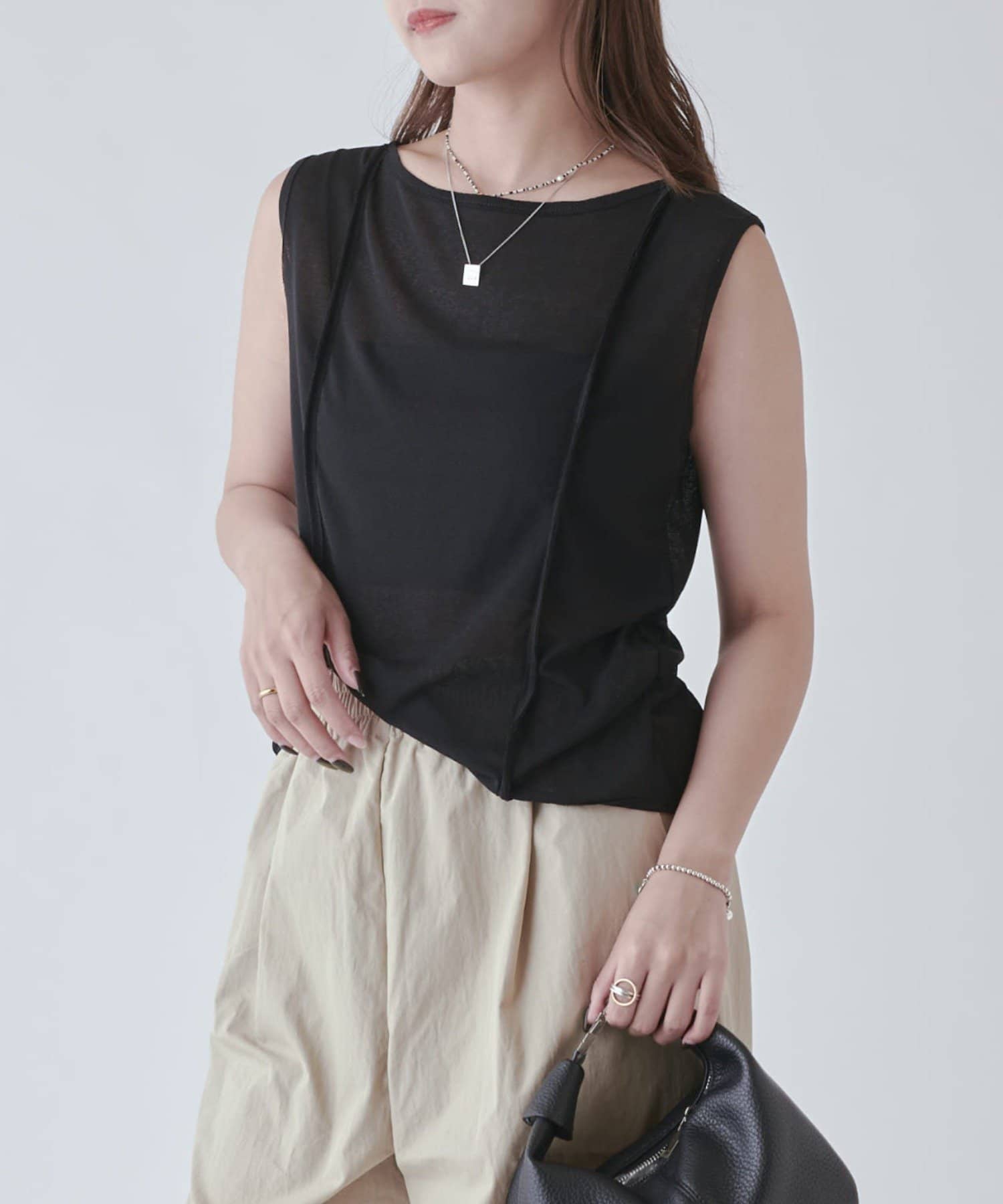 女性らしいスカートで着ることも可能なので、幅広く楽しめるトップス。