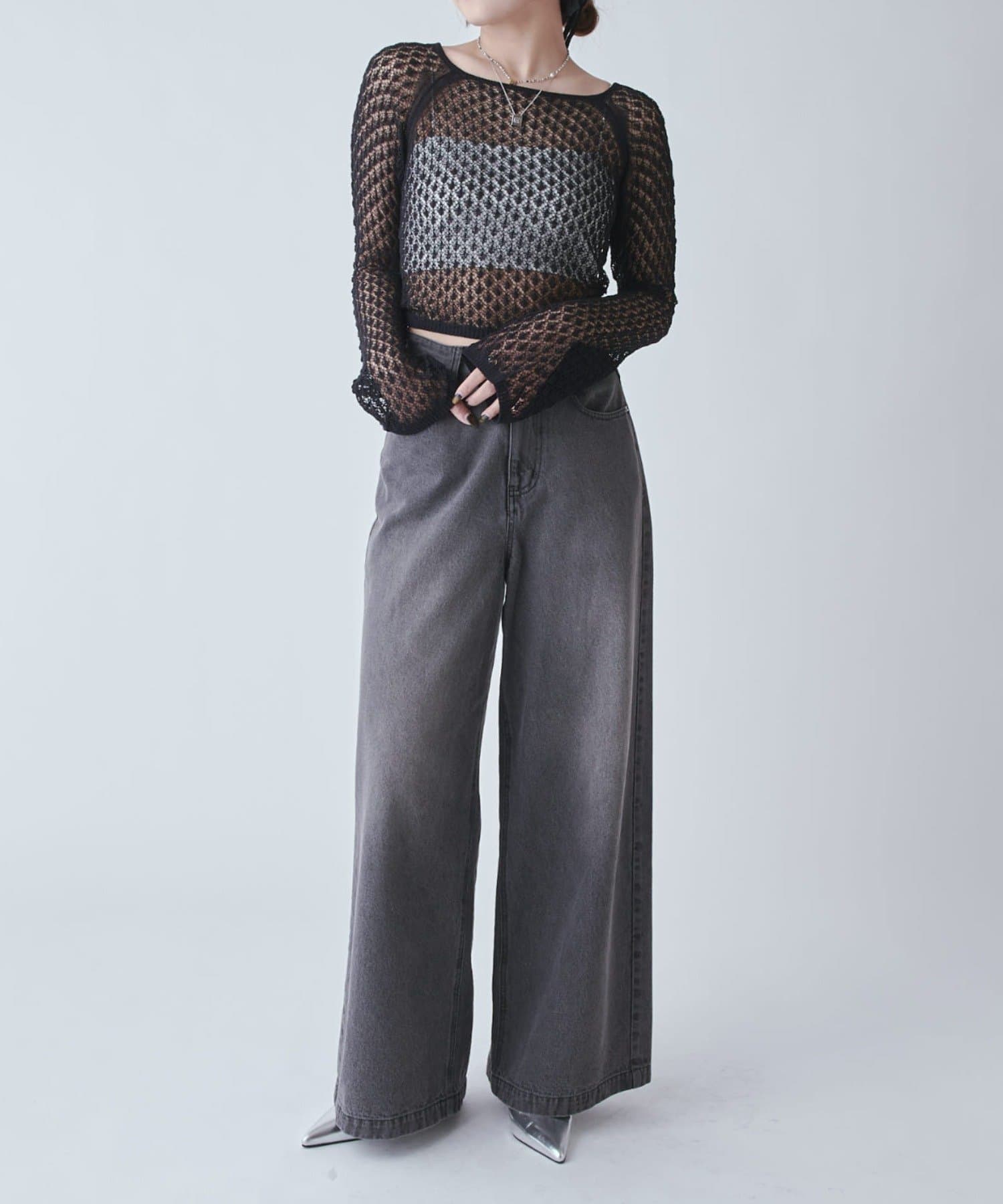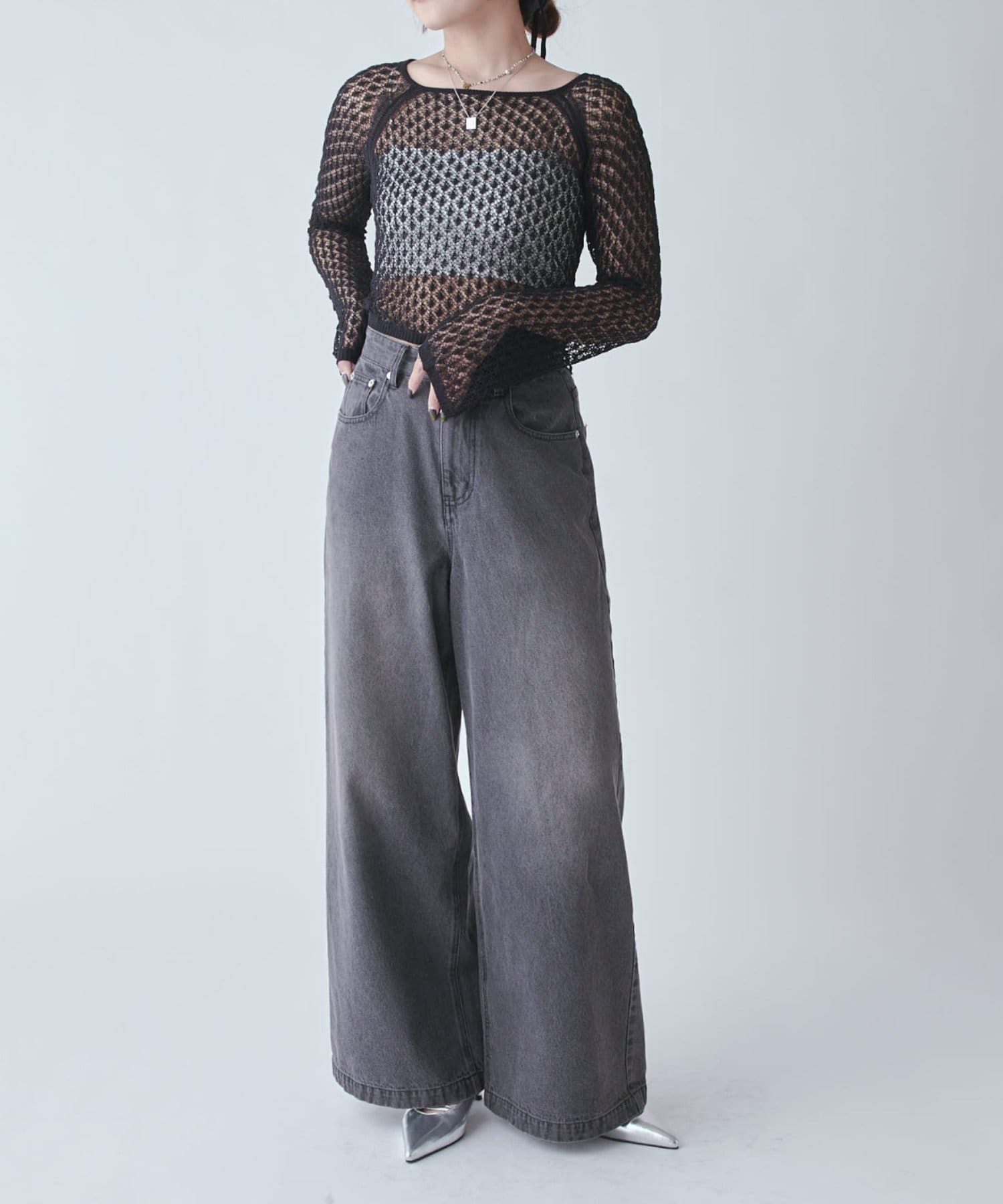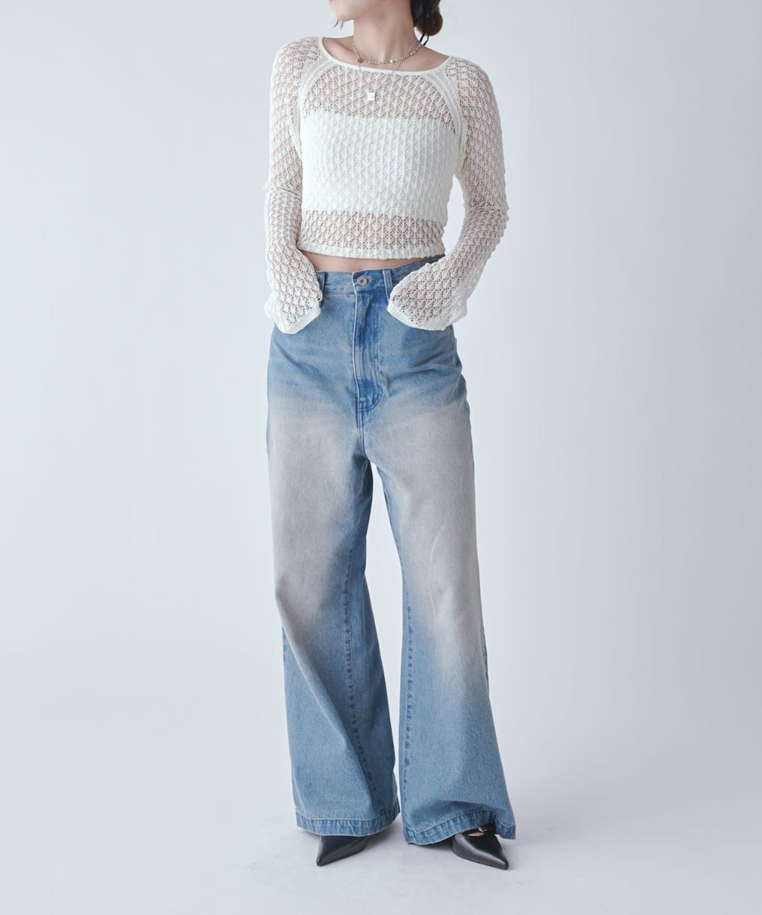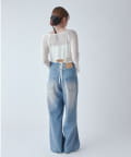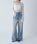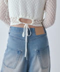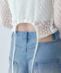 女性らしい肌見せのできるアイテムなので、デニムのカジュアルダウンさせたスタイリングがおすすめ。