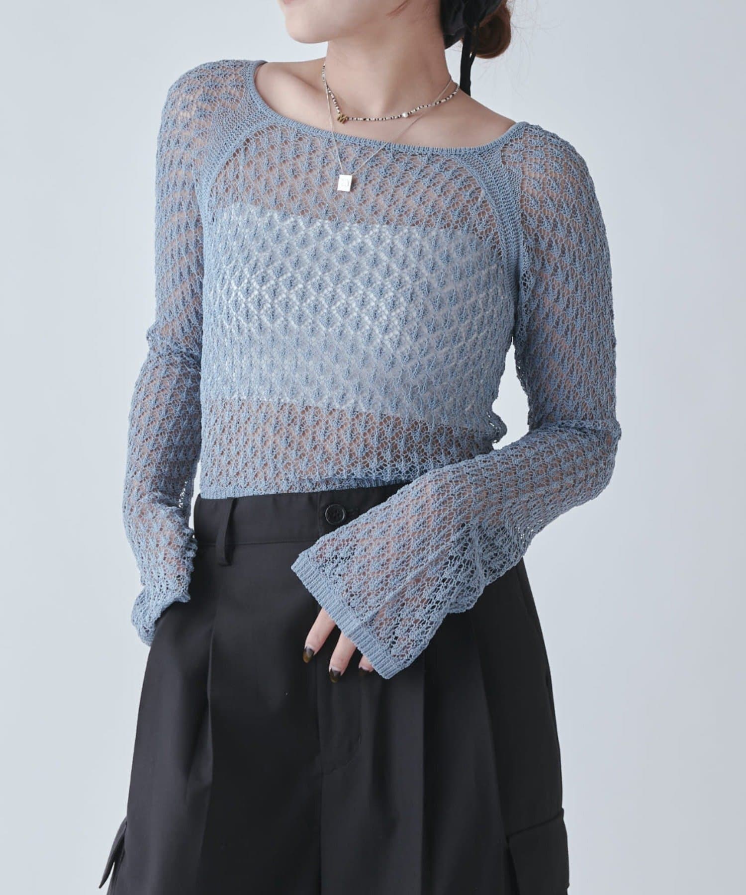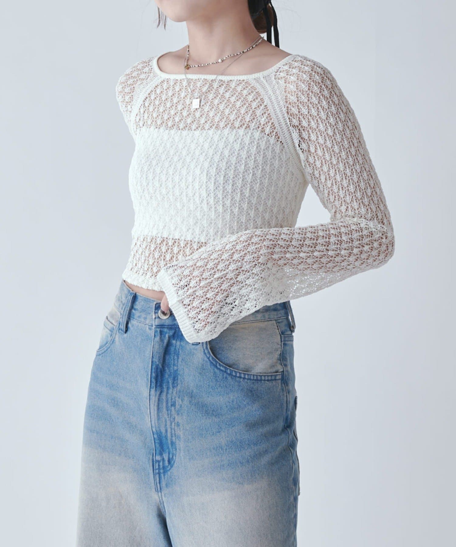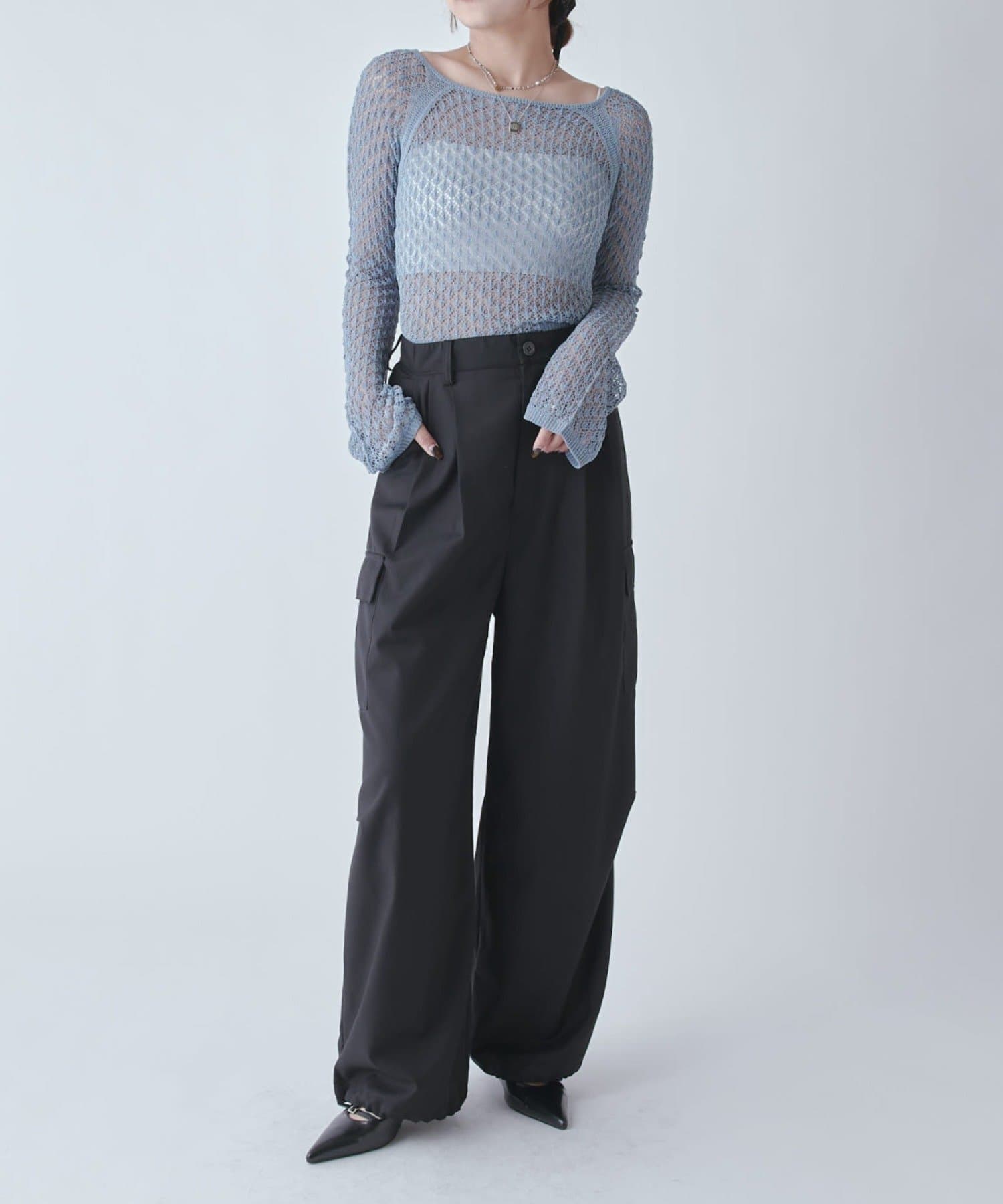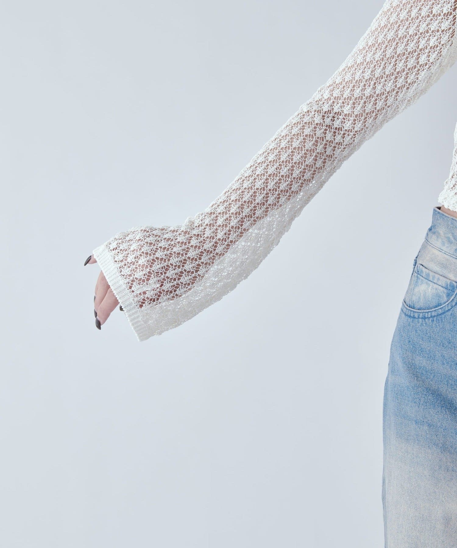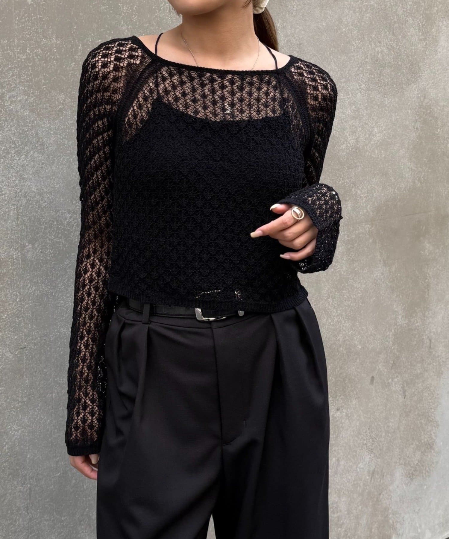 透かし編みデザインが女性らしく、こなれ感を出してくれる一枚。