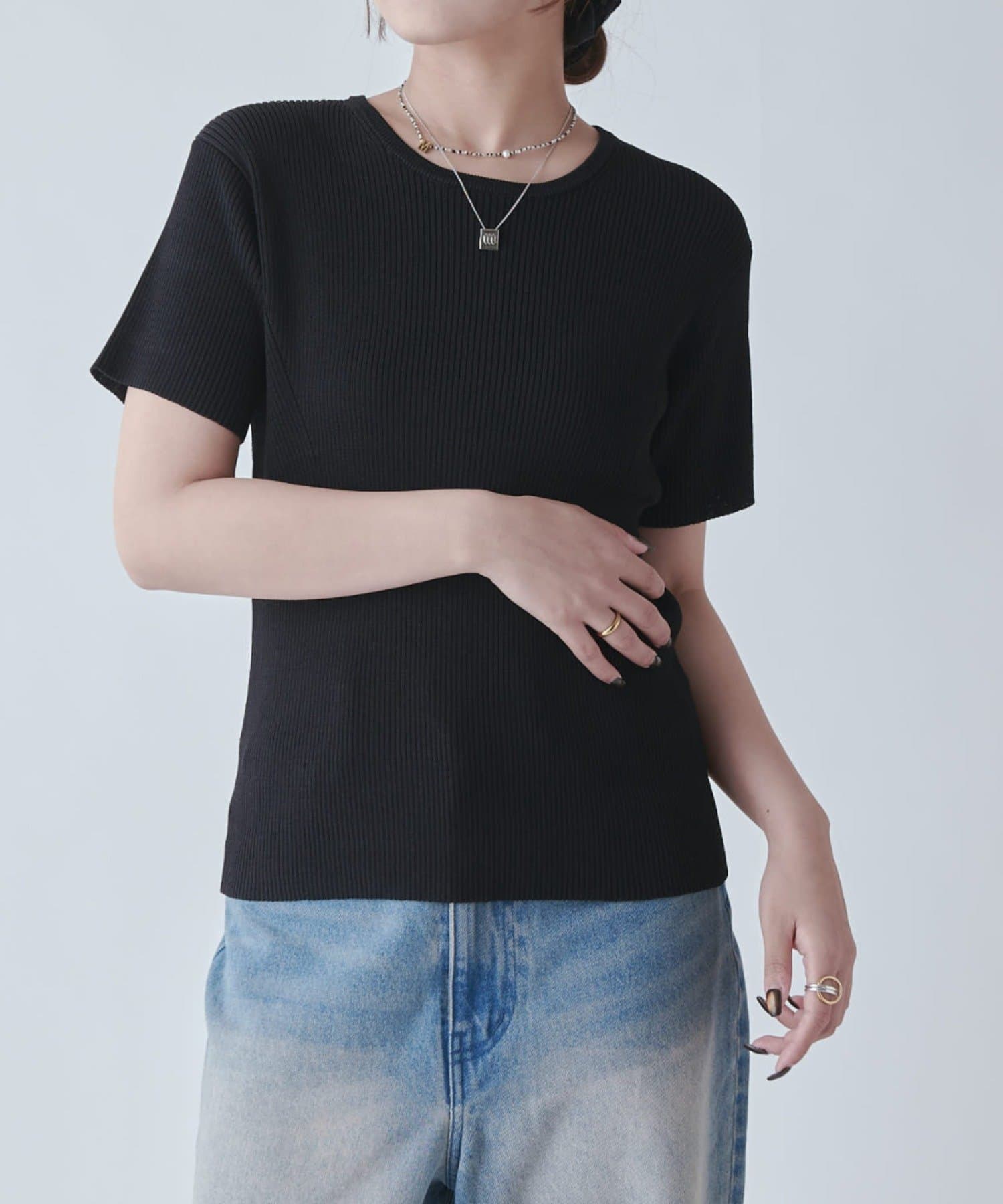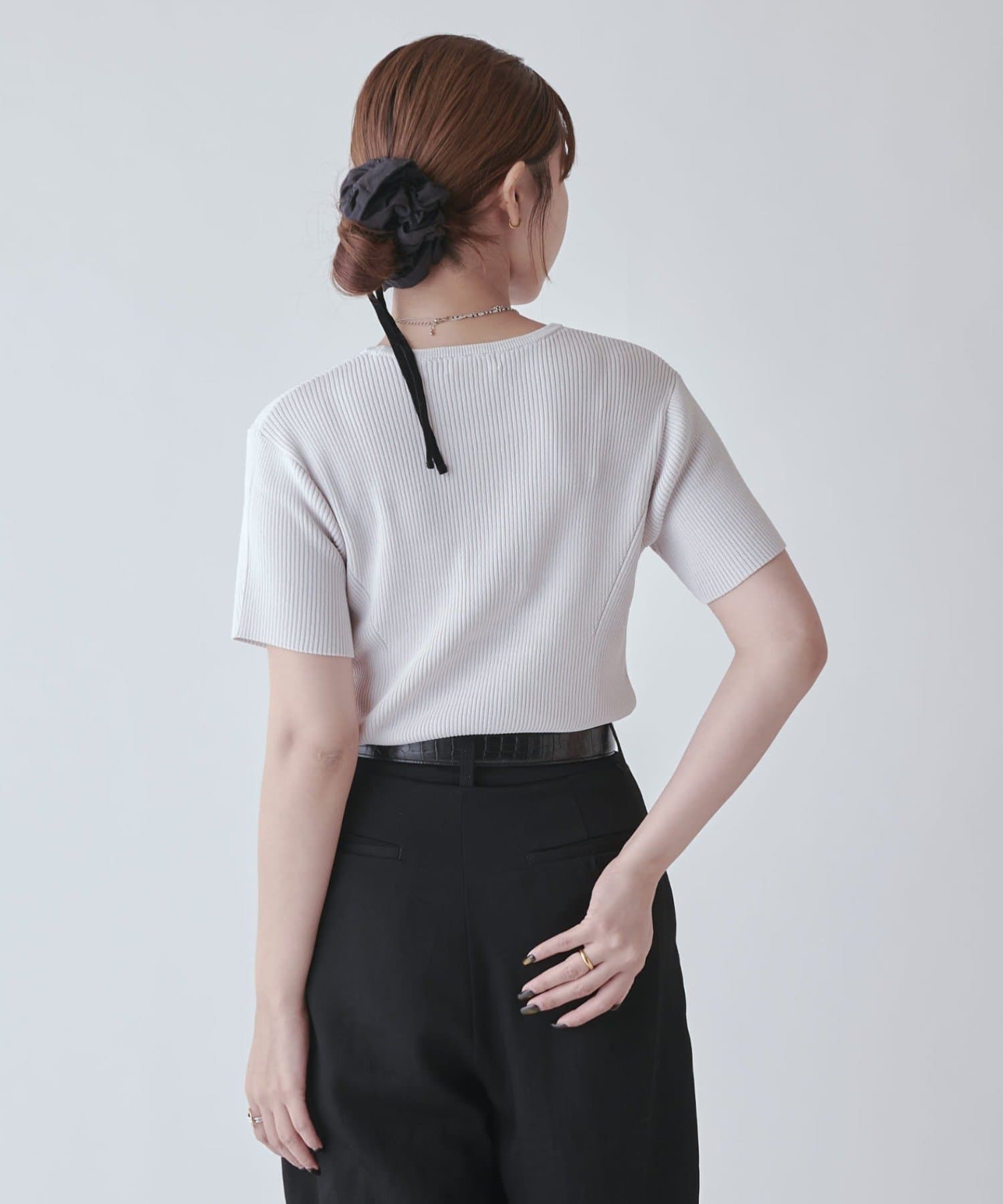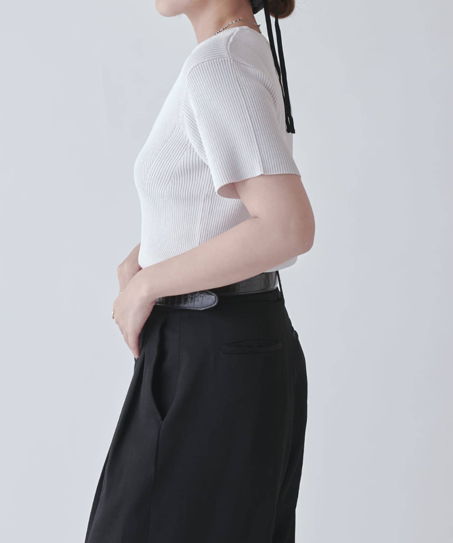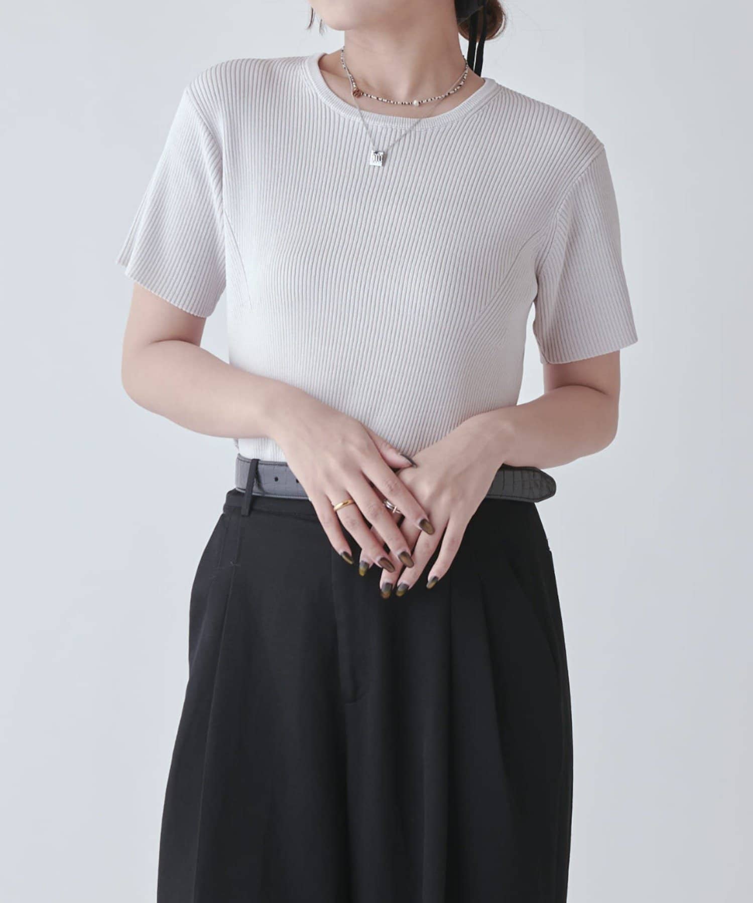 シンプルでありながら、リブ編みが施されたデザインが特徴的なトップス。