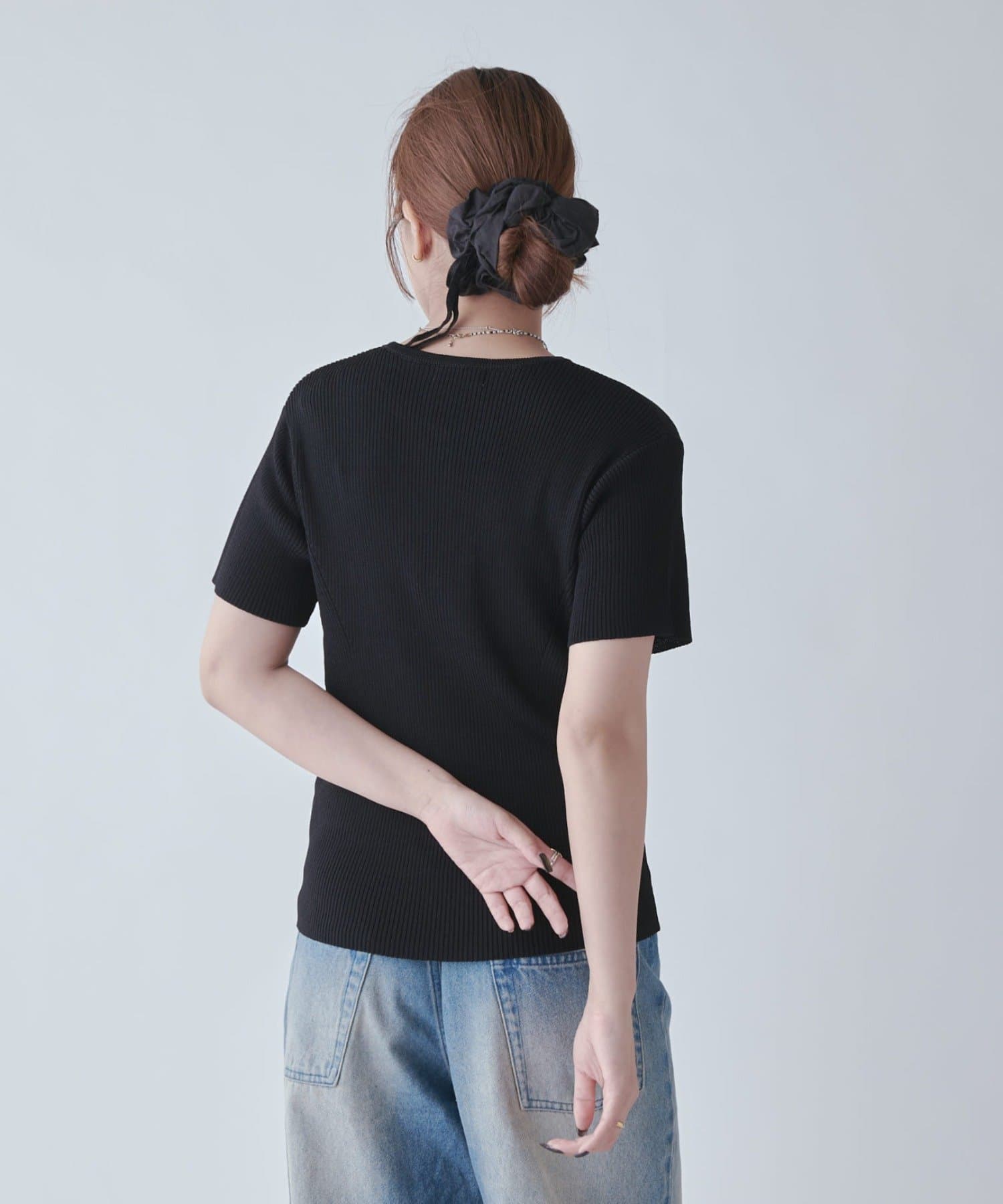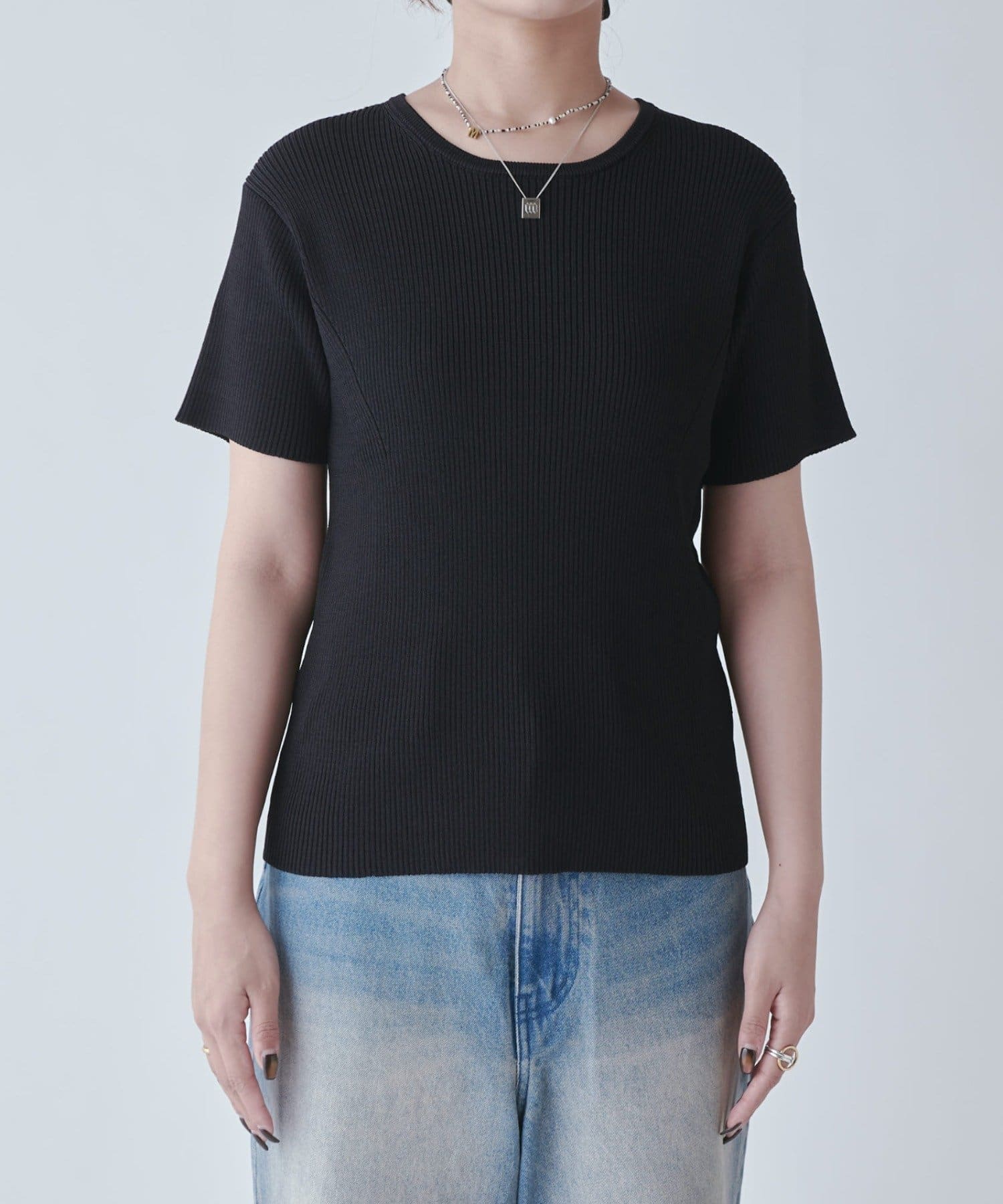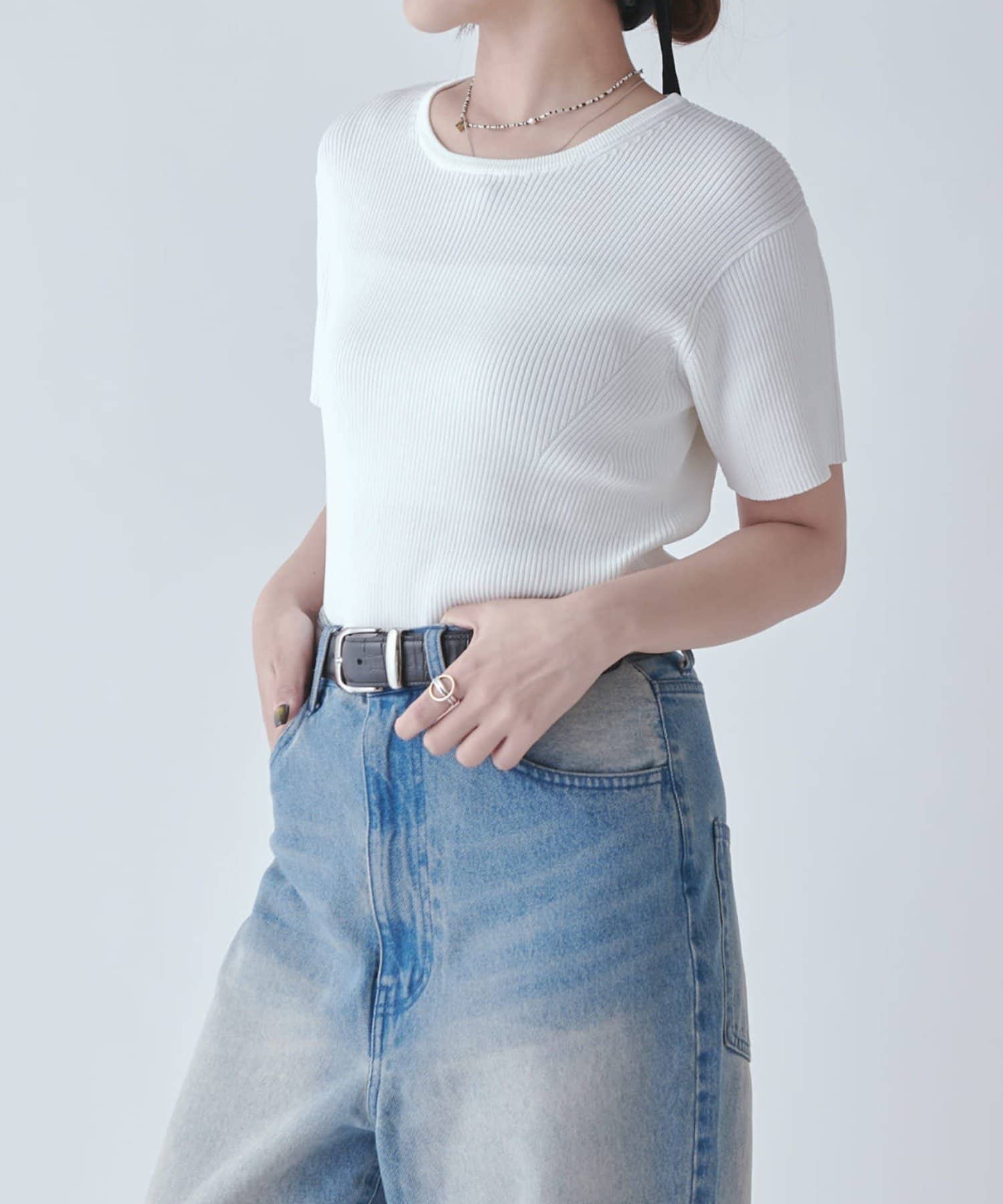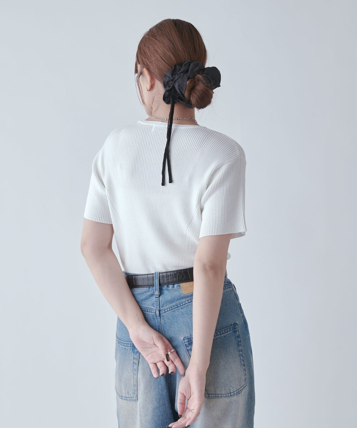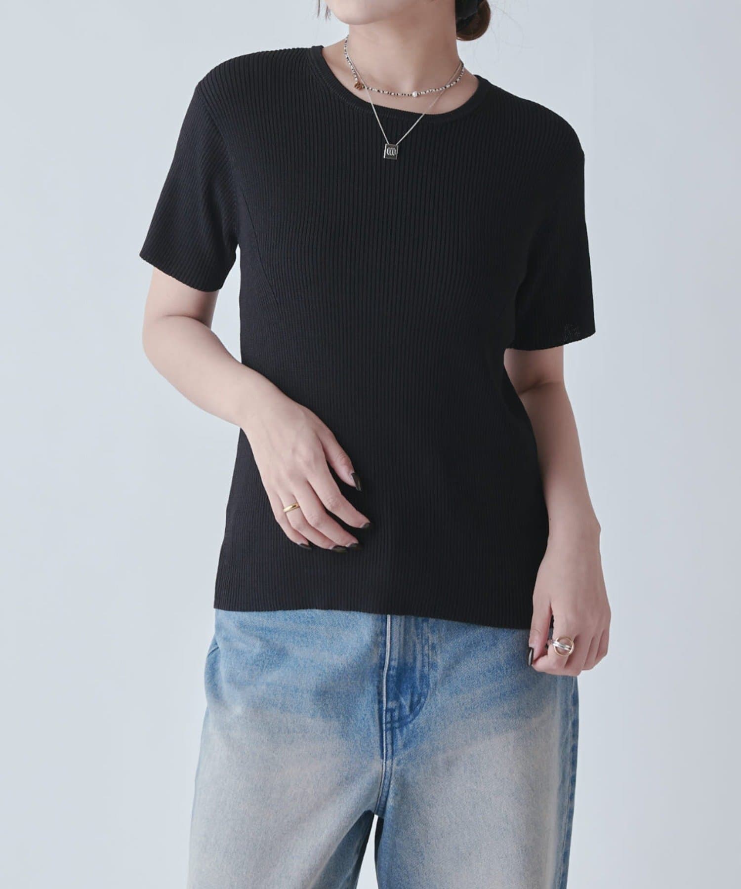 シンプルでありながら、リブ編みが施されたデザインが特徴的なトップス。