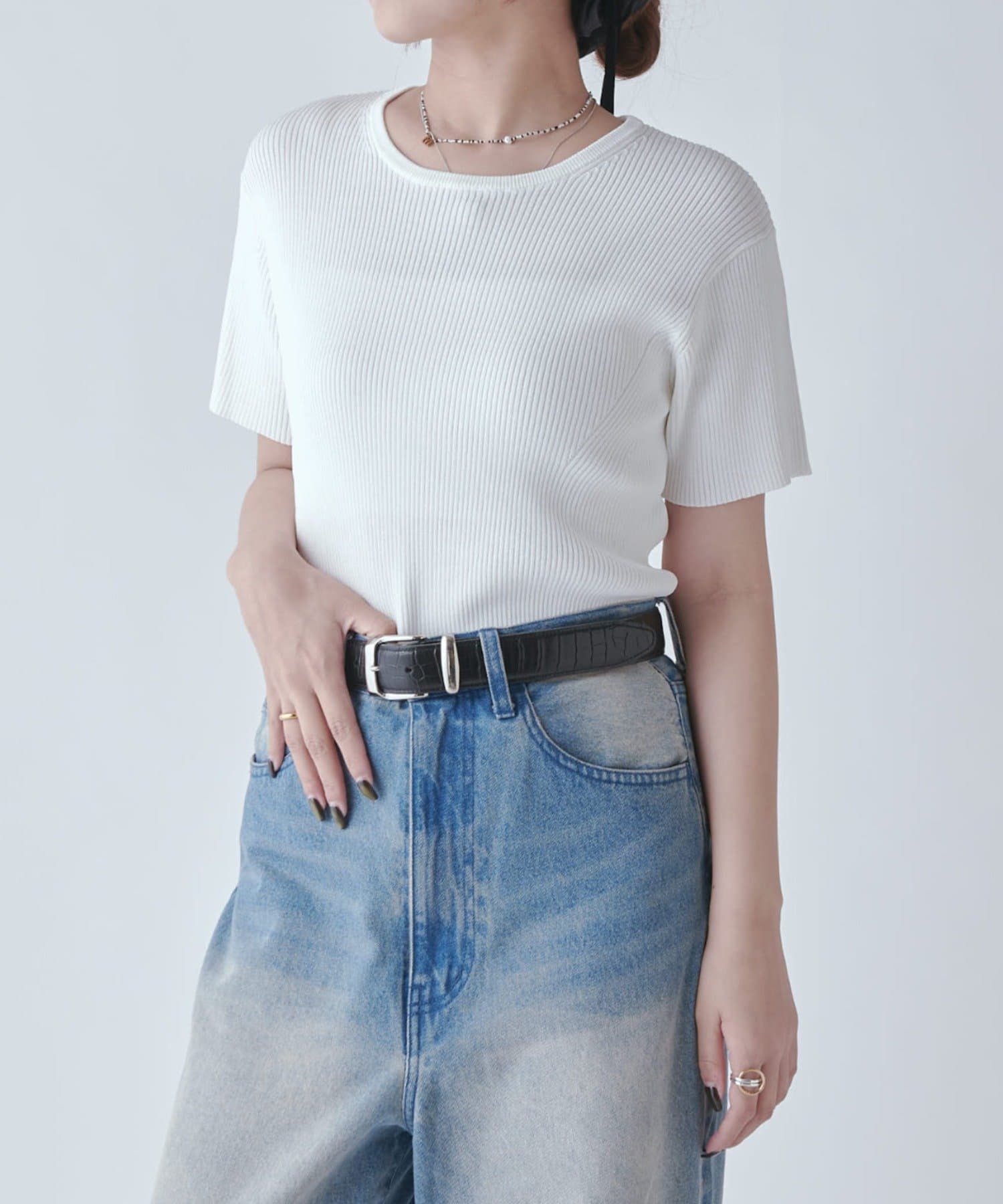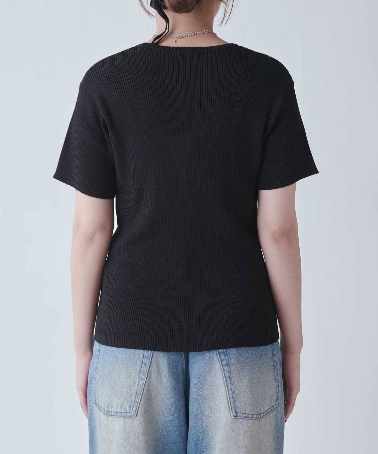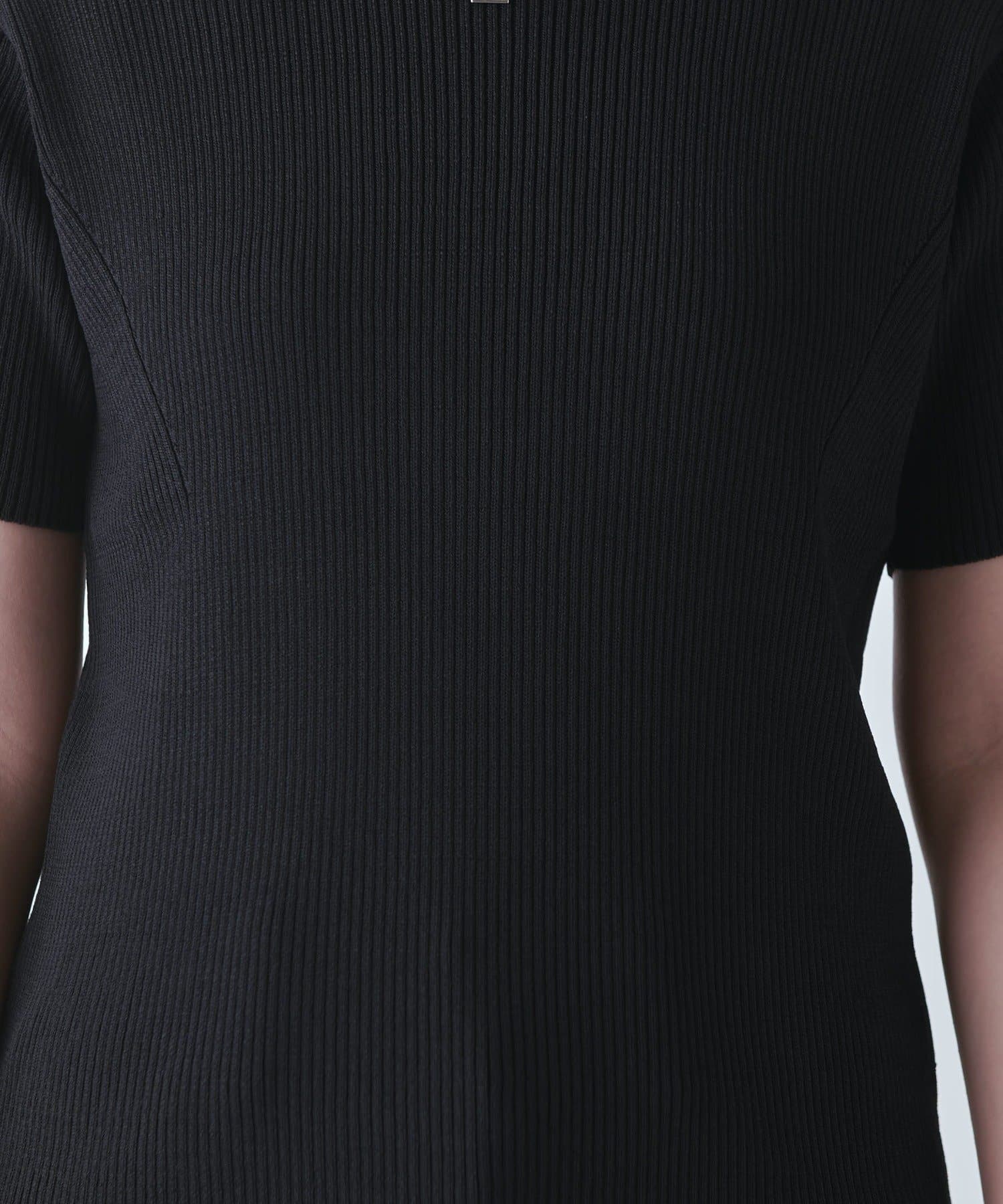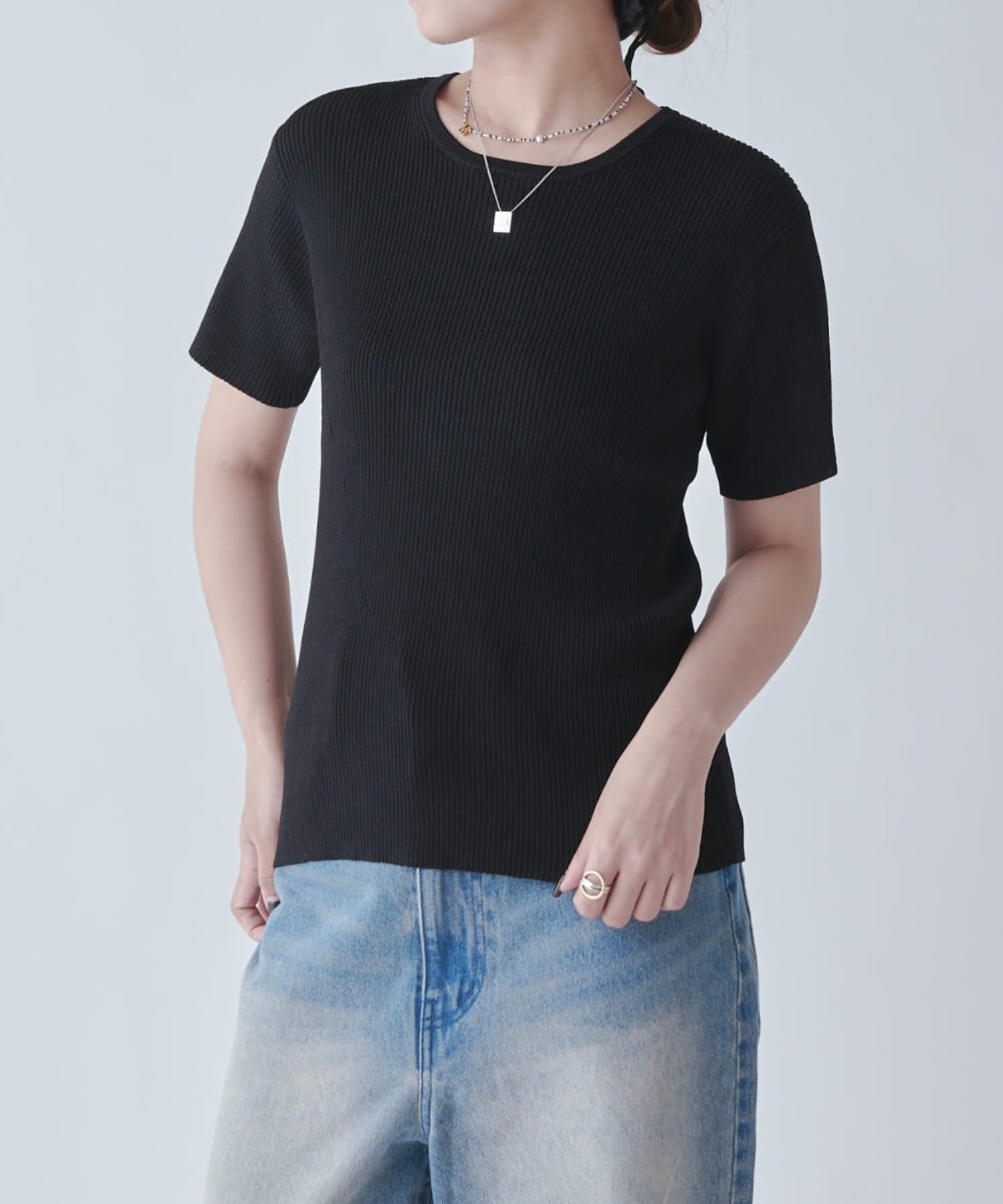 シンプルでありながら、リブ編みが施されたデザインが特徴的なトップス。