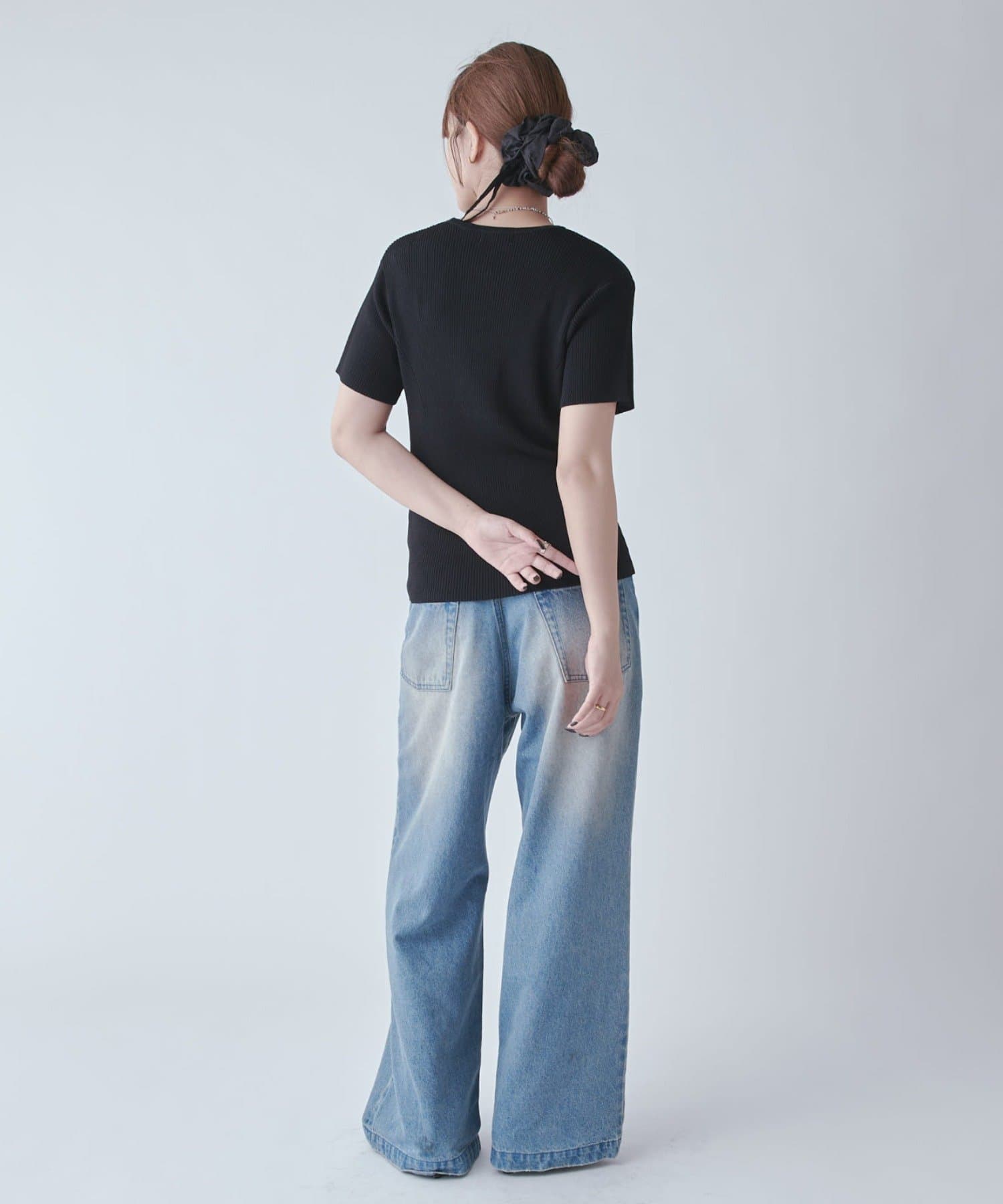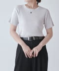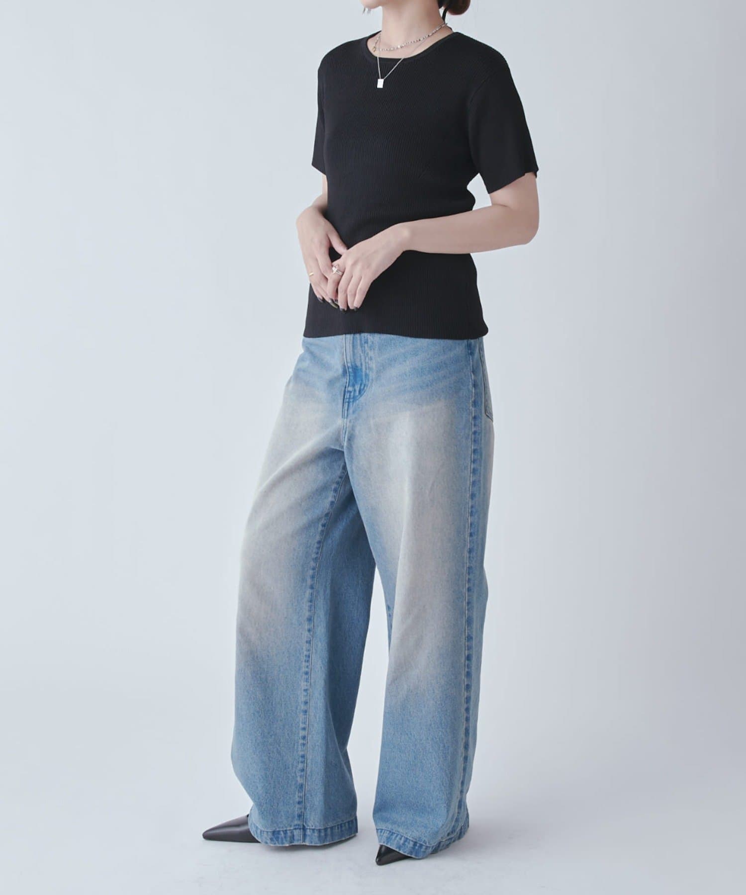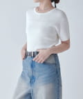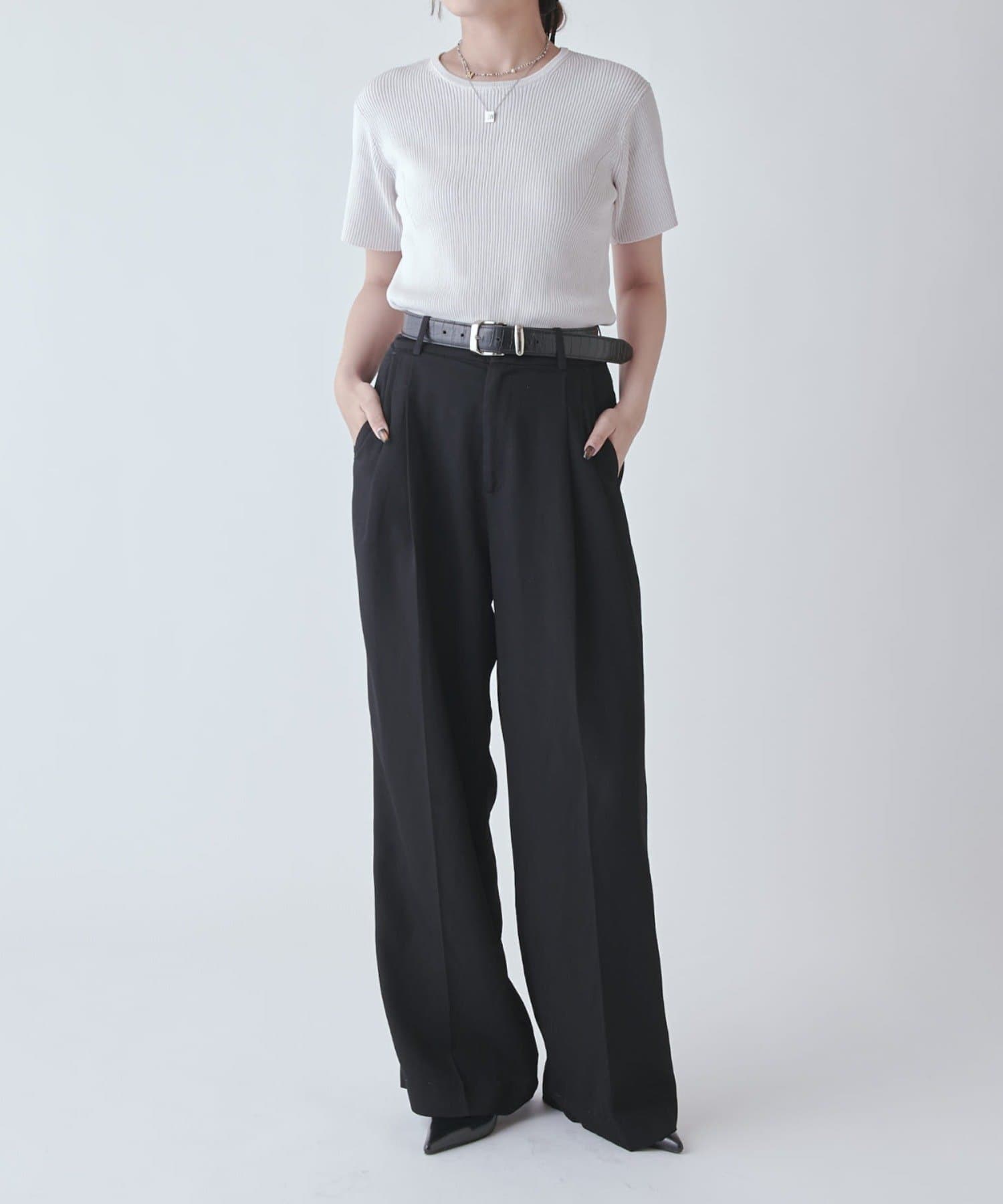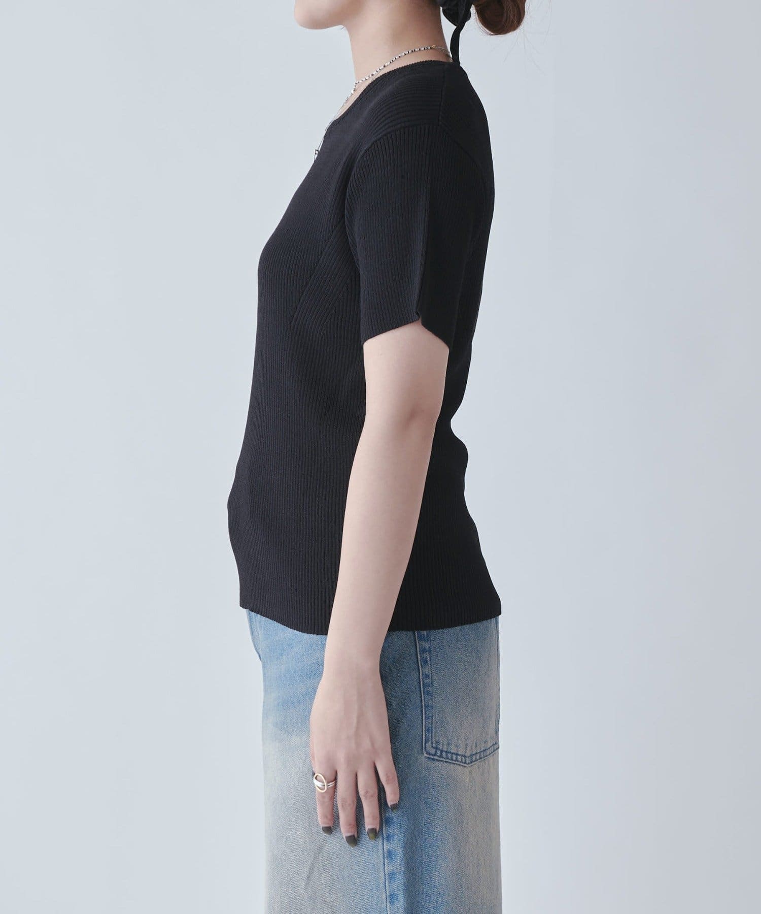 シンプルでありながら、リブ編みが施されたデザインが特徴的なトップス。