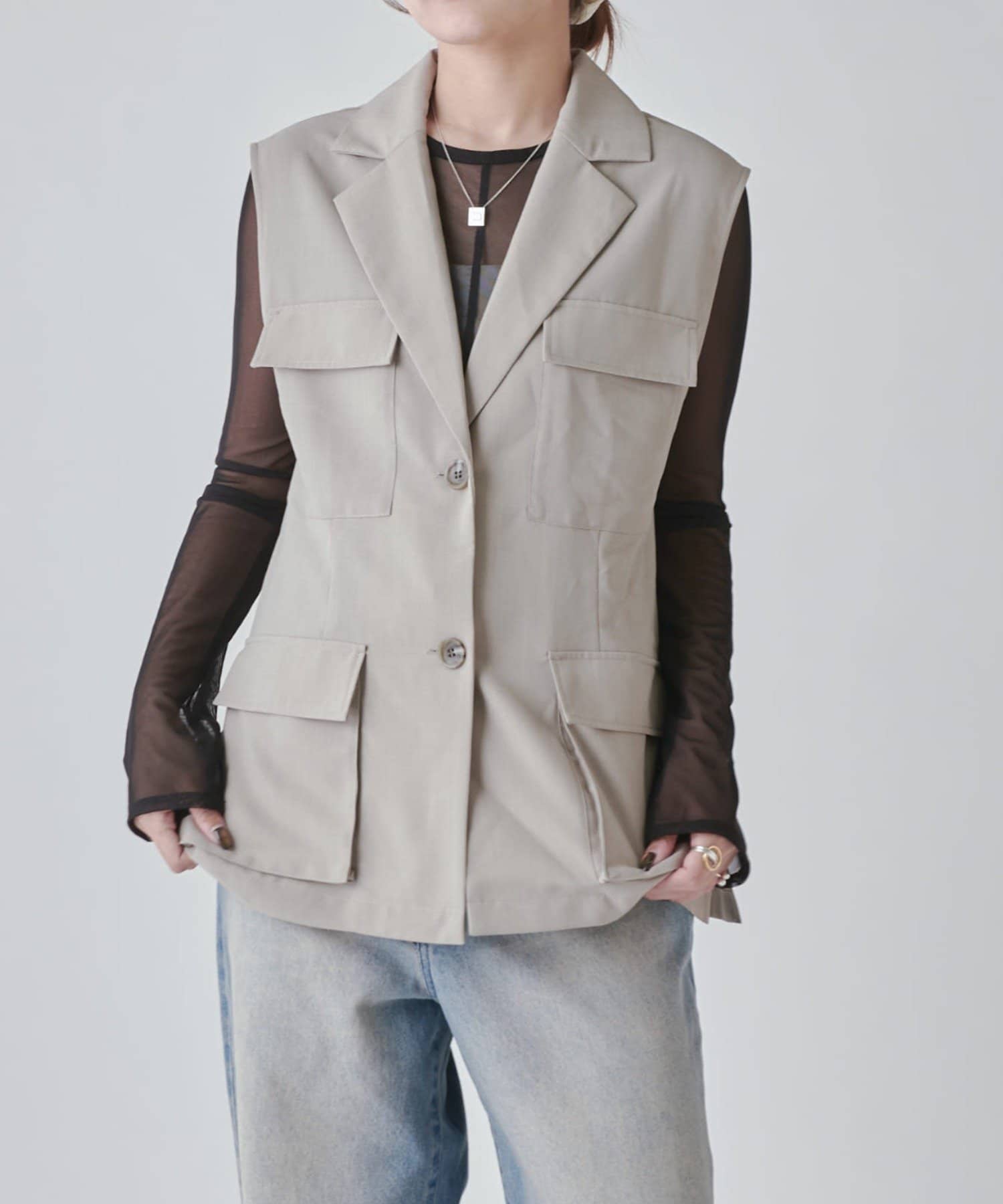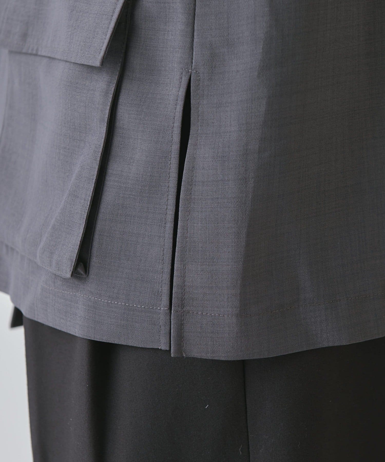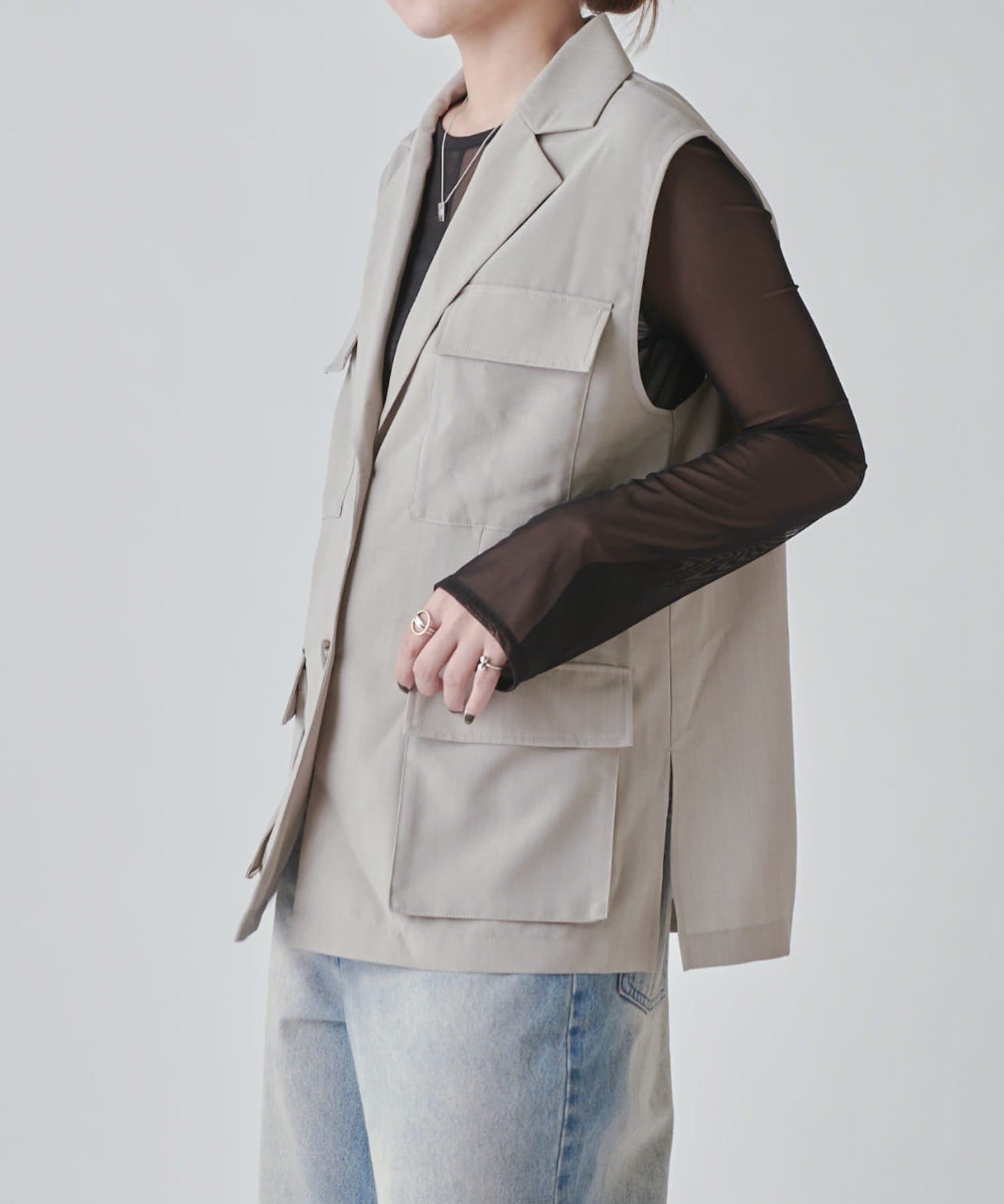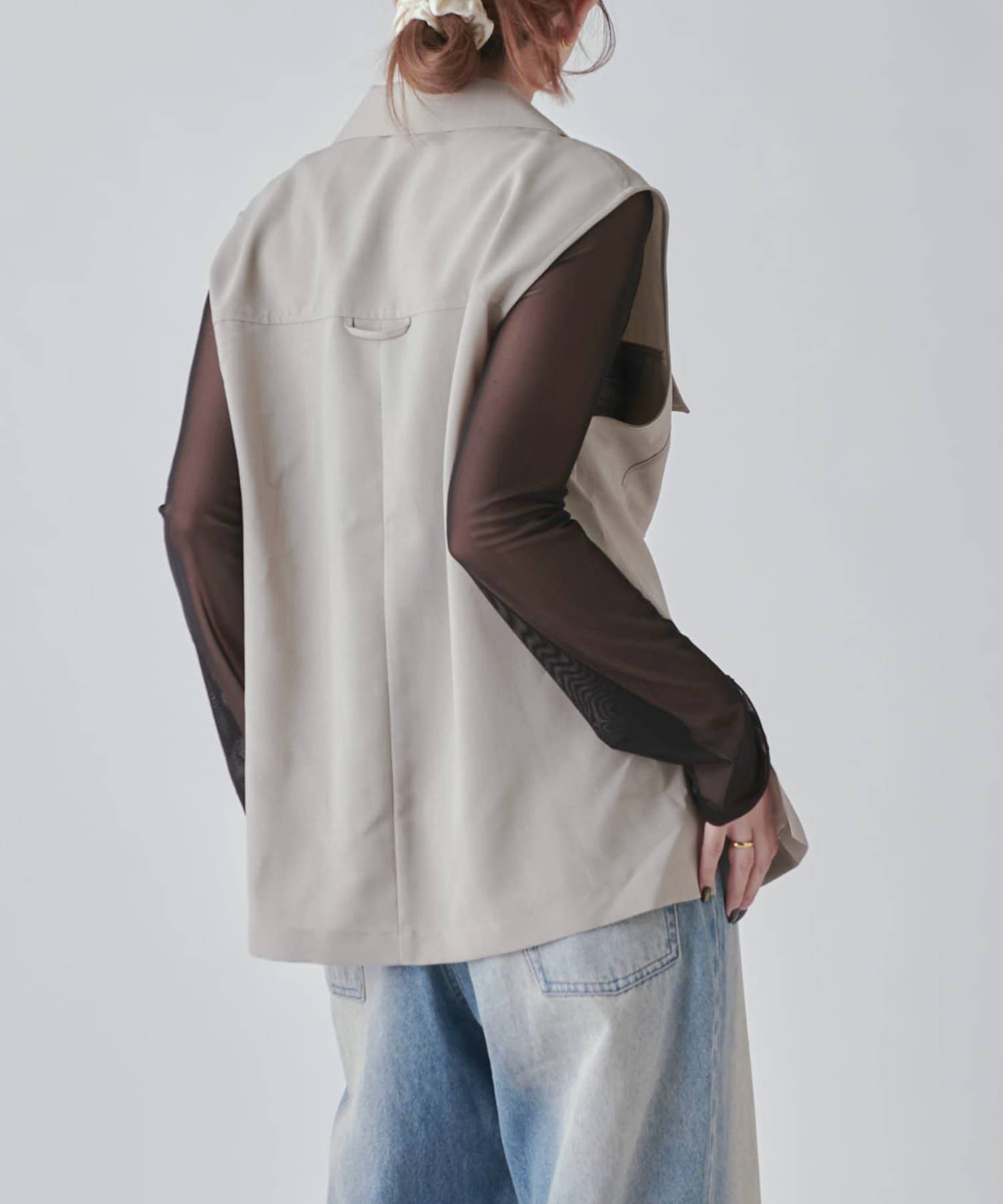 ダブルポケットが特徴的で、薄手で透け感があるので夏も重ね着を楽しめるアイテム。