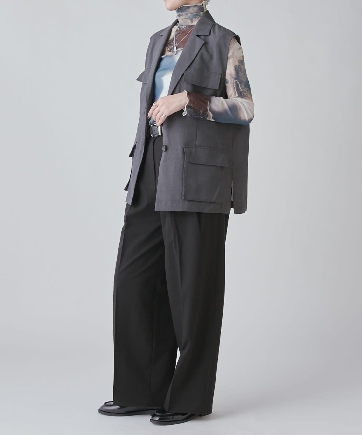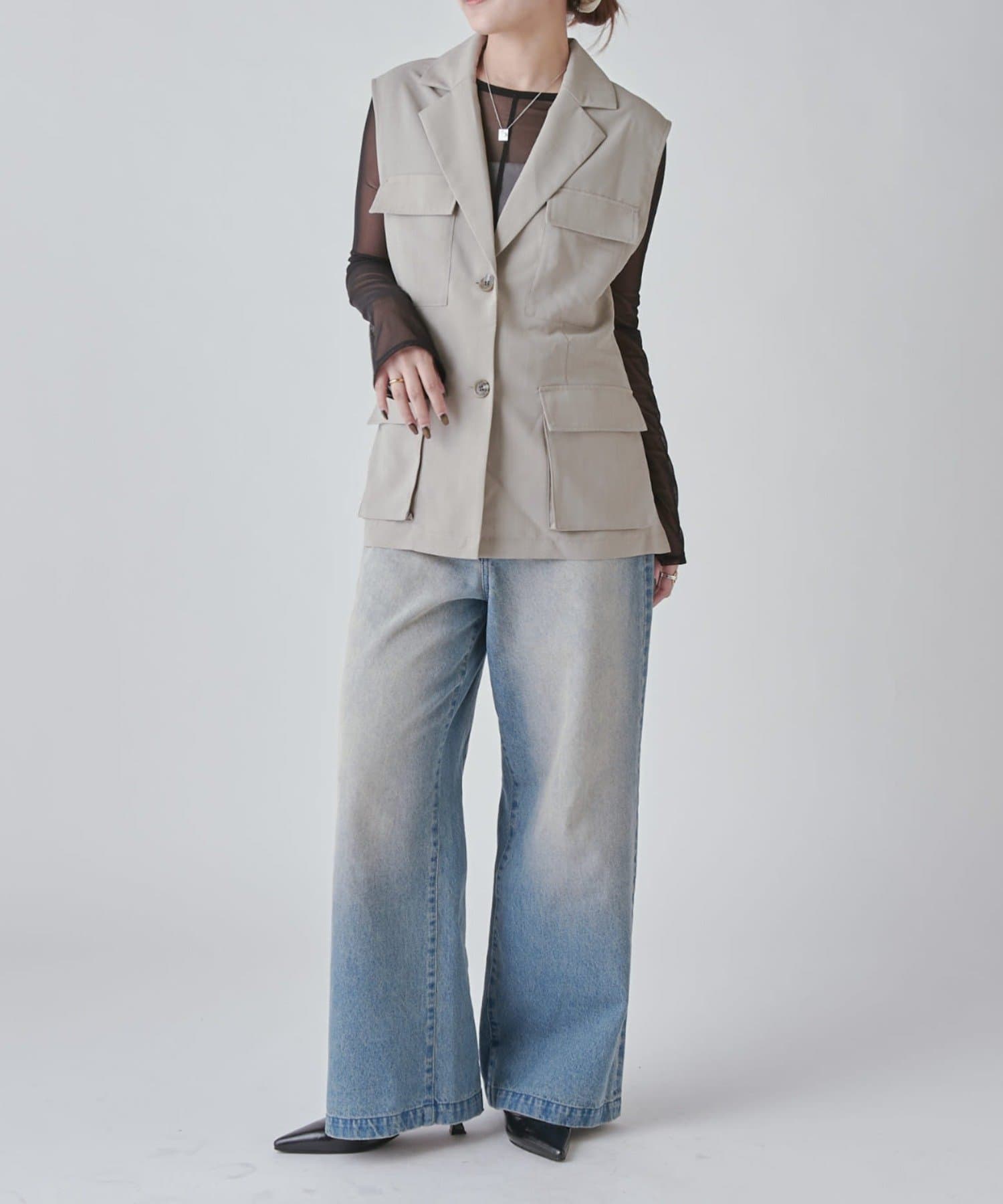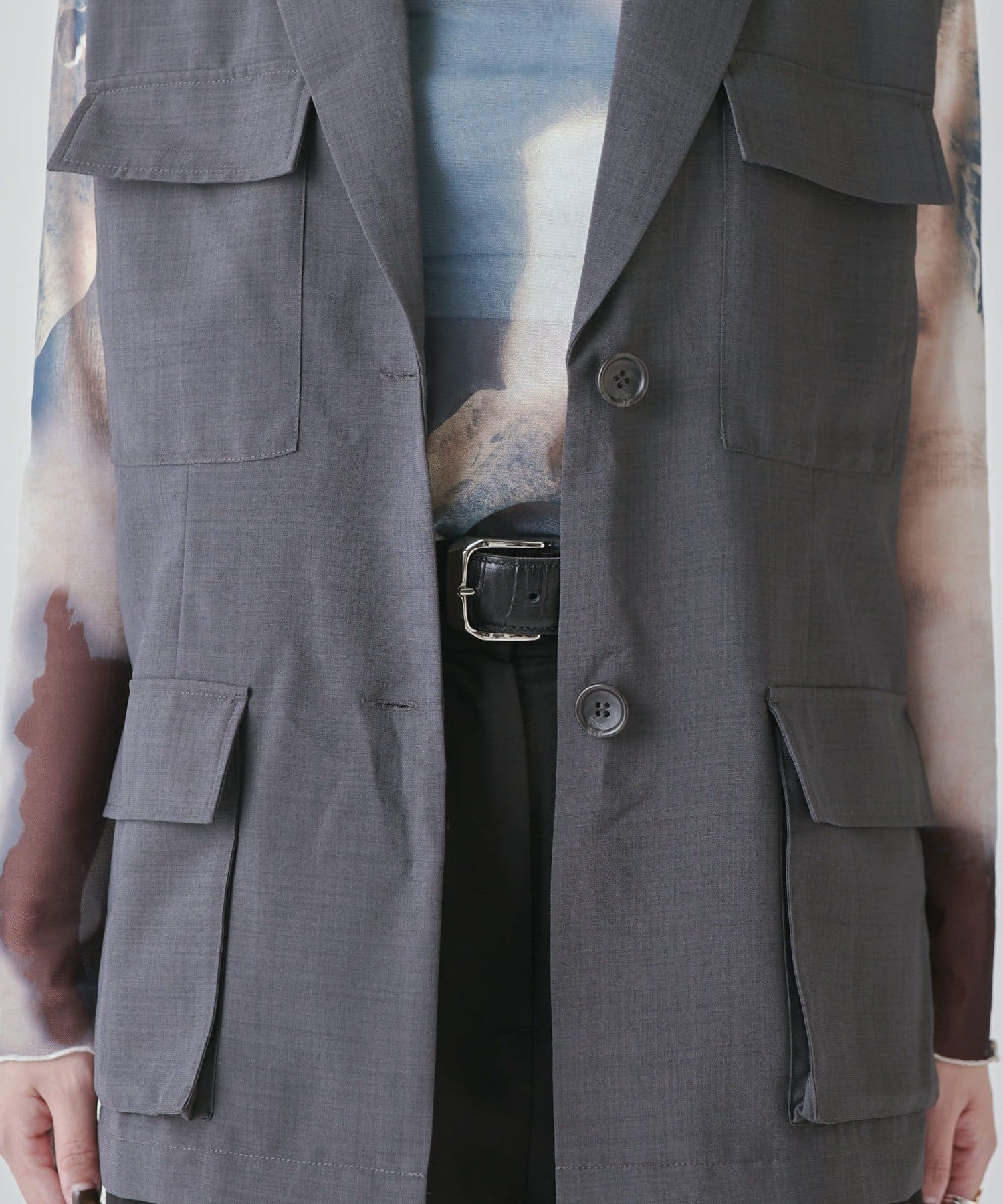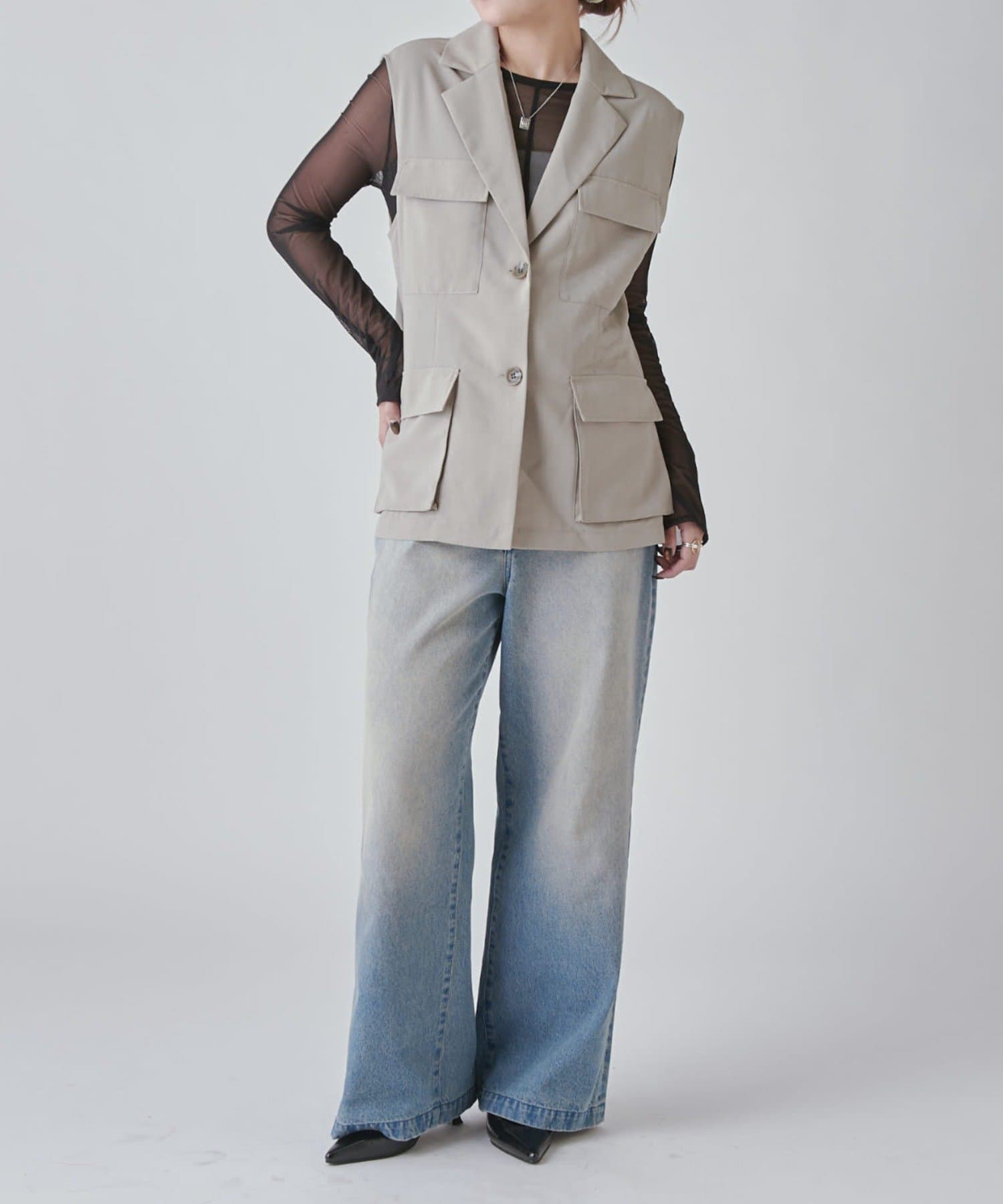 ダブルポケットが特徴的で、薄手で透け感があるので夏も重ね着を楽しめるアイテム。