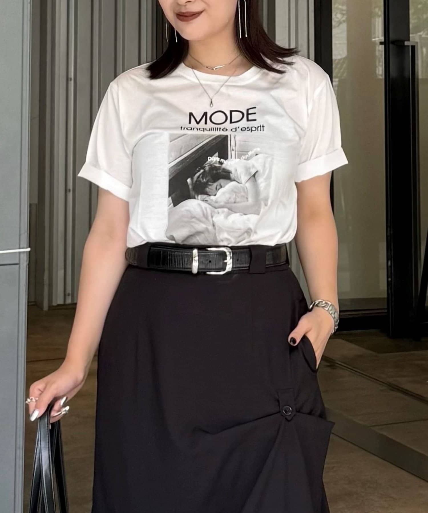 一枚で、タックインとベルトでシンプルながらも大人なかっこいいスタイリングも良いですし