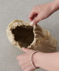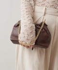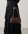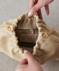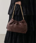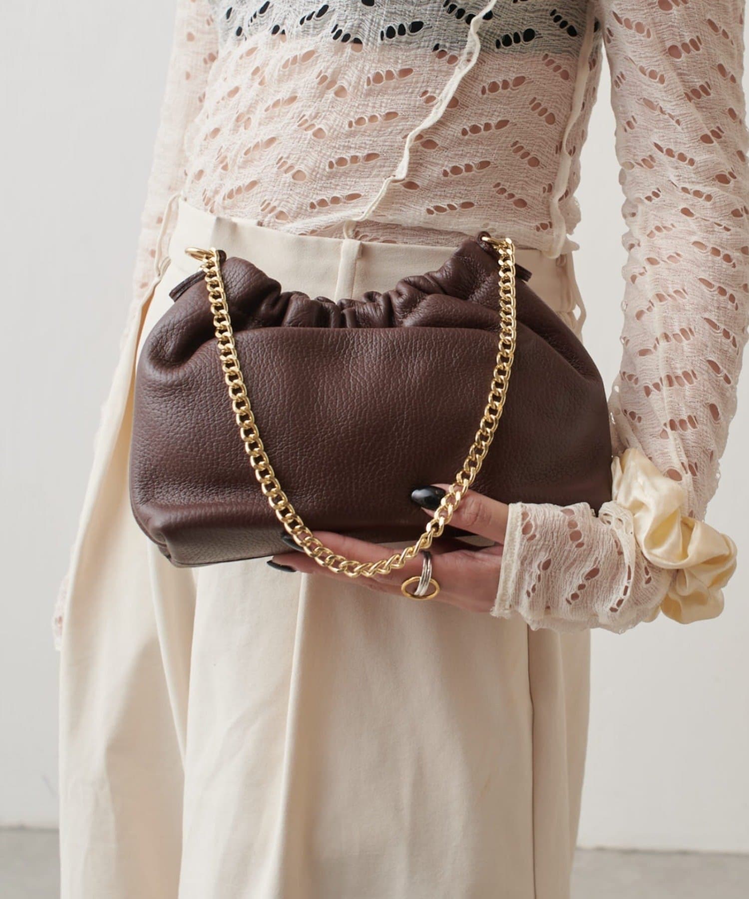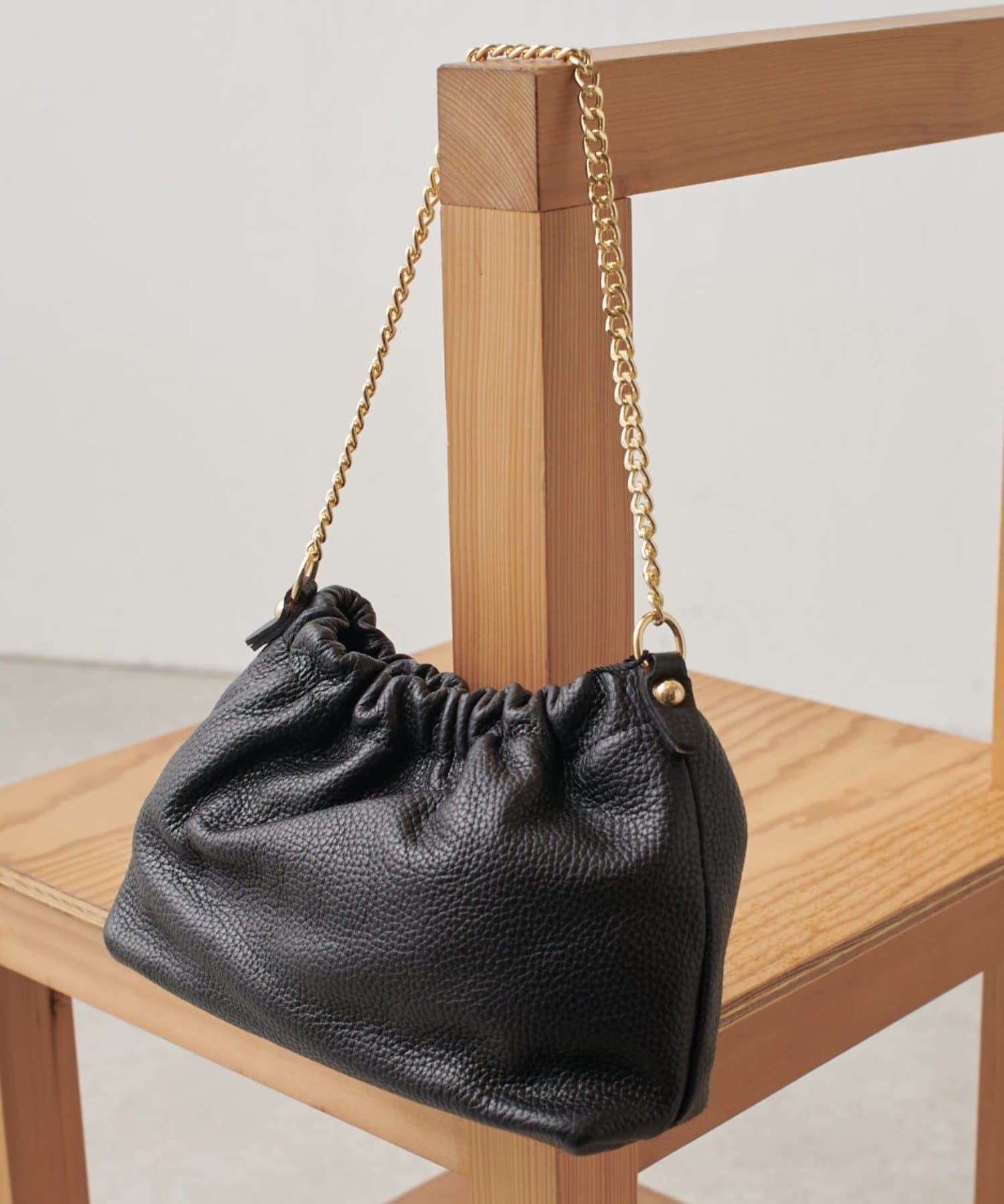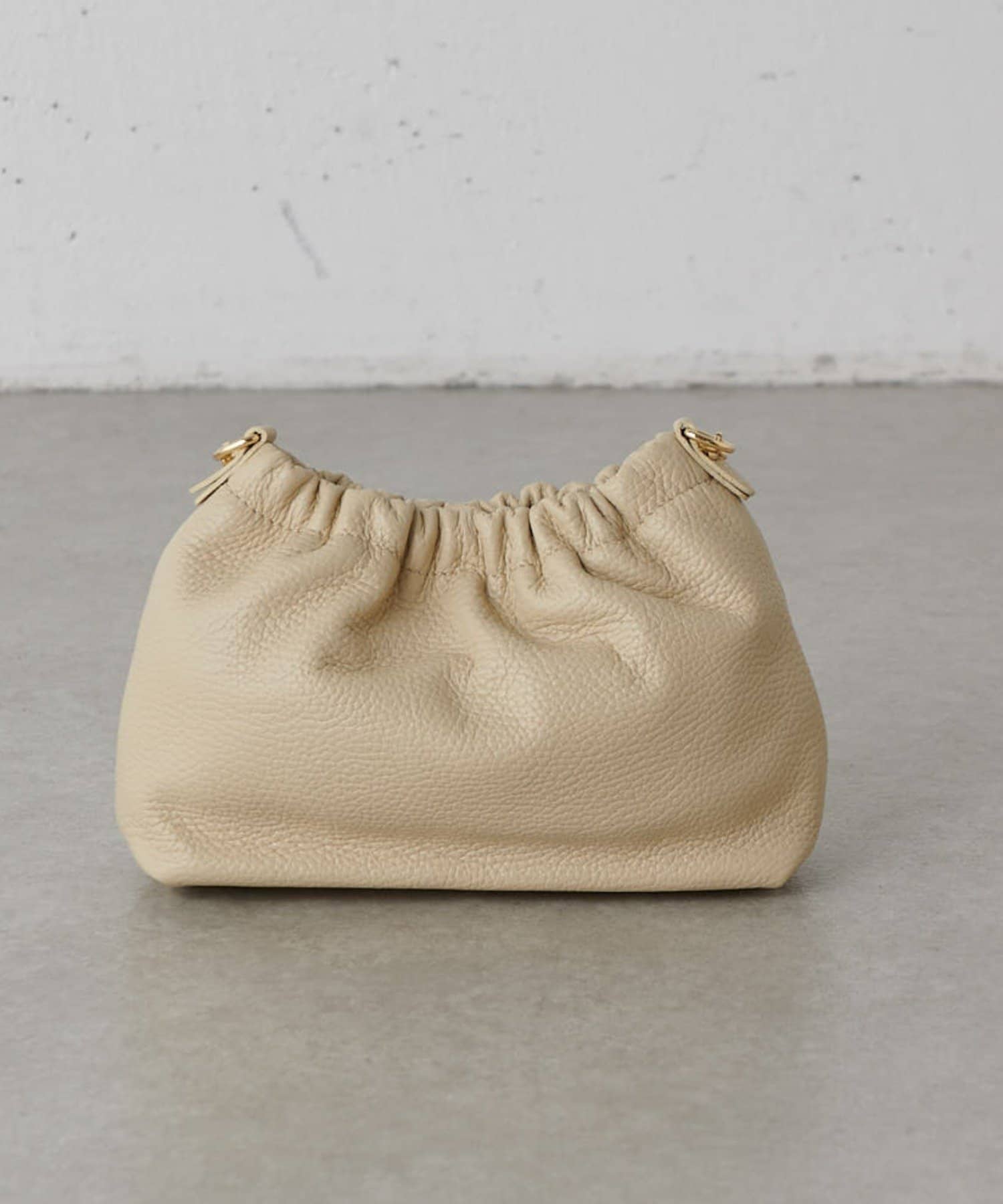 巾着ようなギャザーの入った丸いシルエットがかわいらしいレザーバッグ。