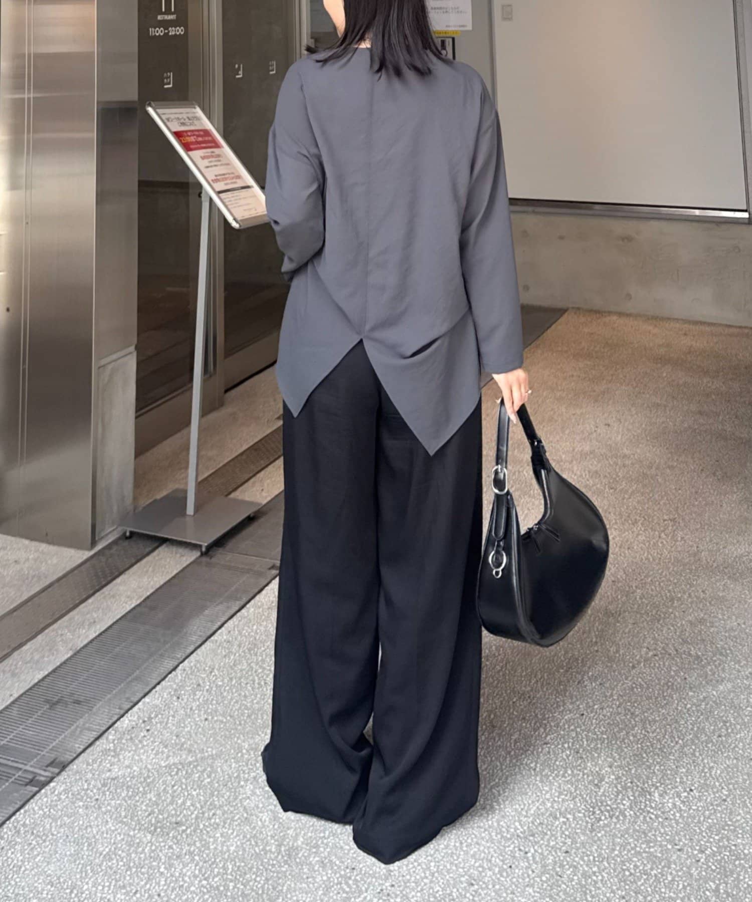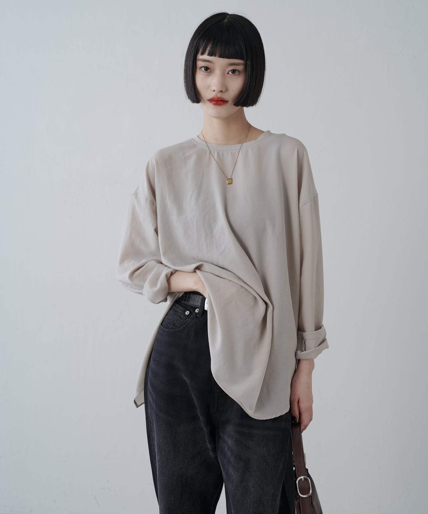 バックデザインが特徴的で、Tシャツのように楽に着れるキレイめブラウス。