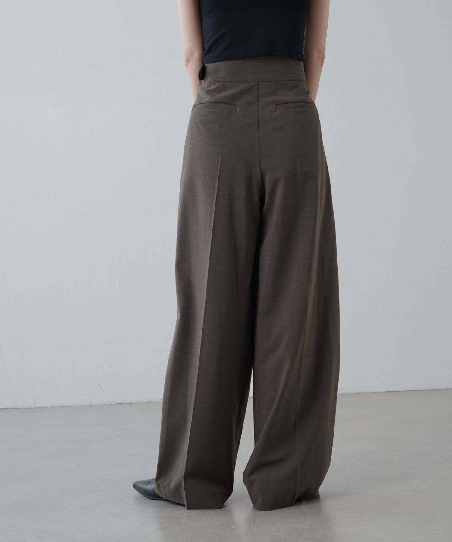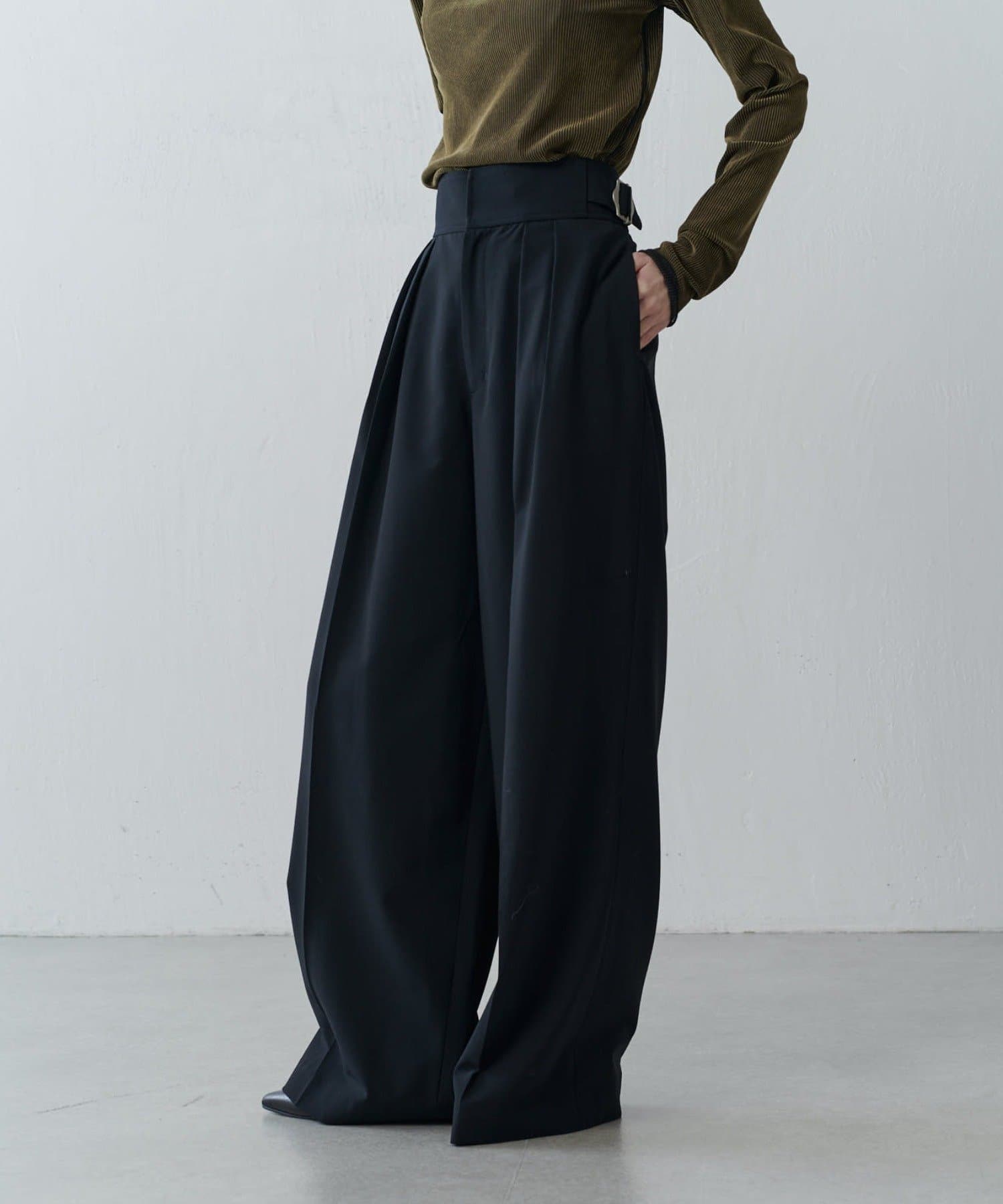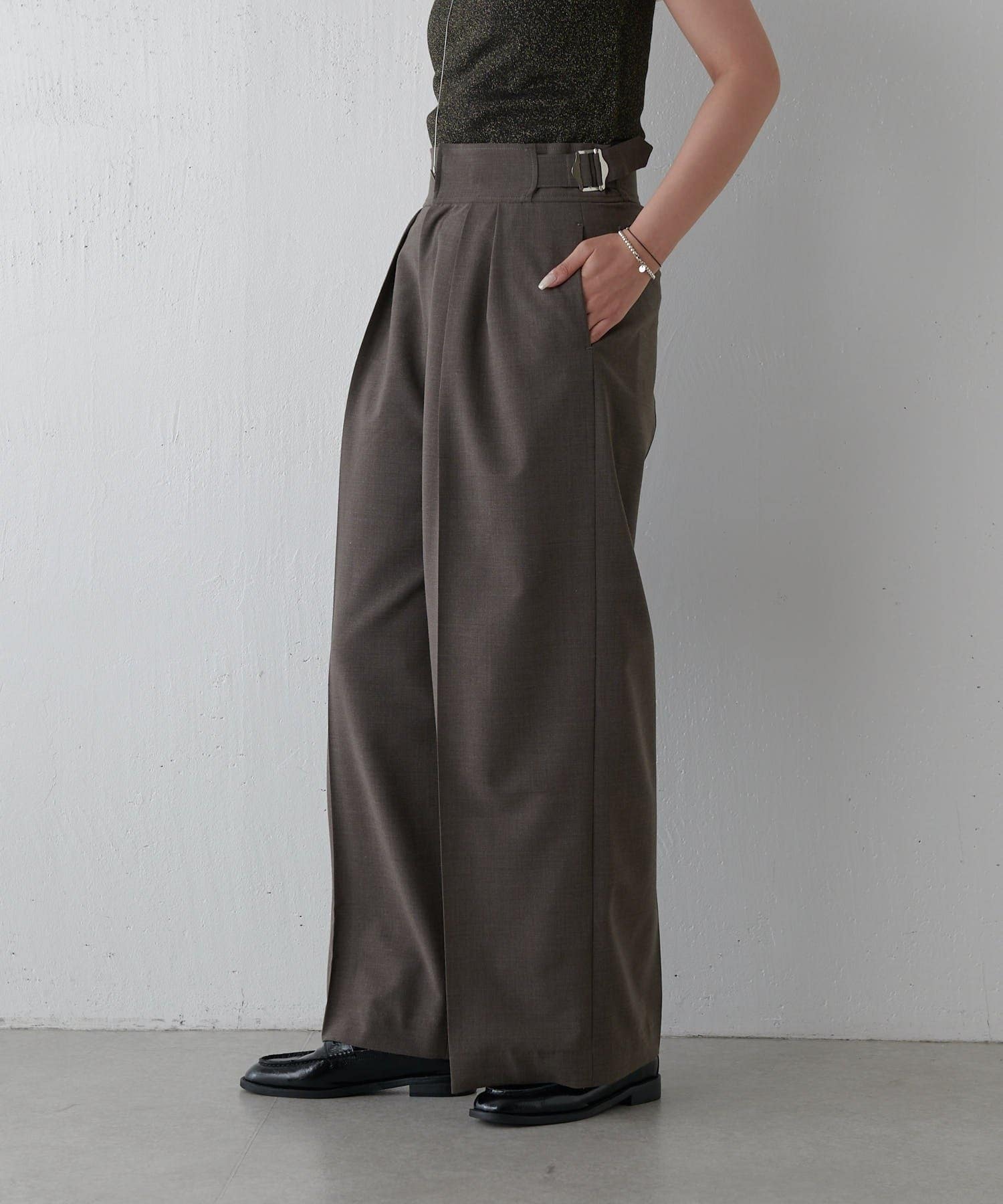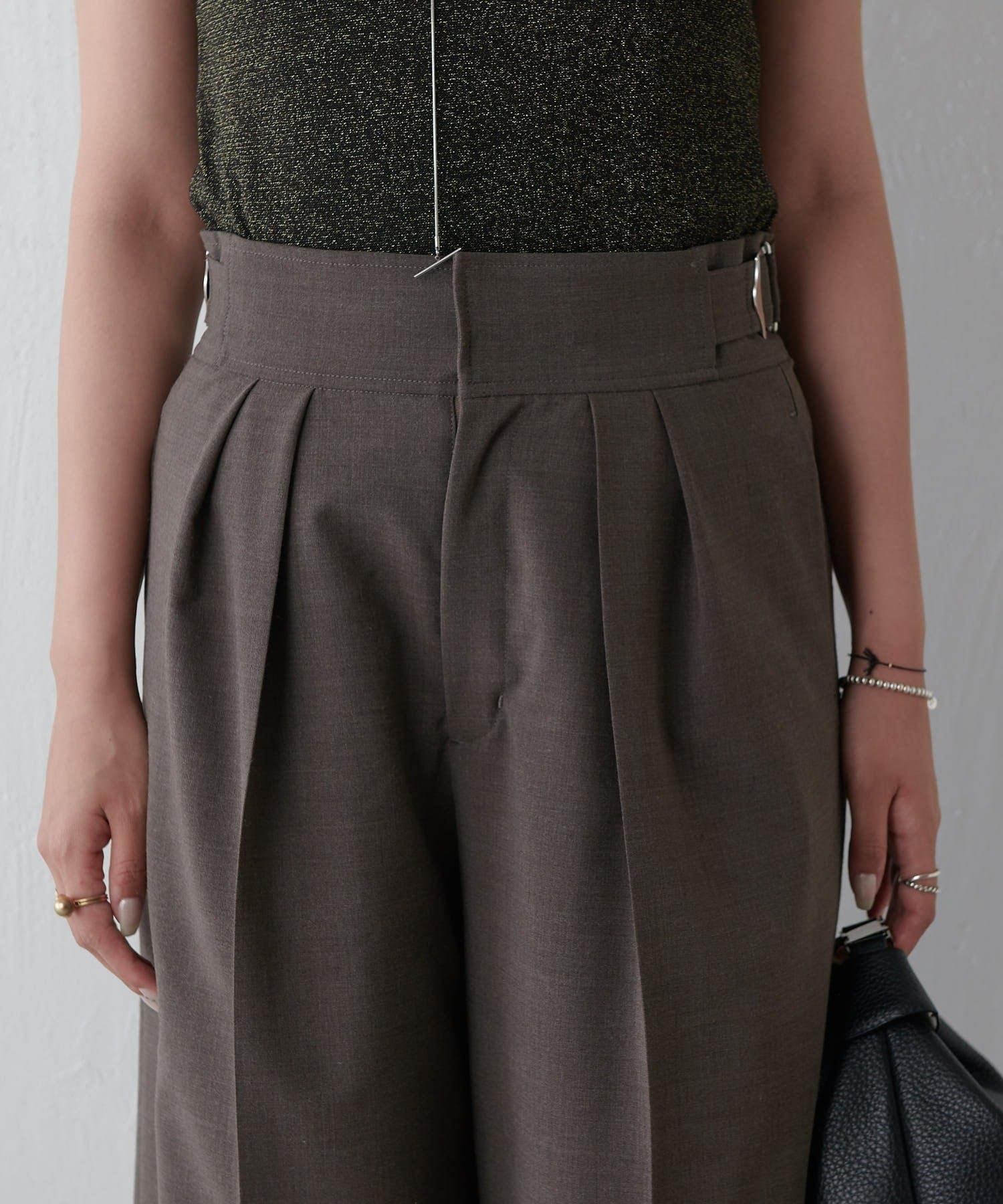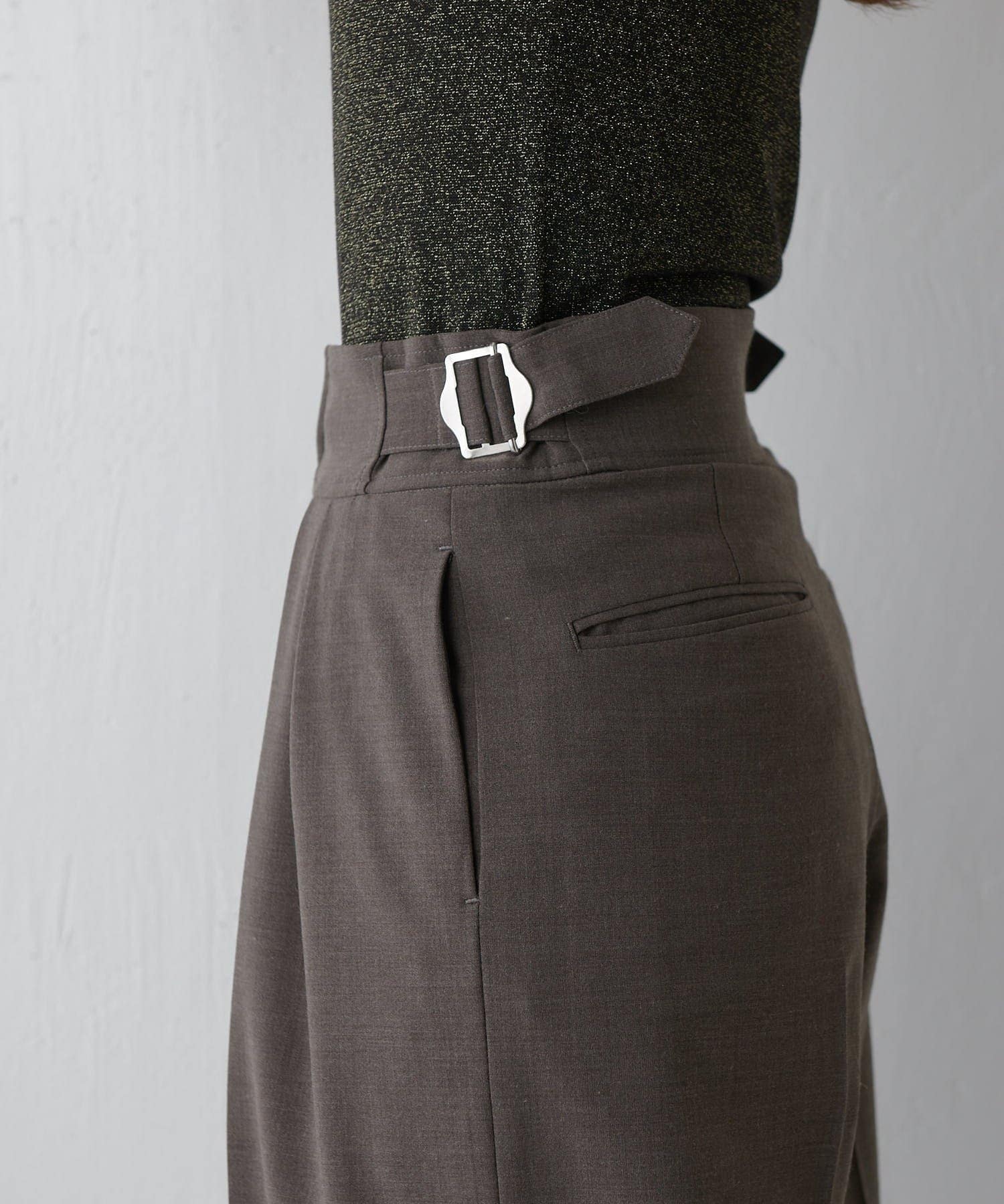 ウエストにタックが入っていて、腰回りにベルトが付いているのでウエストマークができるパンツです。