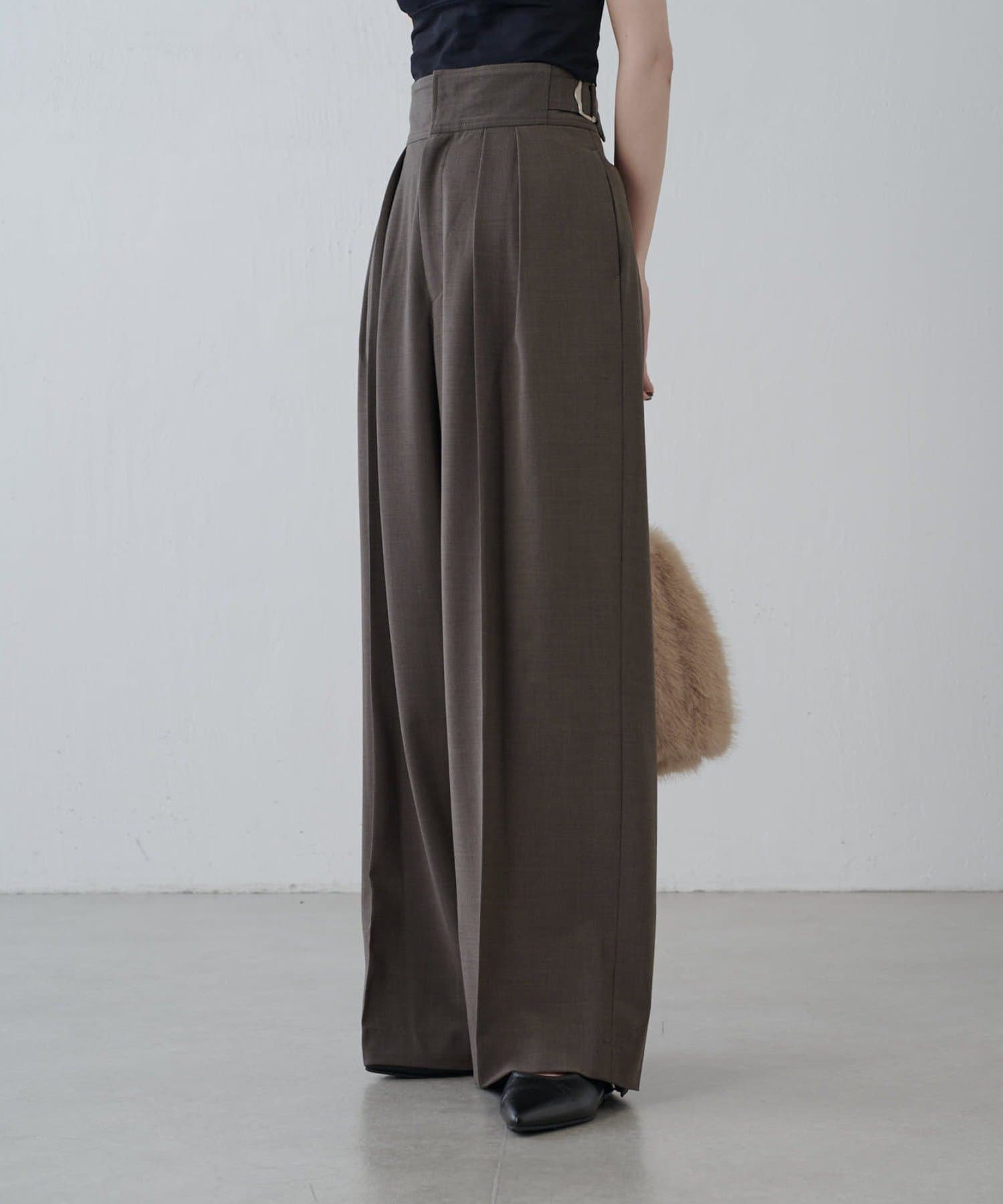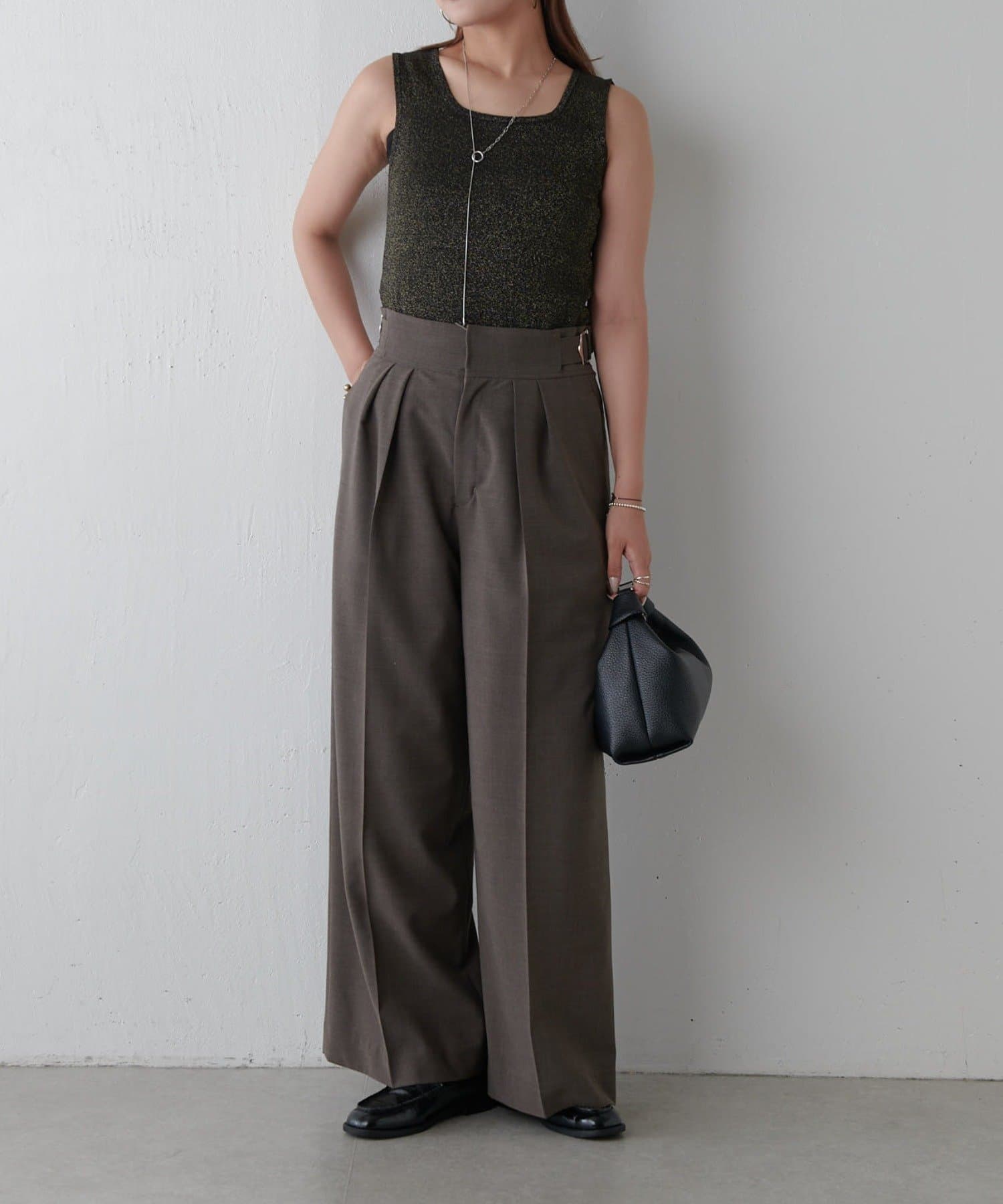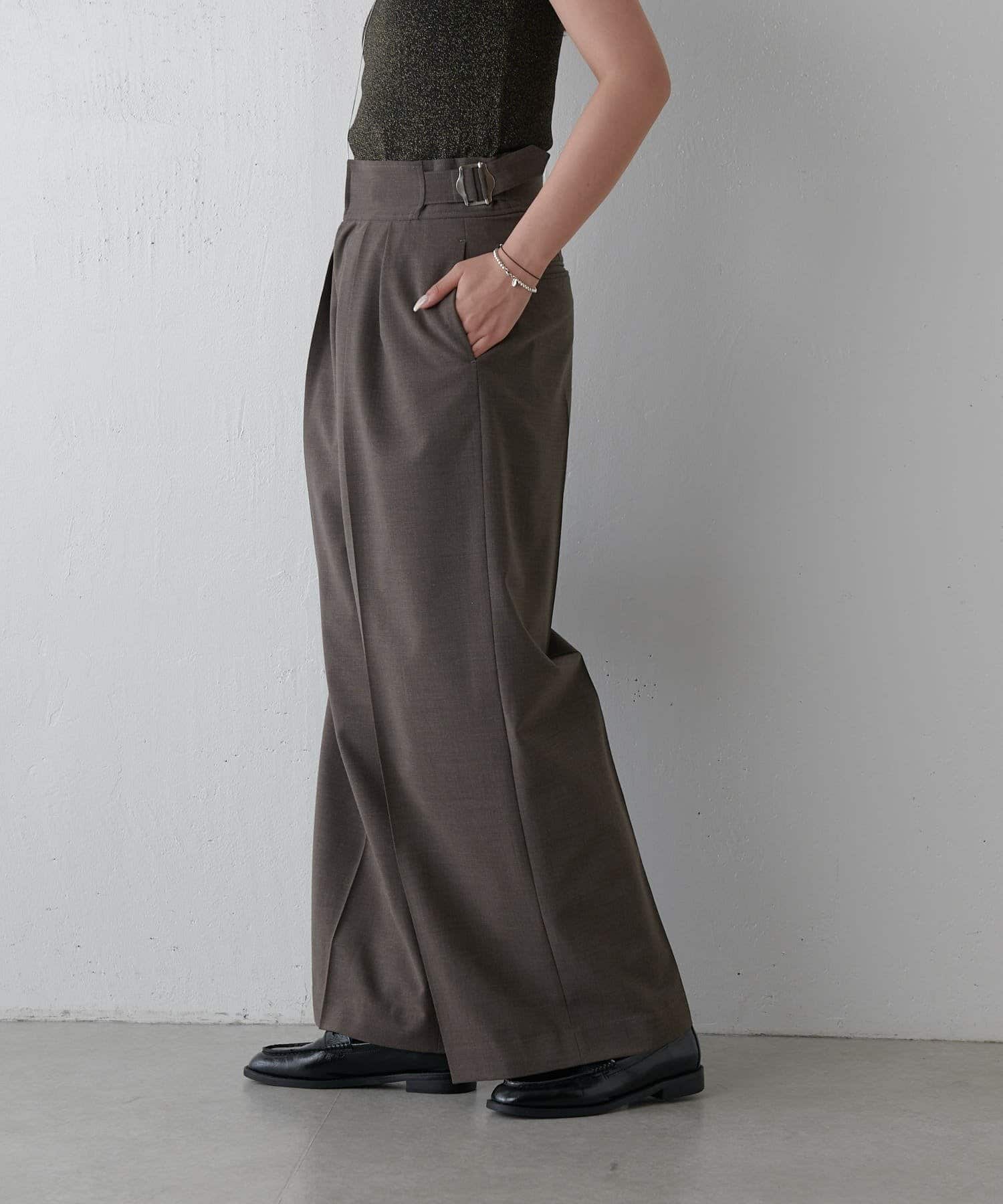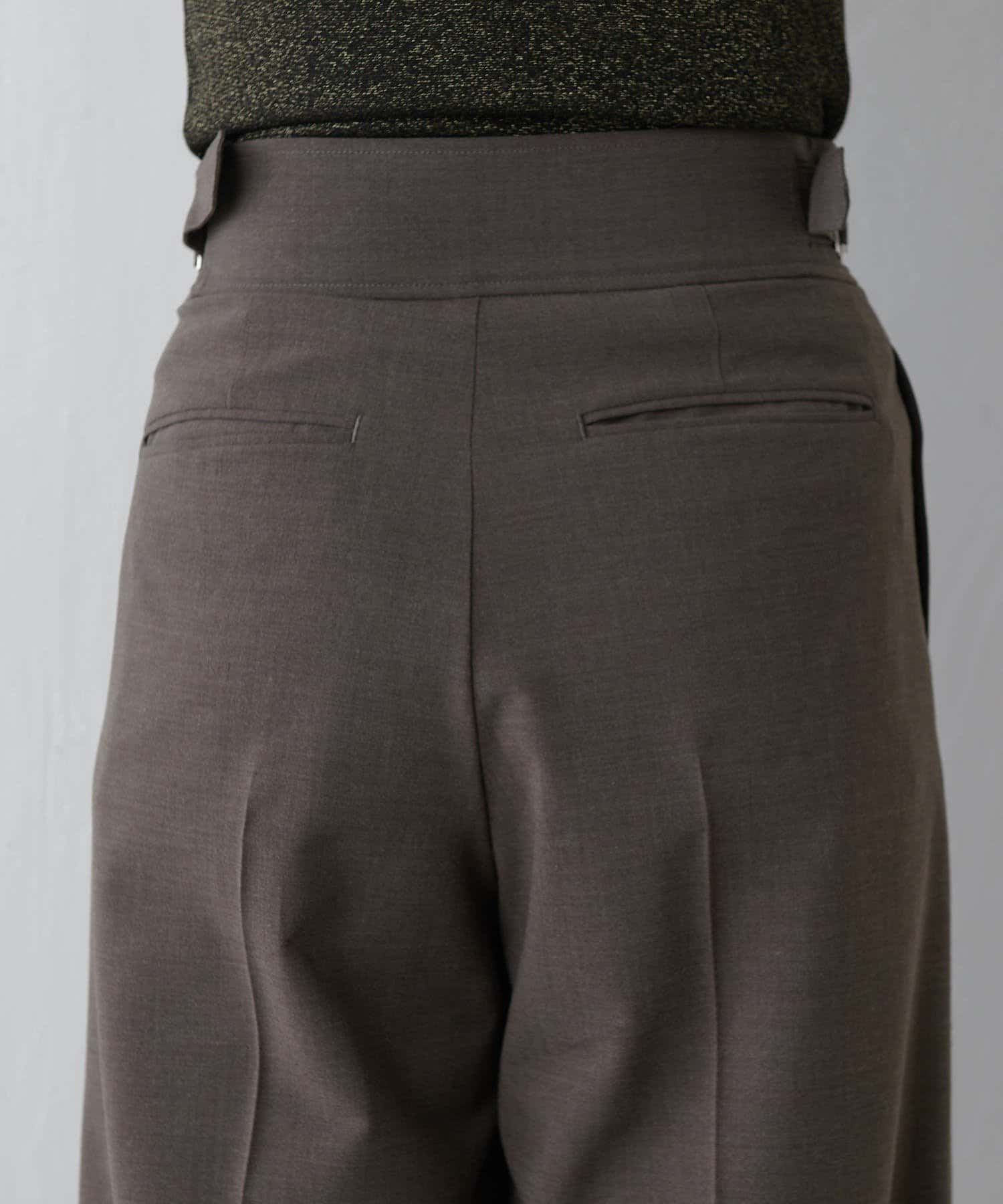 ウエストにタックが入っていて、腰回りにベルトが付いているのでウエストマークができるパンツです。
