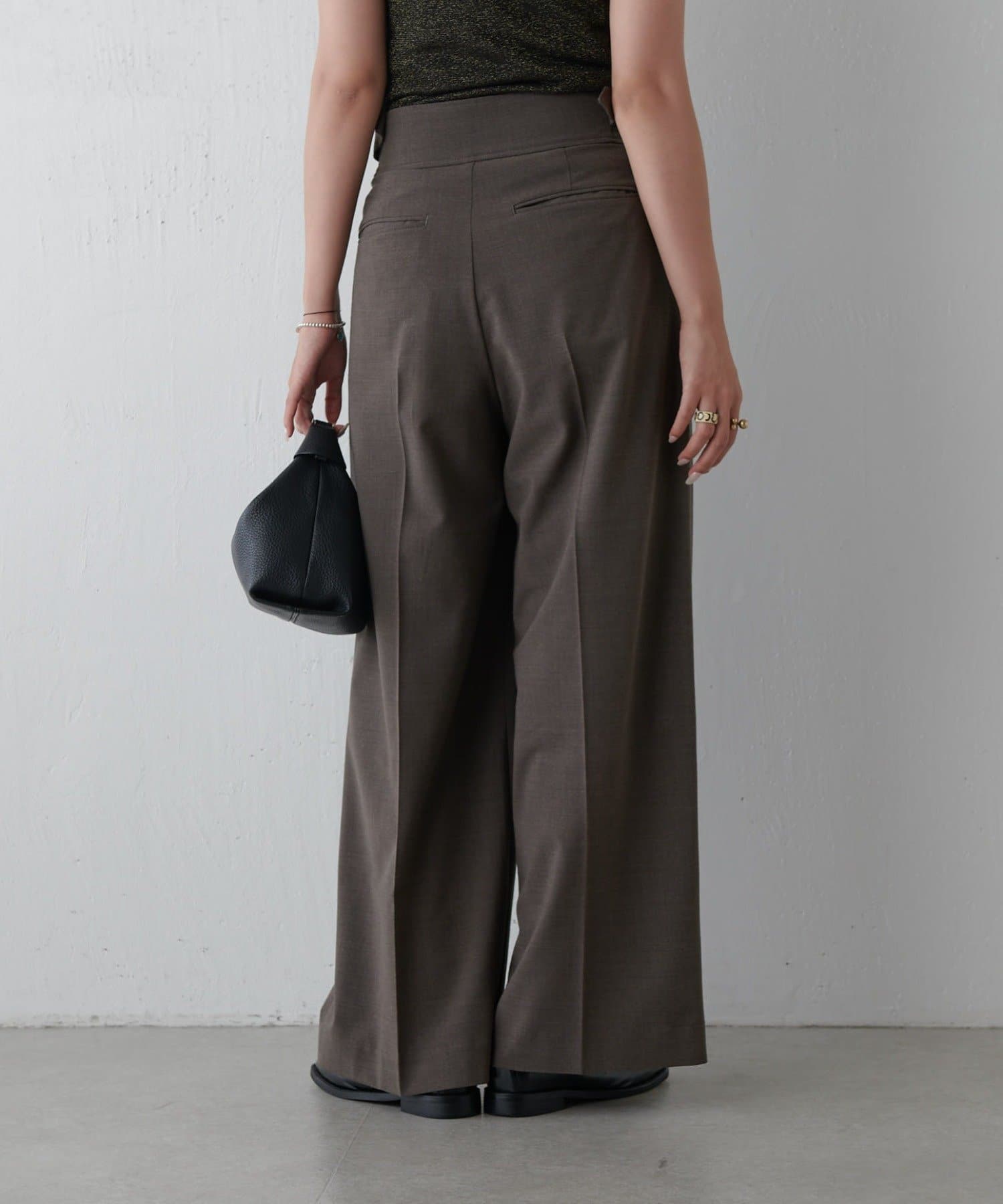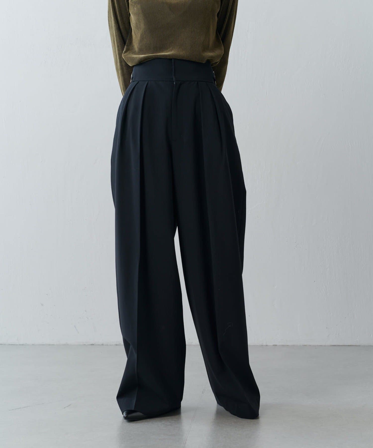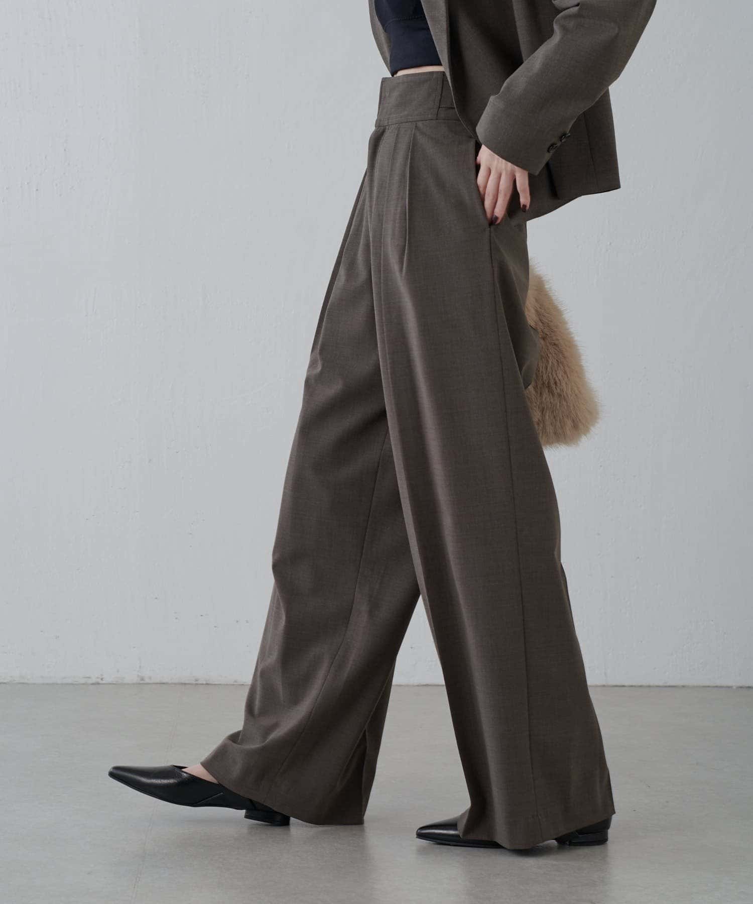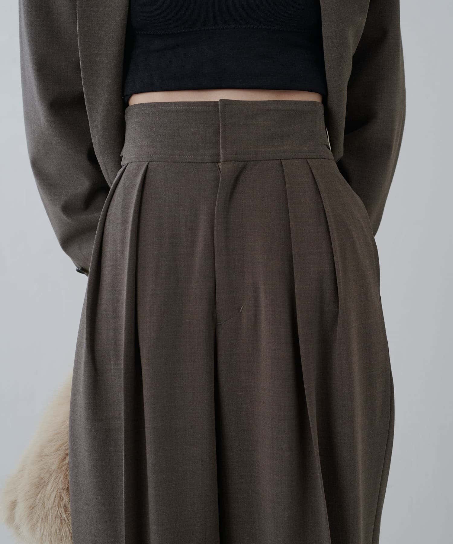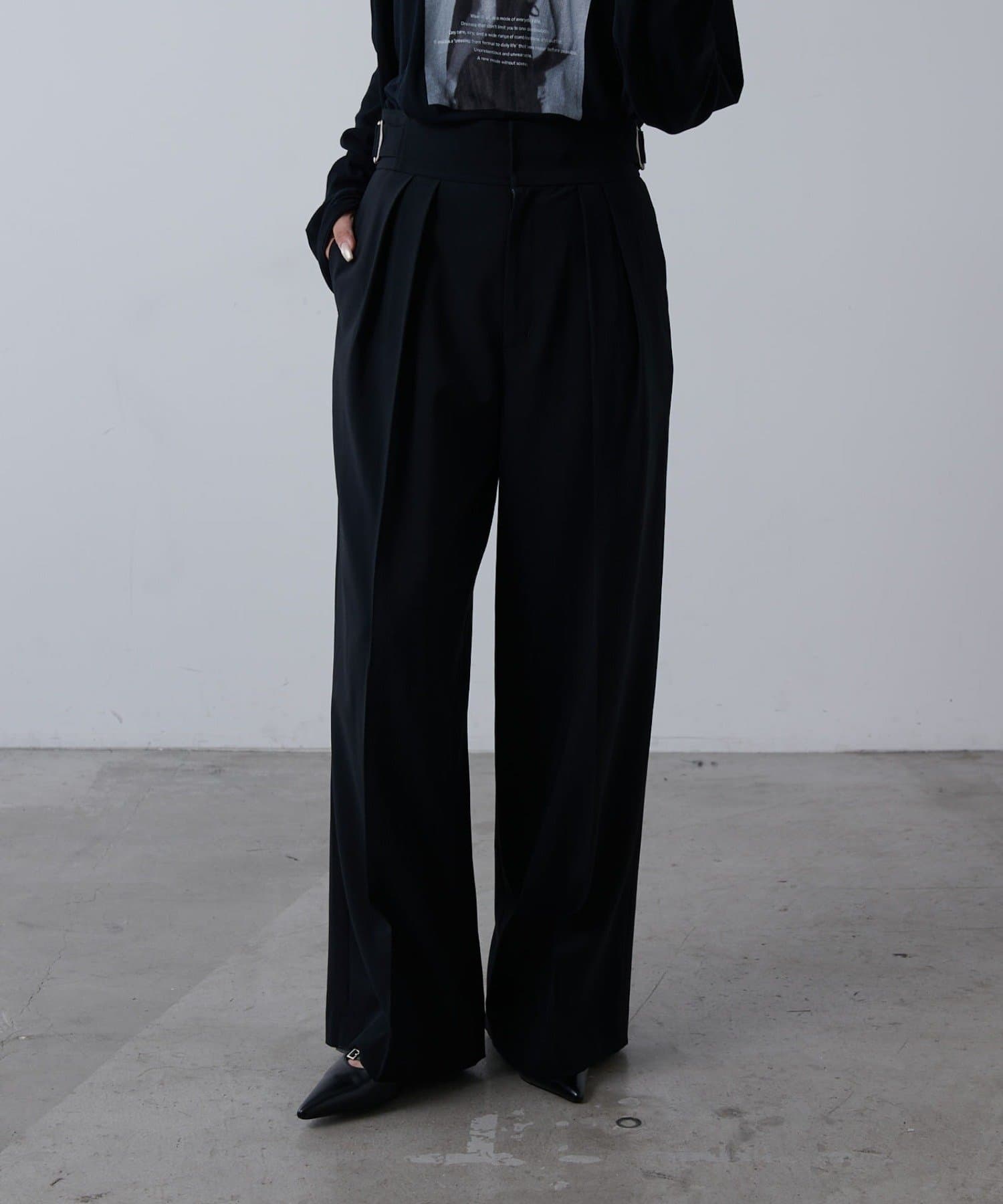 ウエストにタックが入っていて、腰回りにベルトが付いているのでウエストマークができるパンツです。