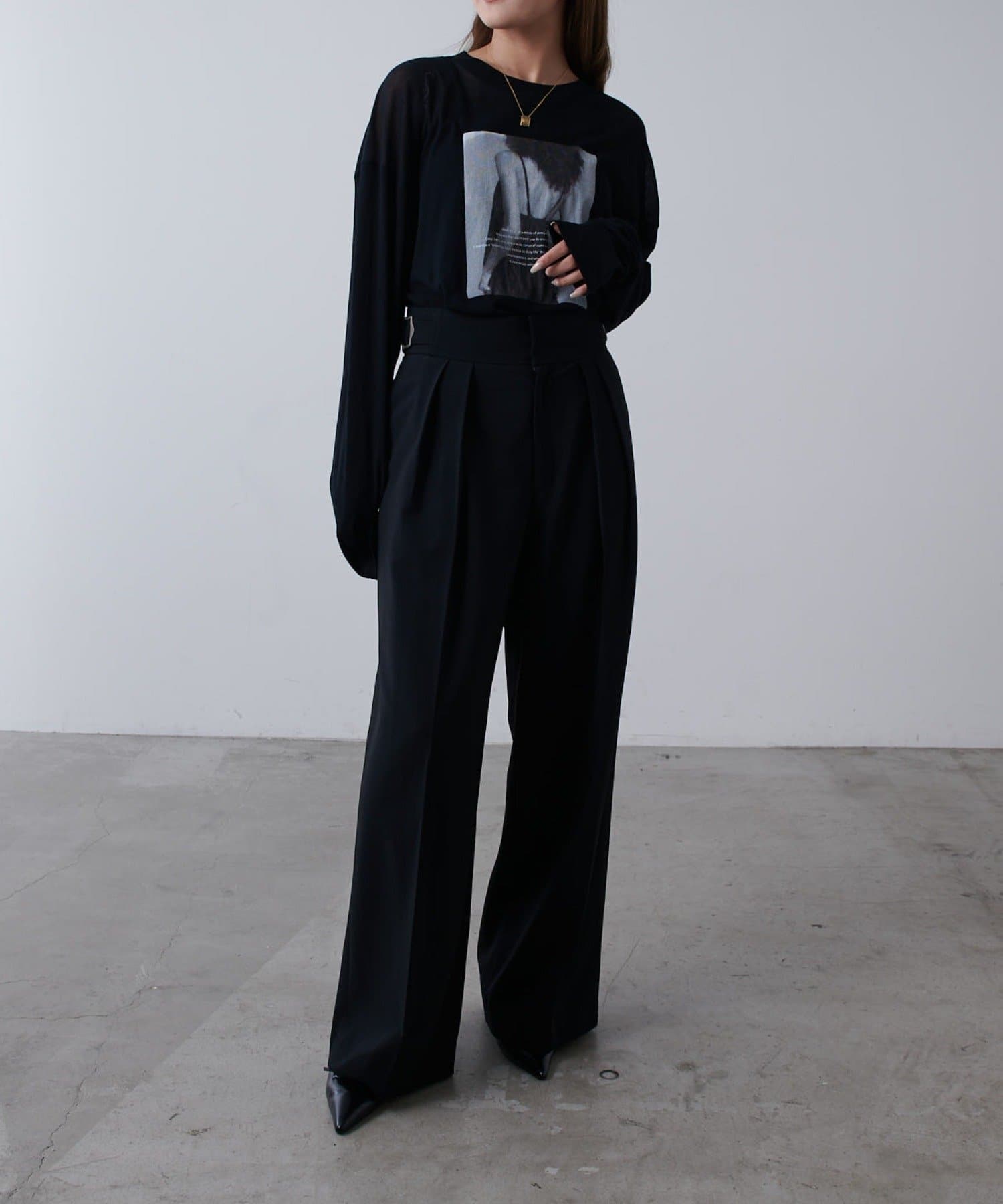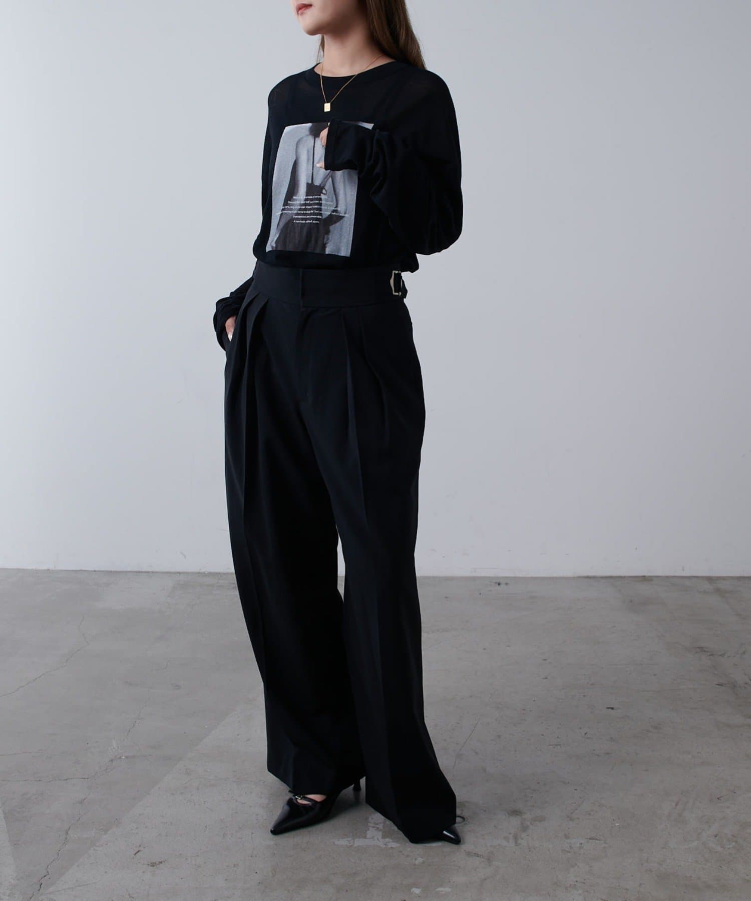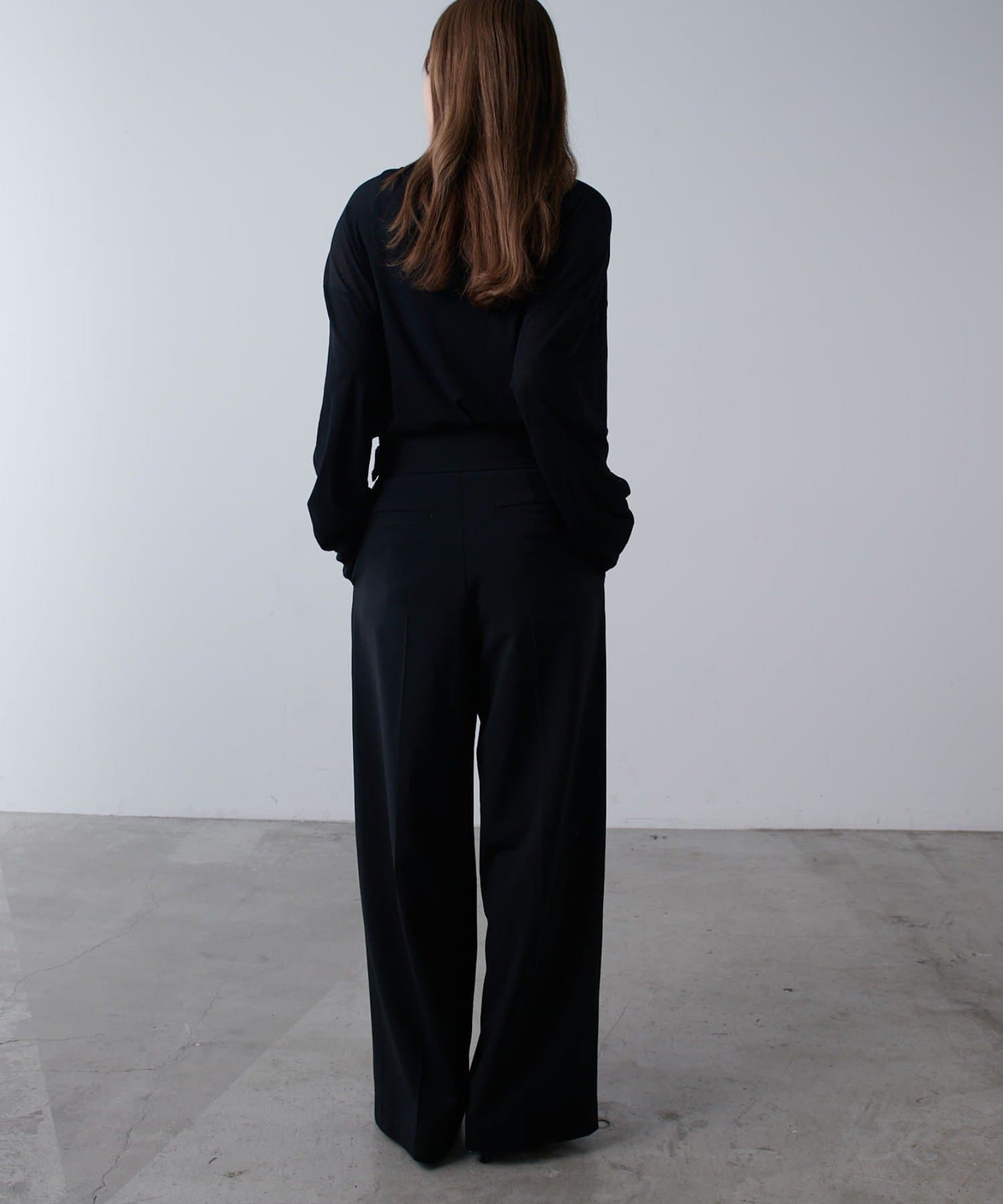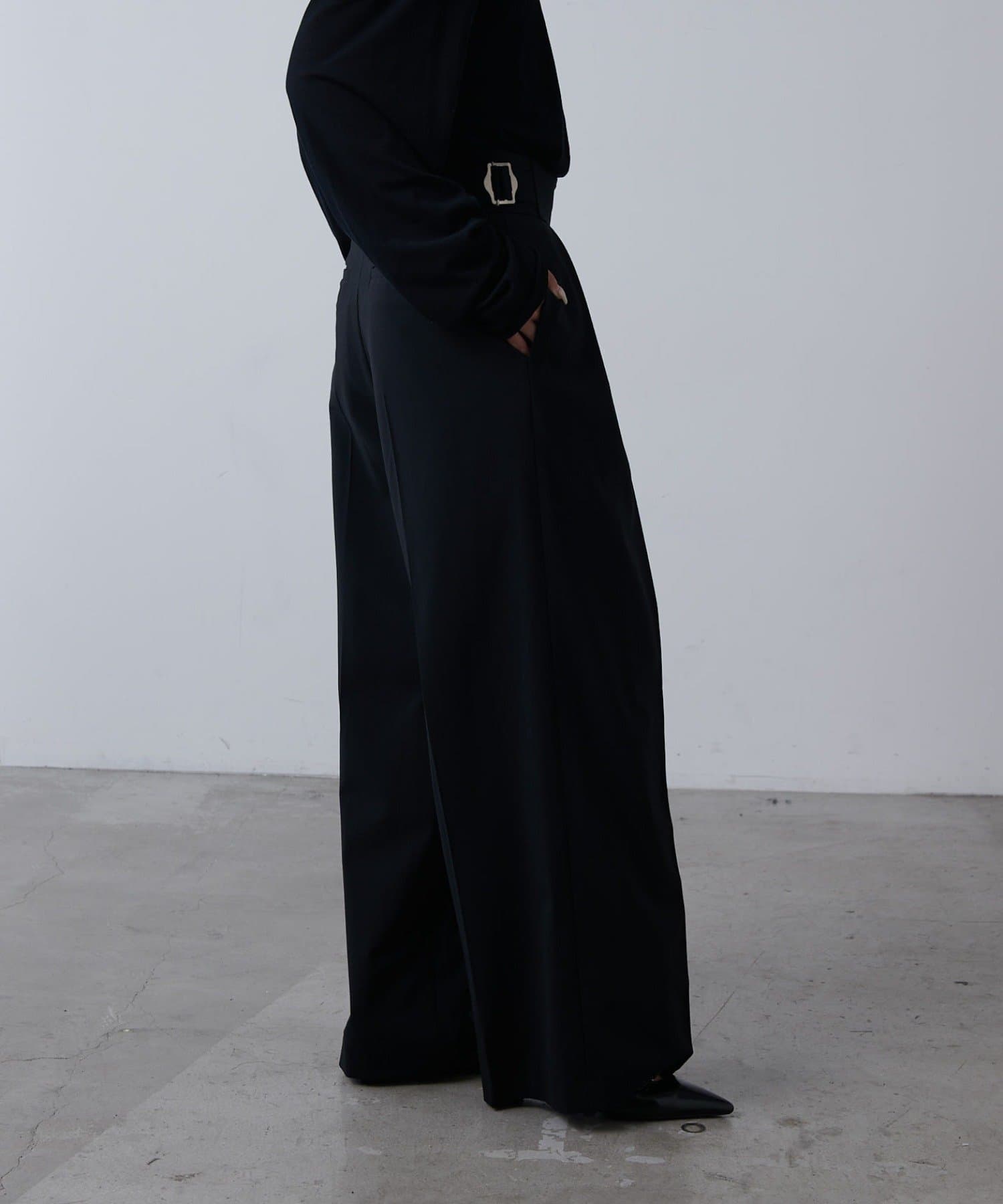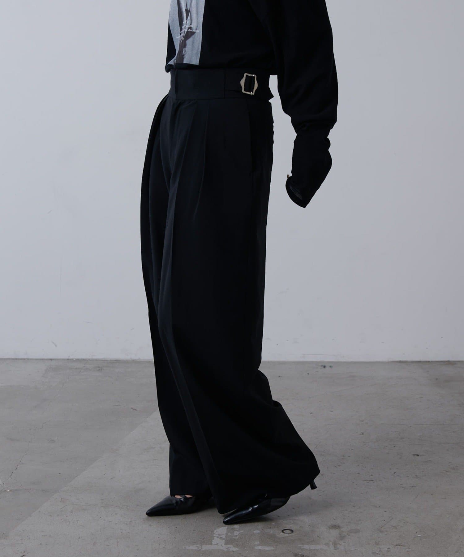 ウエストにタックが入っていて、腰回りにベルトが付いているのでウエストマークができるパンツです。