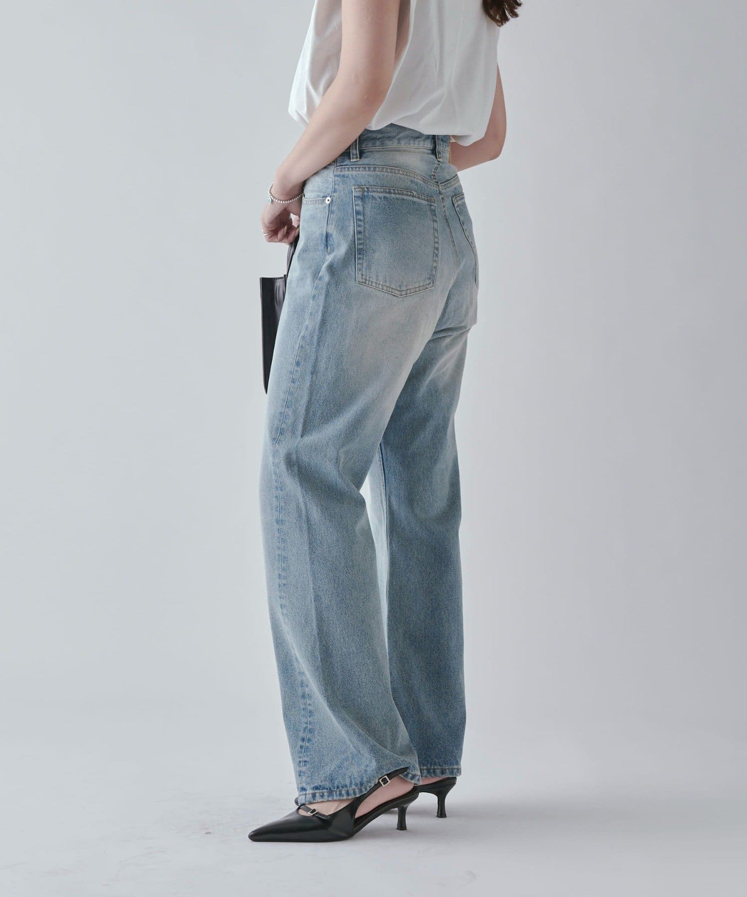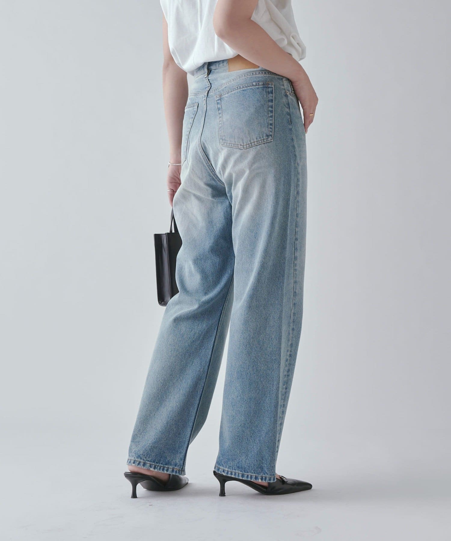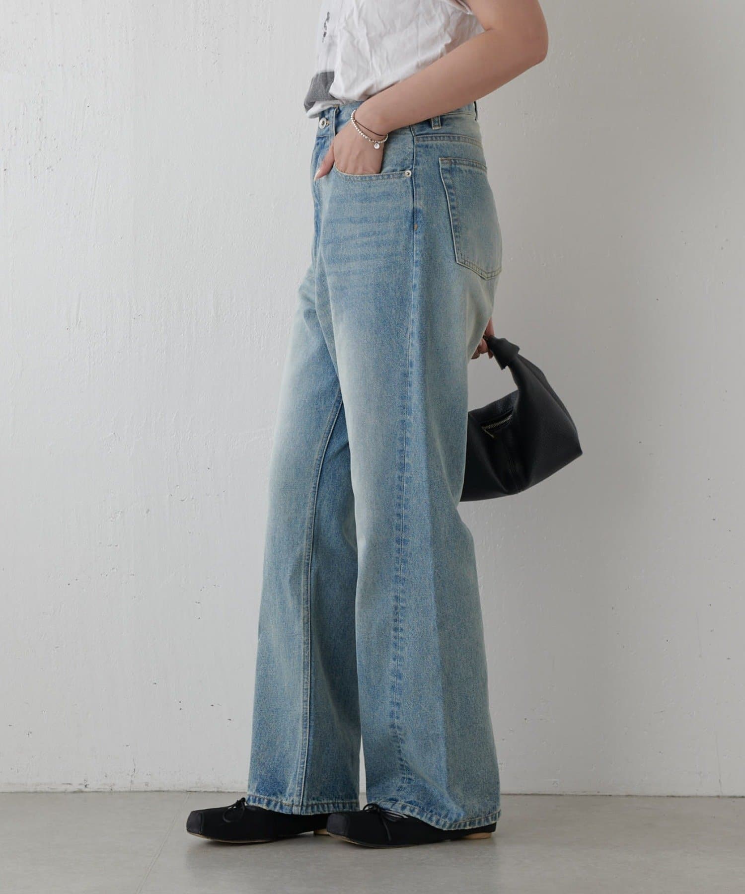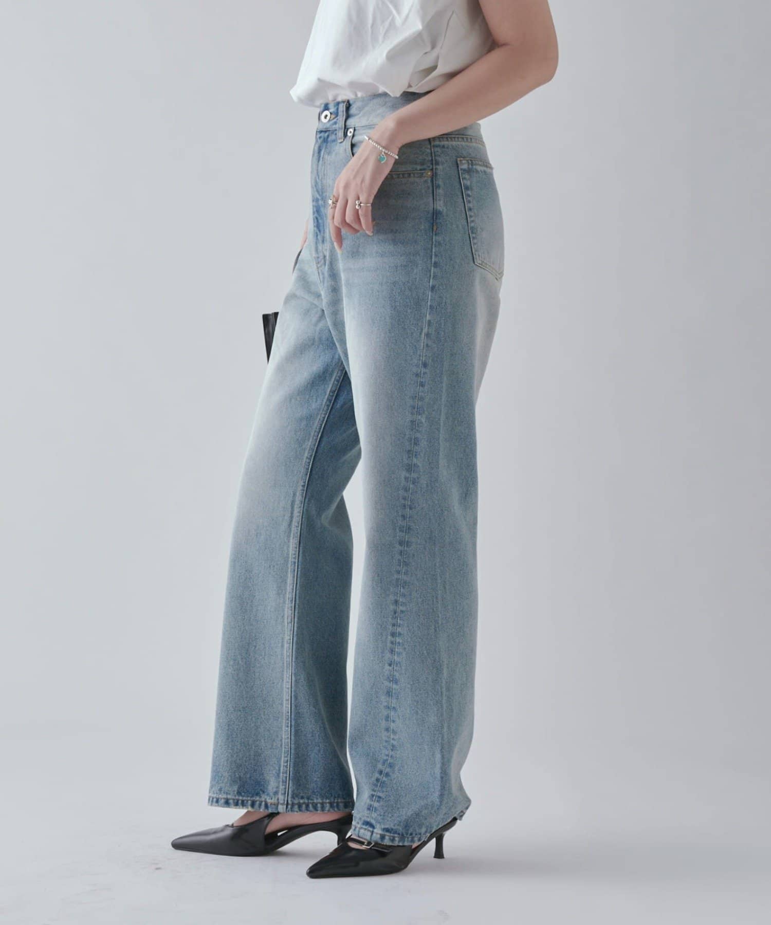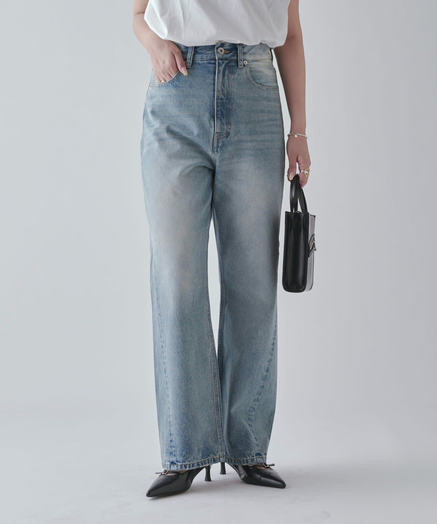 ワイドすぎず女性らしいシルエットなので、大人カジュアルに着こなせるストレートデニムとなっております。
