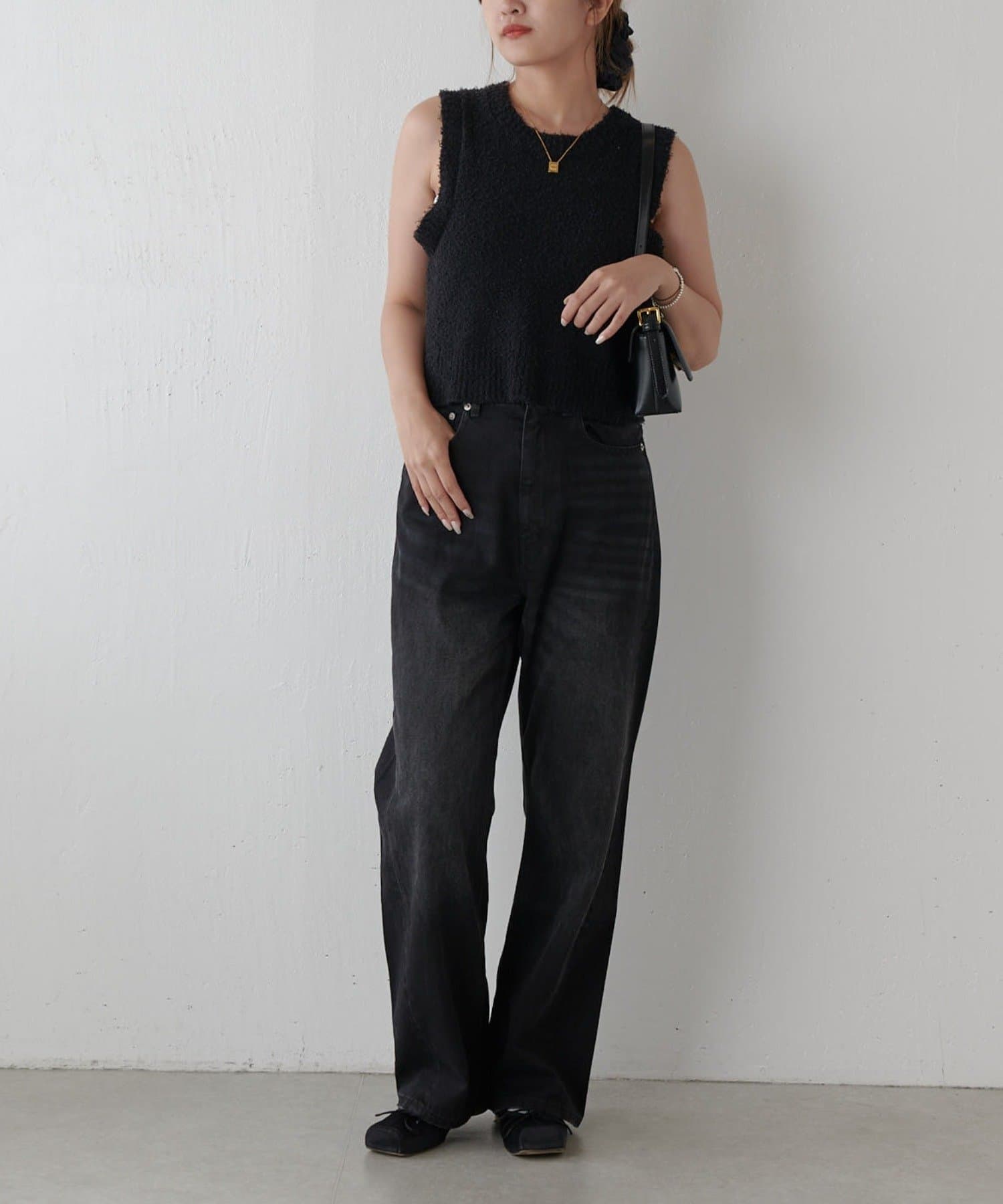 少し靴にためて履けるよう長めのレングスにしているので、ミュールやヒールとの相性も◎