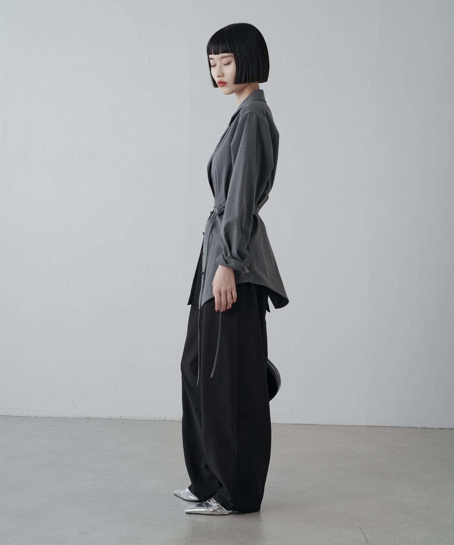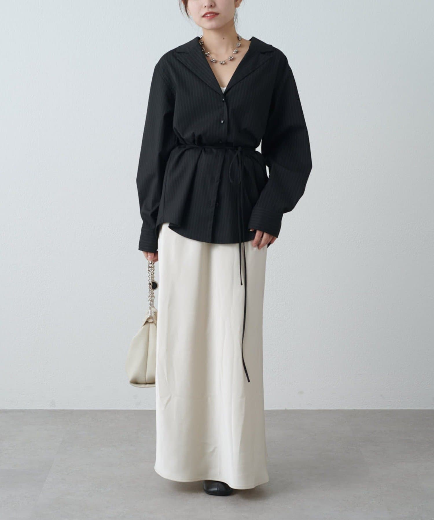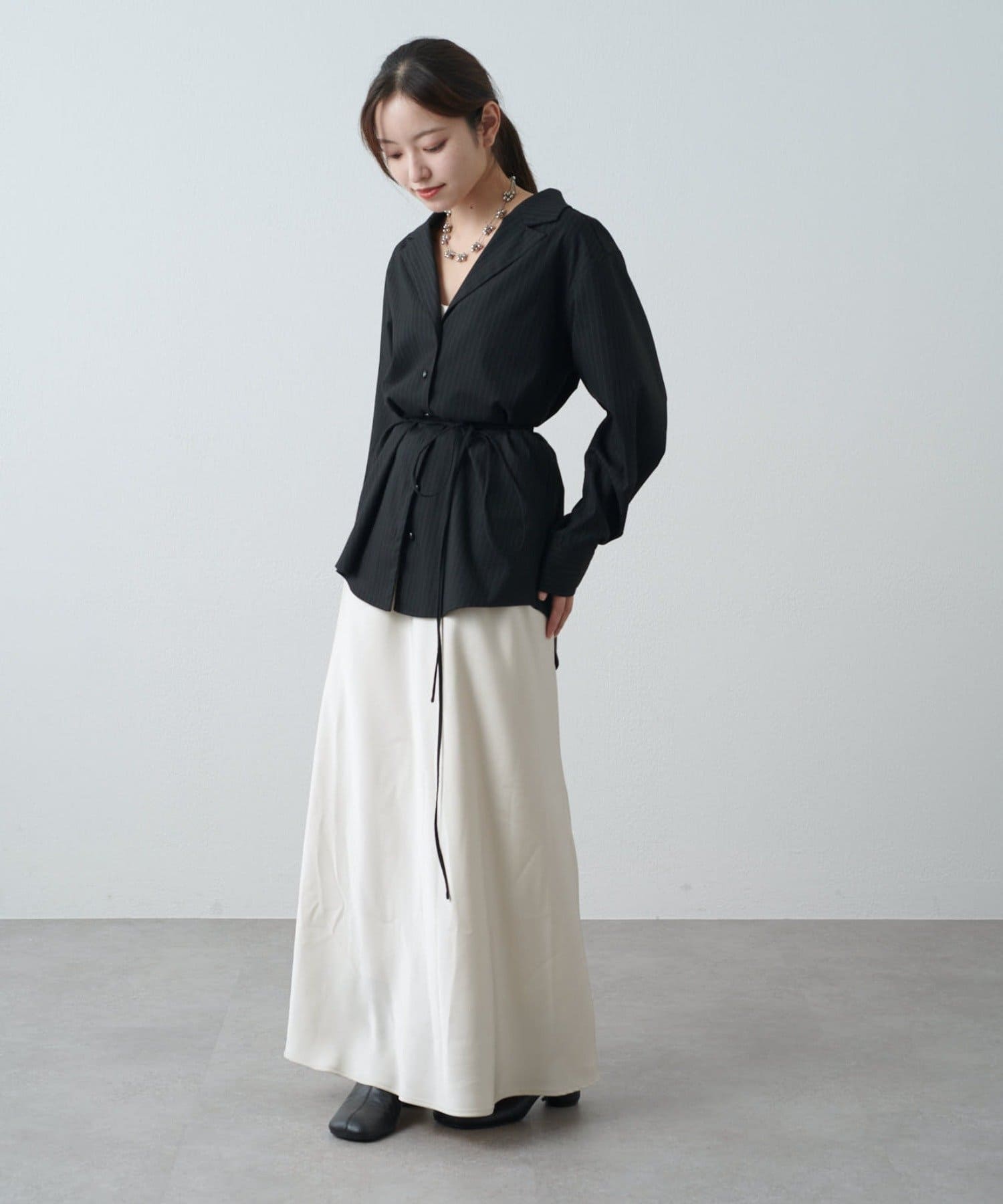 ぎゅっと絞って着用したり、紐をたらしてストンと着たり、羽織として着たりもできるので着回し力抜群です。