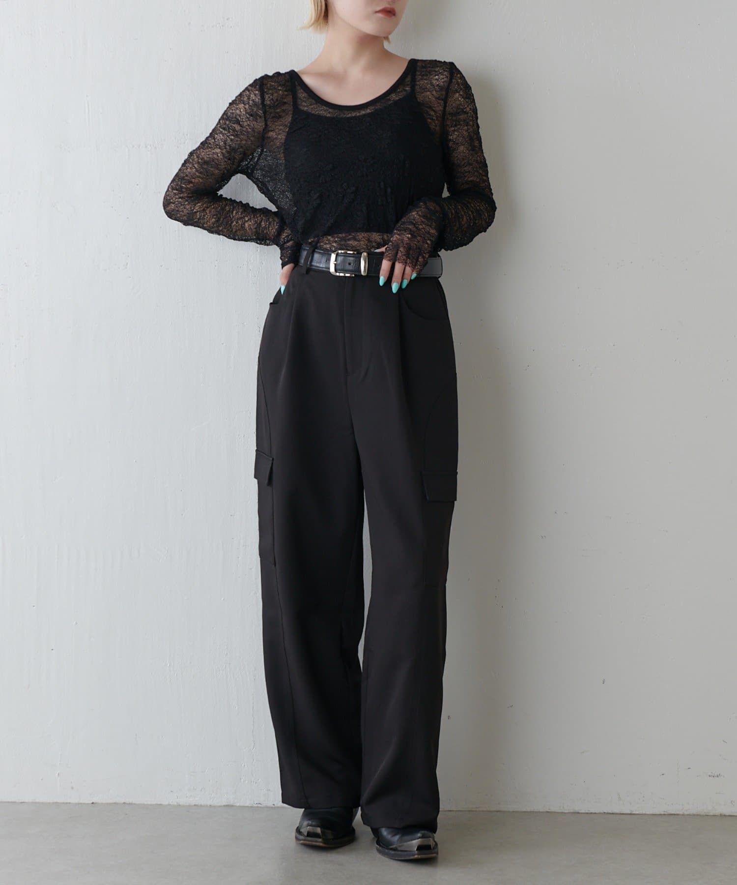 伸縮性のあるレース素材で、デザイン性と着心地どちらも兼ね備えた万能アイテム。