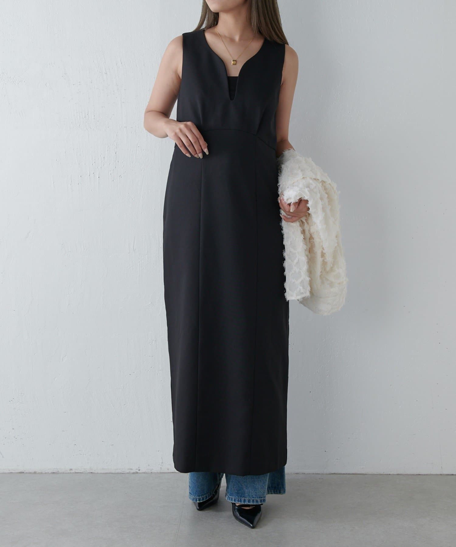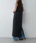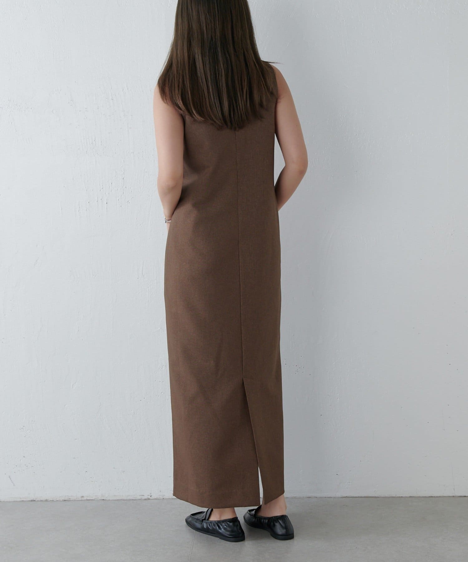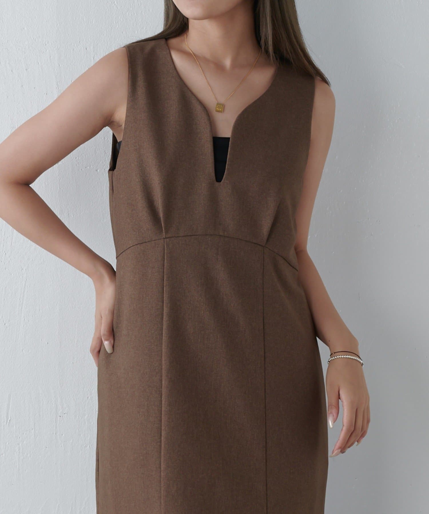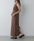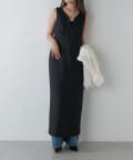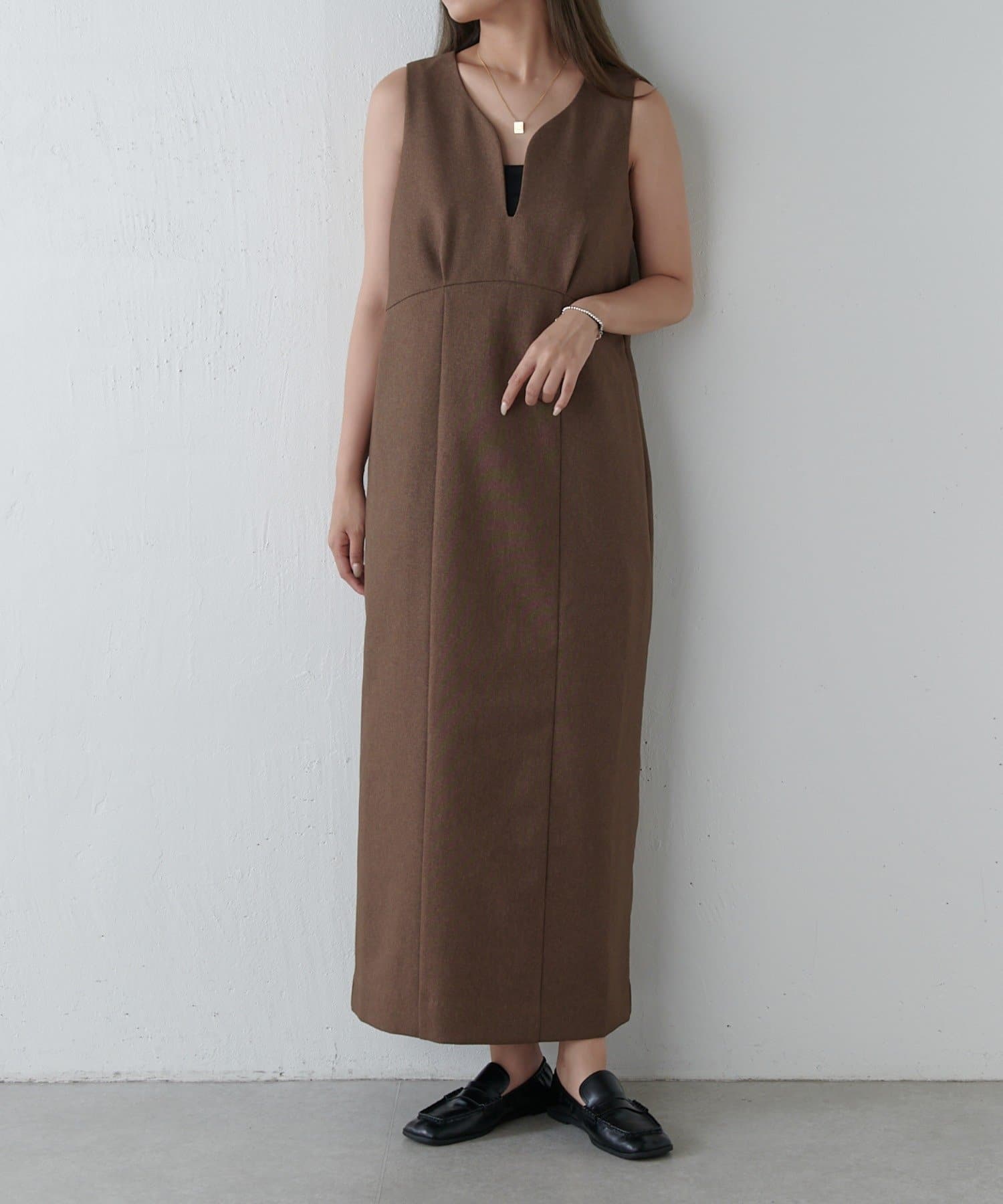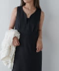 リラックス感のデザインと、胸元のデザインが一枚で楽に決まるノースリワンピ。