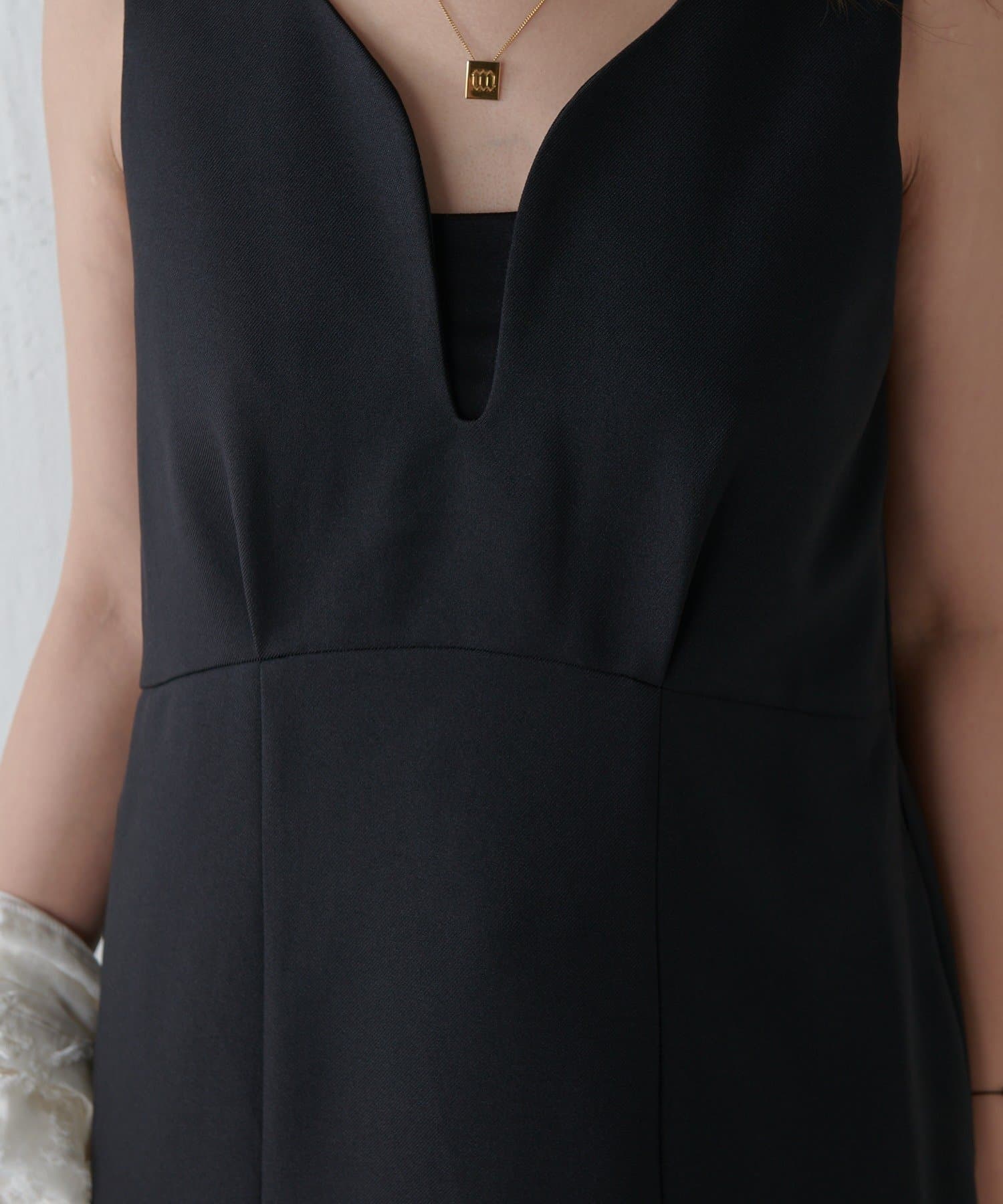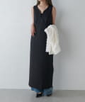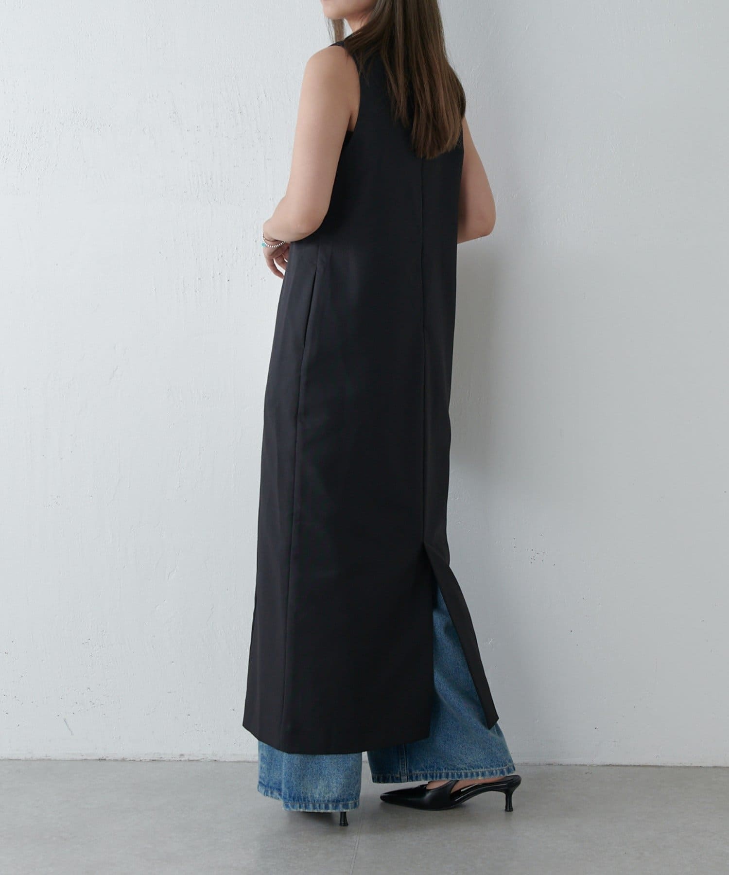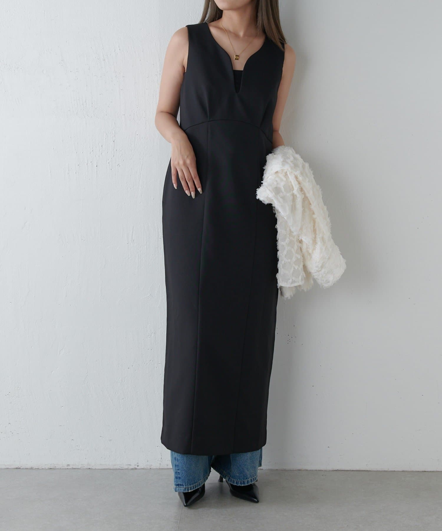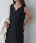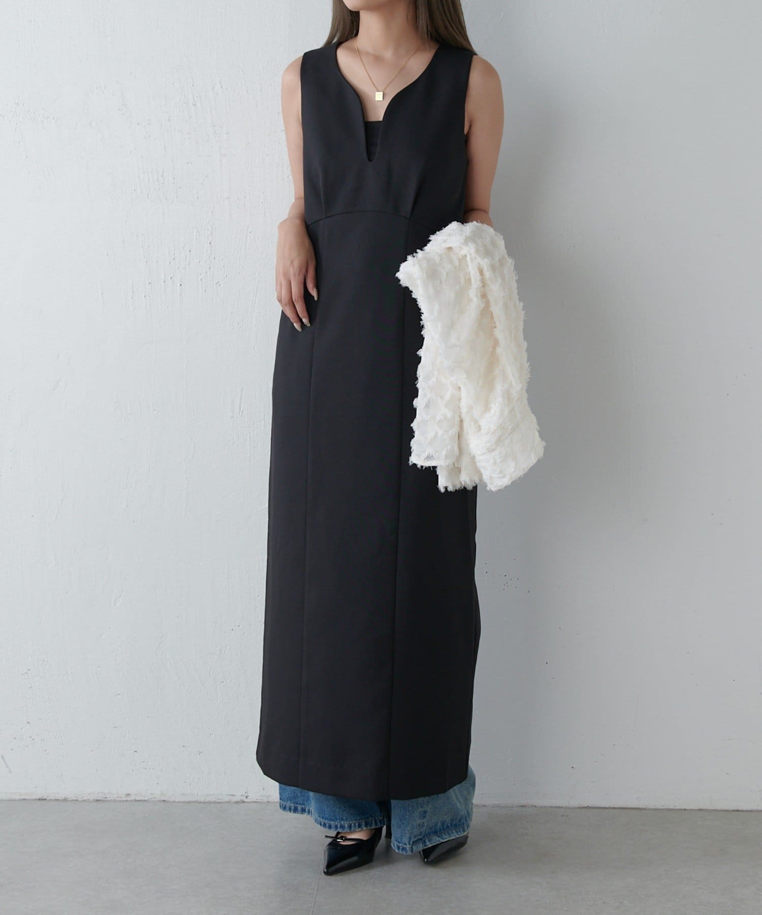 リラックス感のデザインと、胸元のデザインが一枚で楽に決まるノースリワンピ。