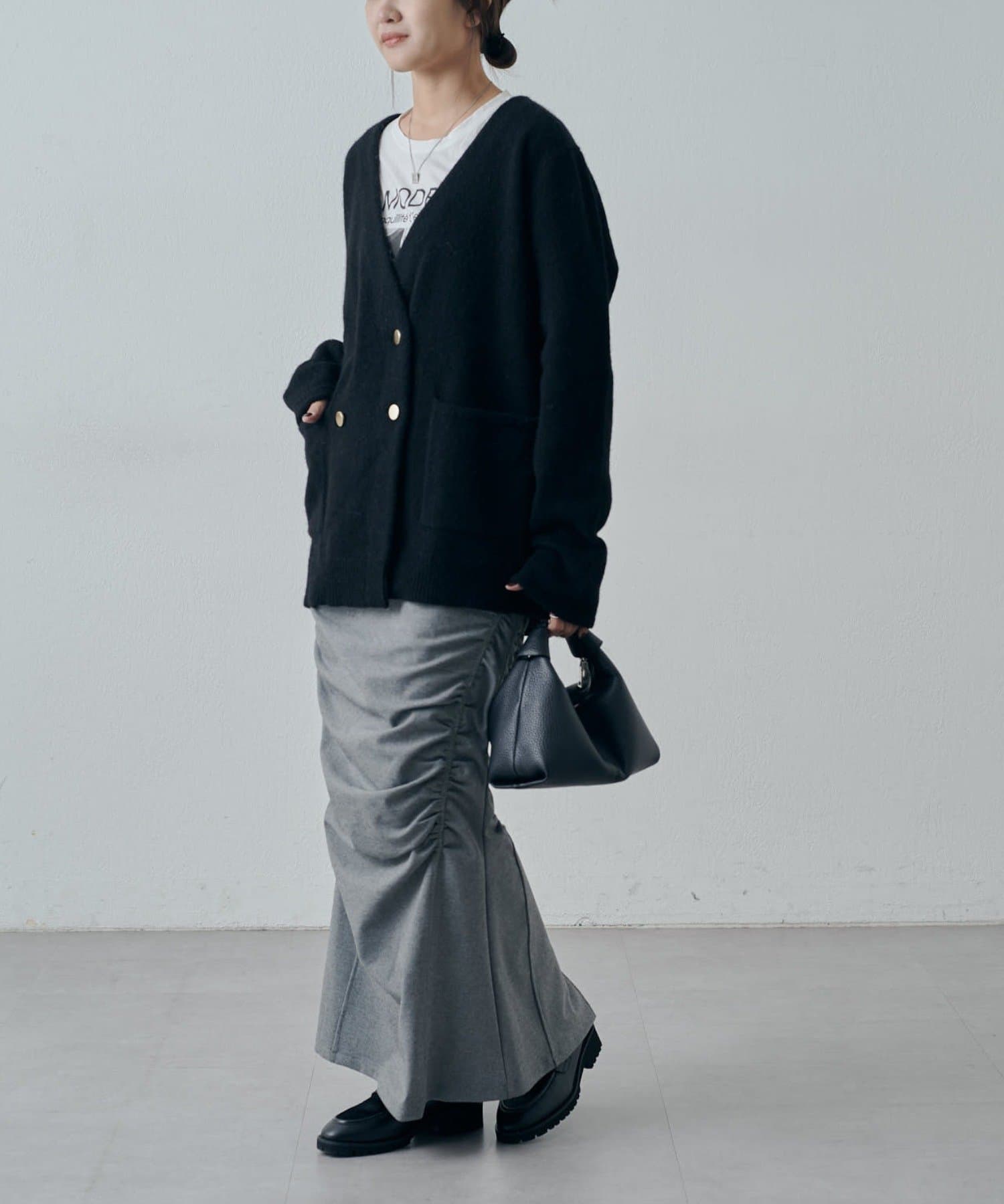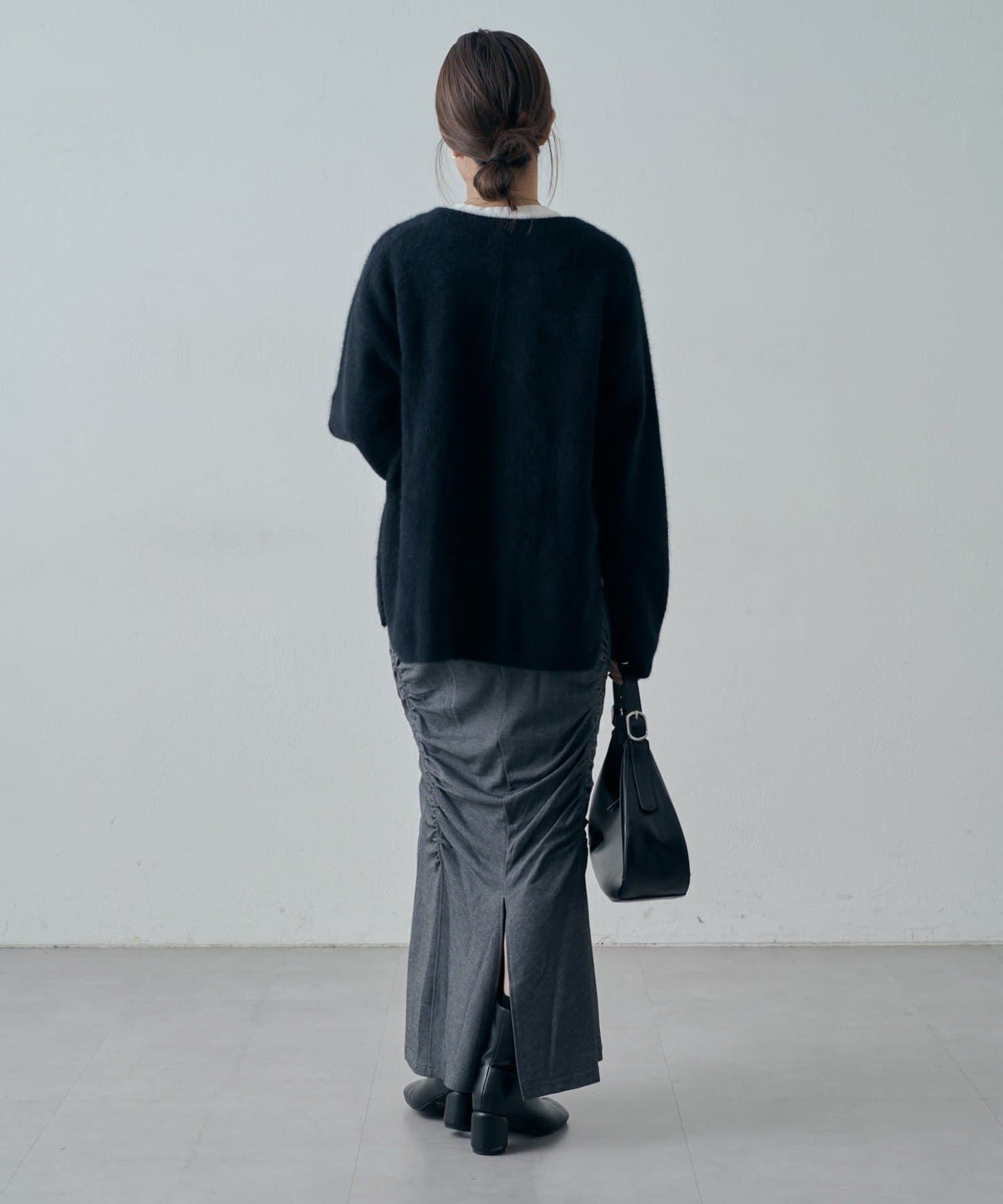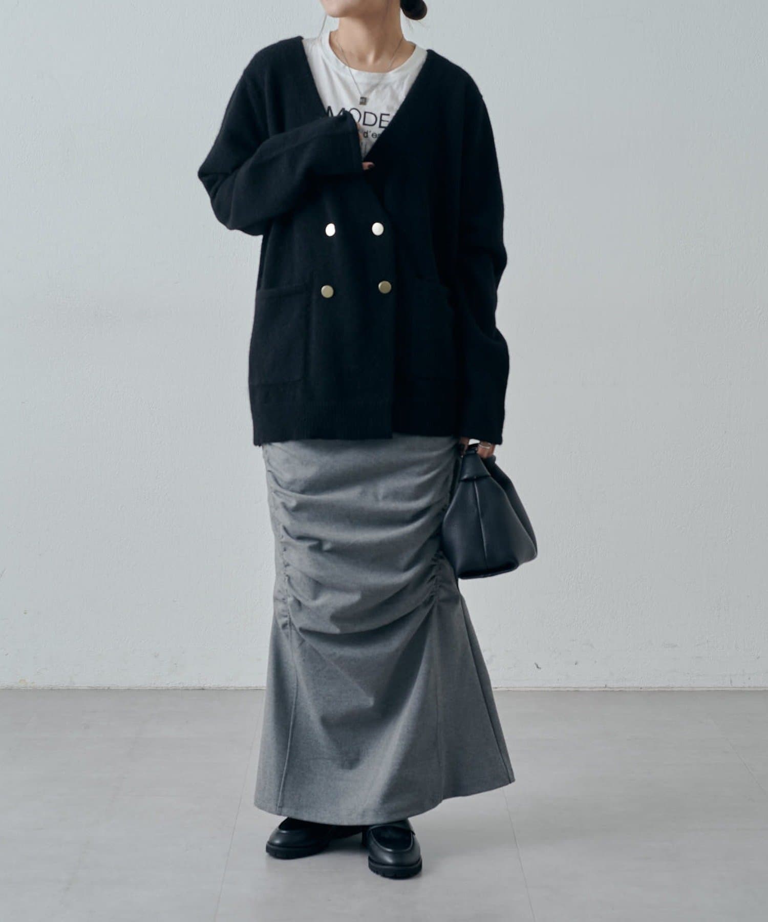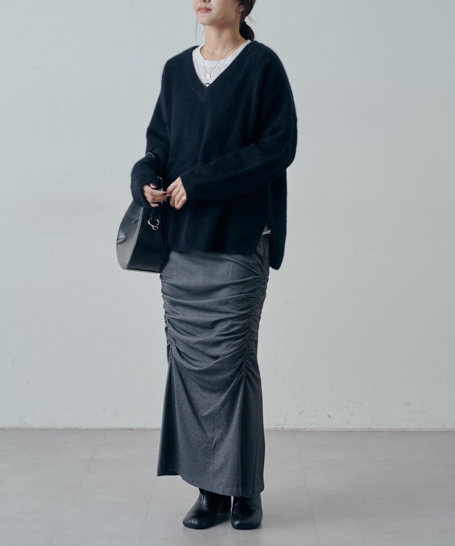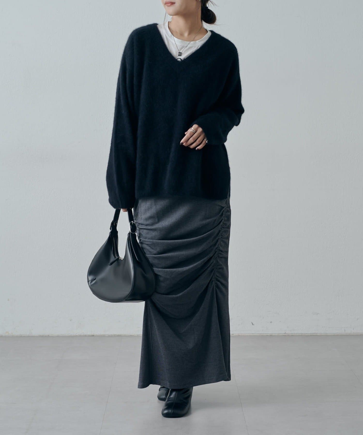 ゆるっとしたニットをアウトで着たこなれ感のあるスタイリングはもちろん、