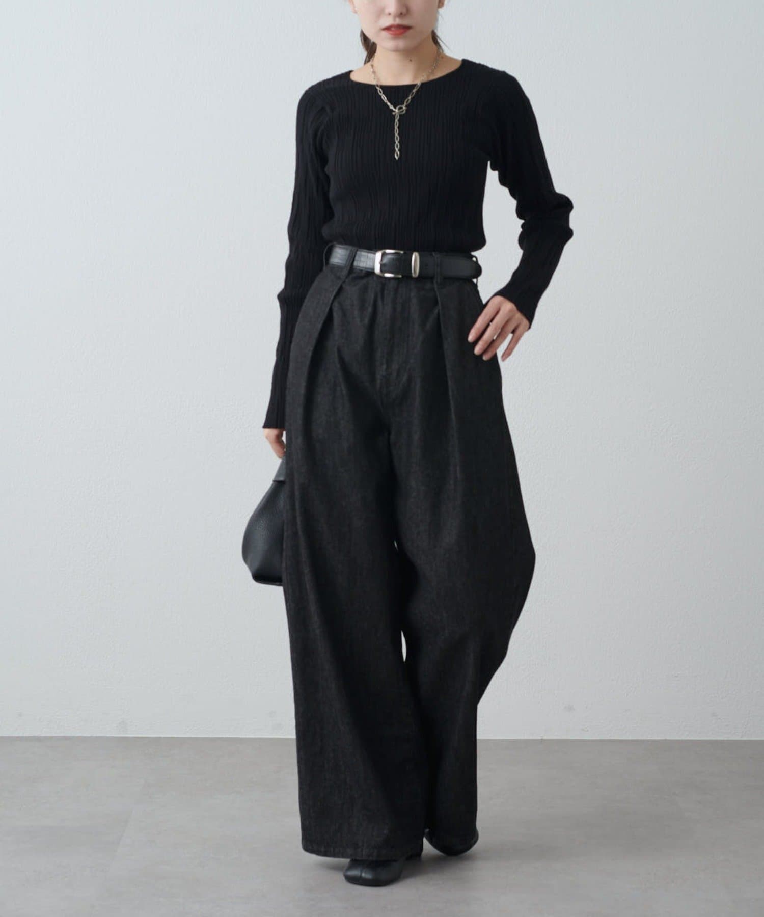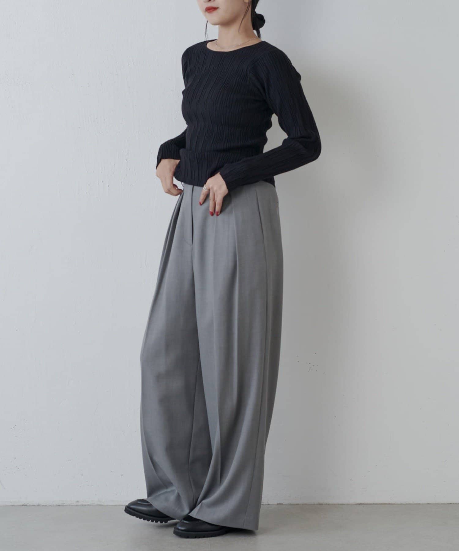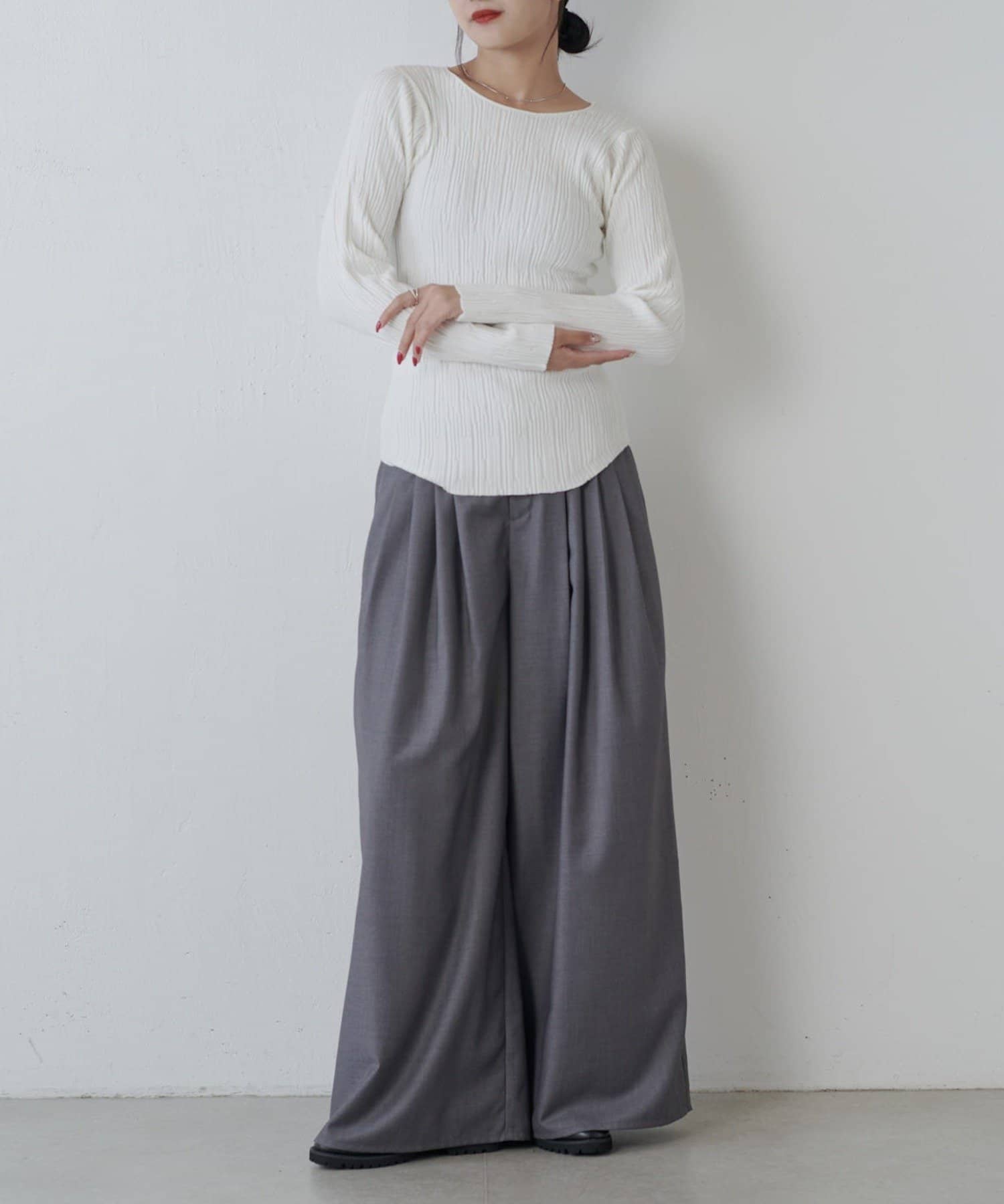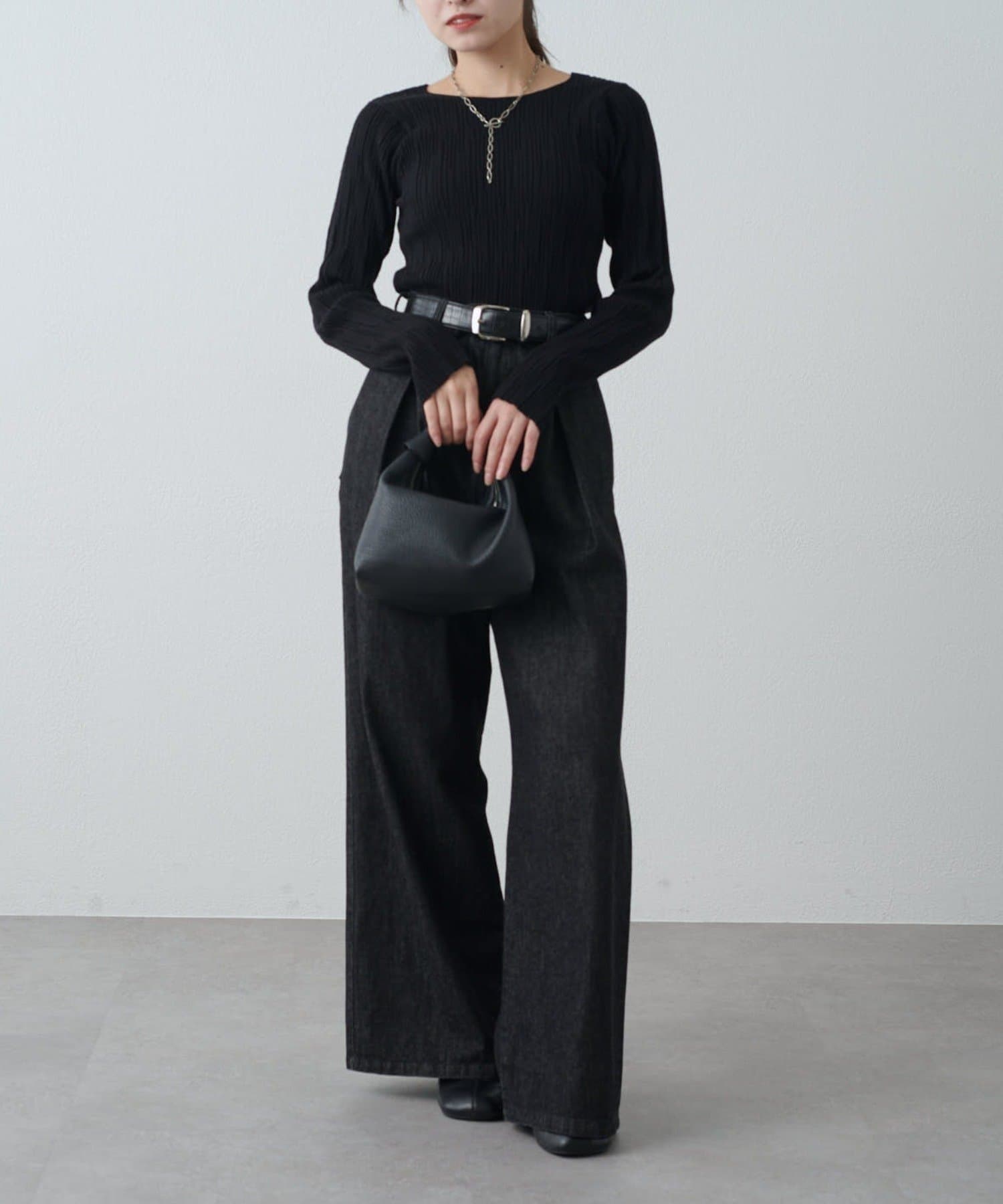トレンド感のある首元のデザインですが、シンプルなトップスなのでどんなボトムとも相性抜群◎