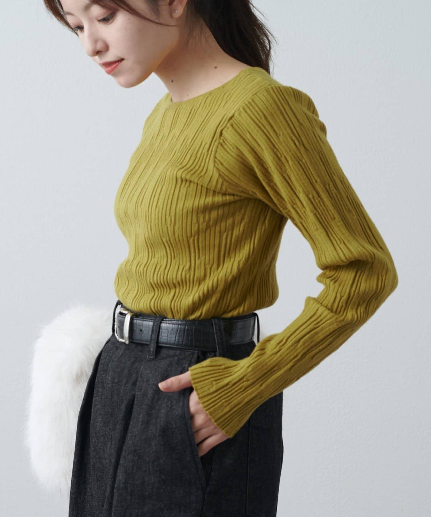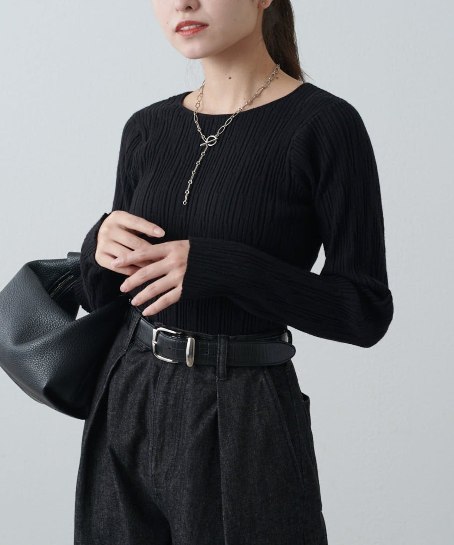 程よくストレッチが効いているので、楽に着れるシンプルなニット。