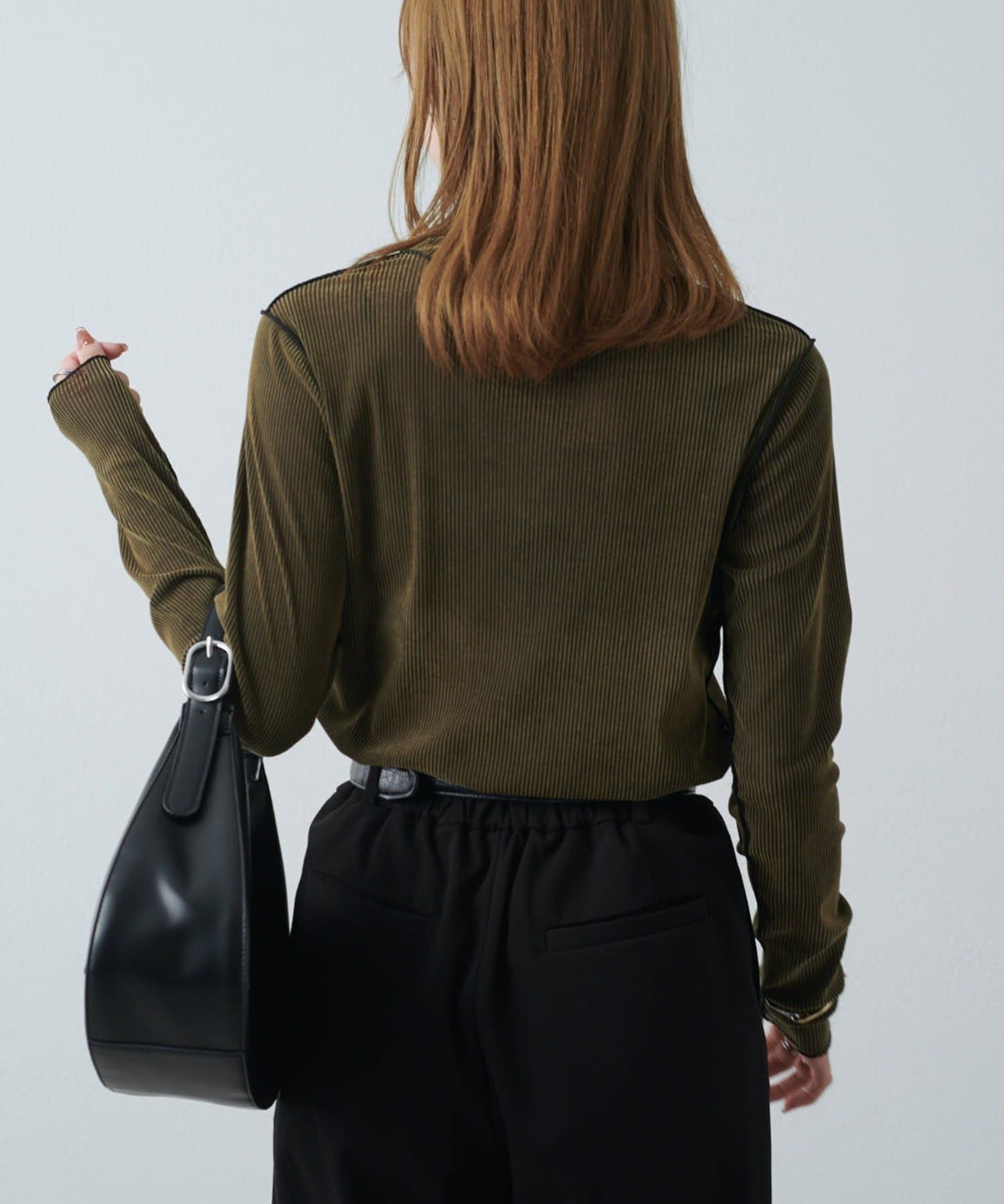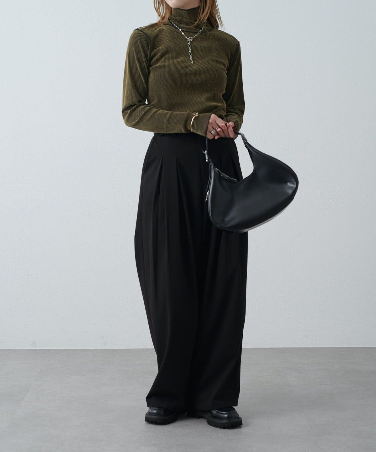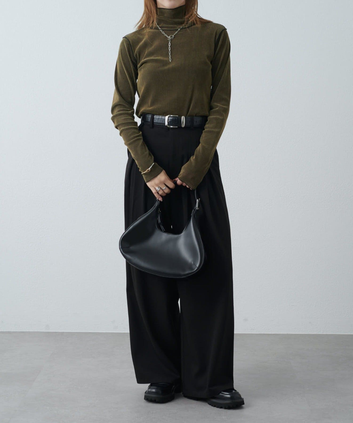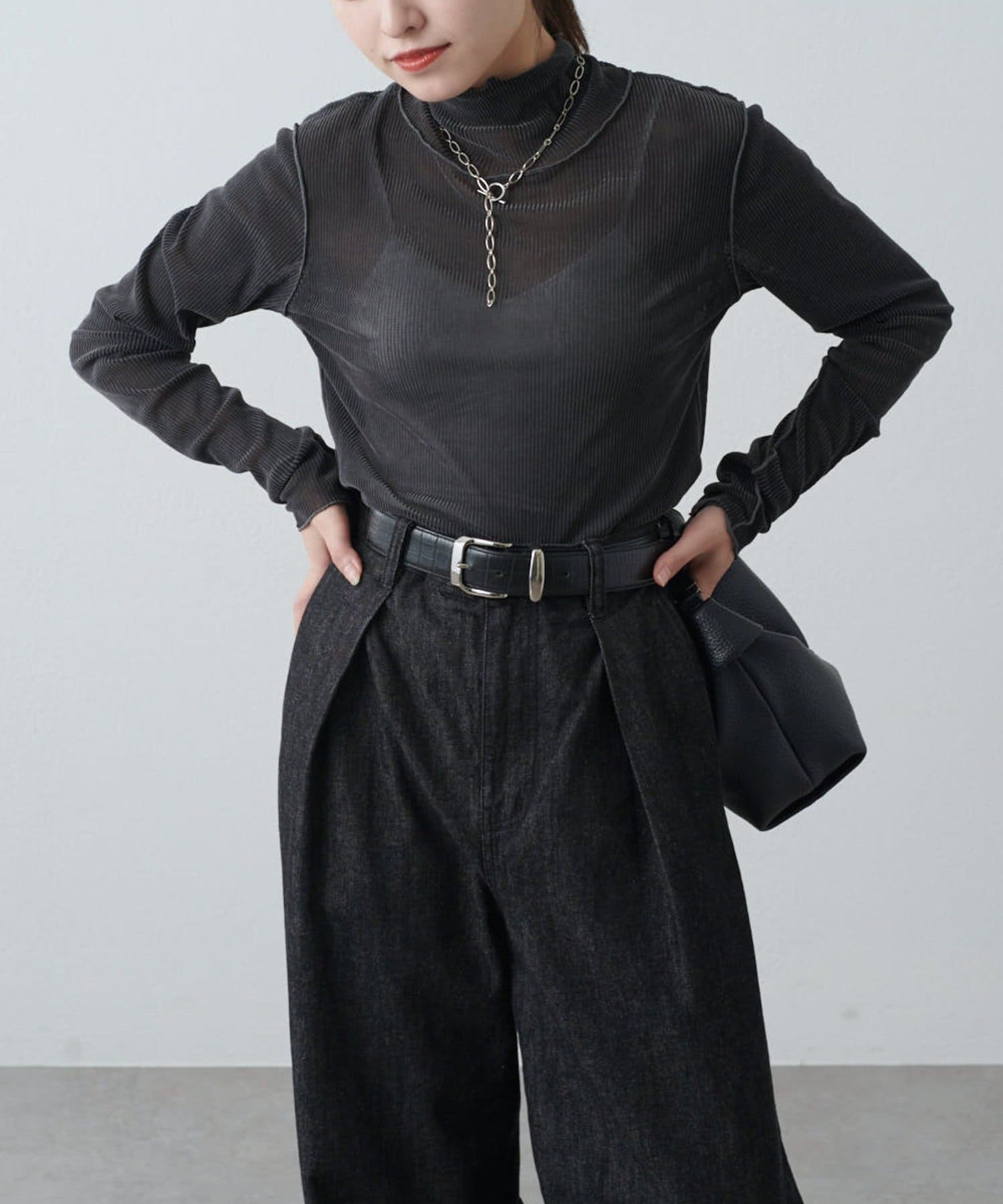 カジュアルスタイル:デニムやワイドパンツに合わせて抜け感のあるコーデに。スウェットになかに仕込んでレイヤードにも。
