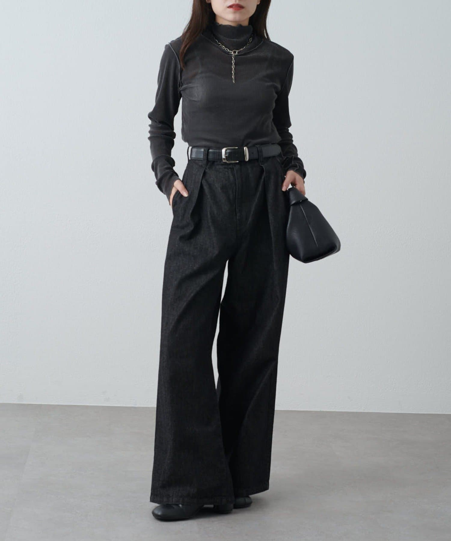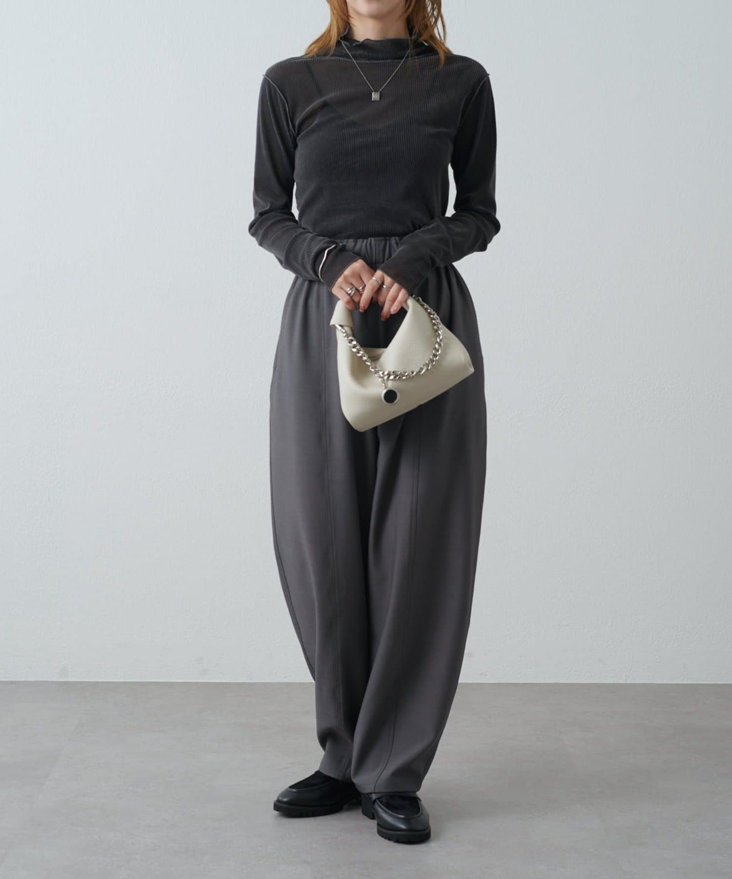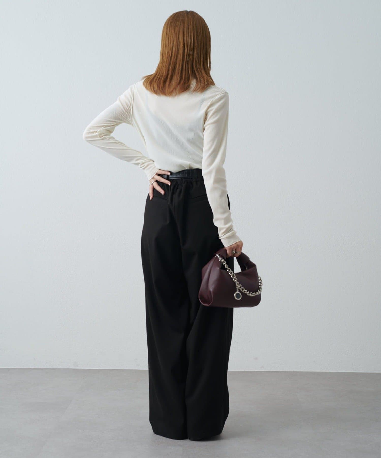 カジュアルスタイル:デニムやワイドパンツに合わせて抜け感のあるコーデに。スウェットになかに仕込んでレイヤードにも。