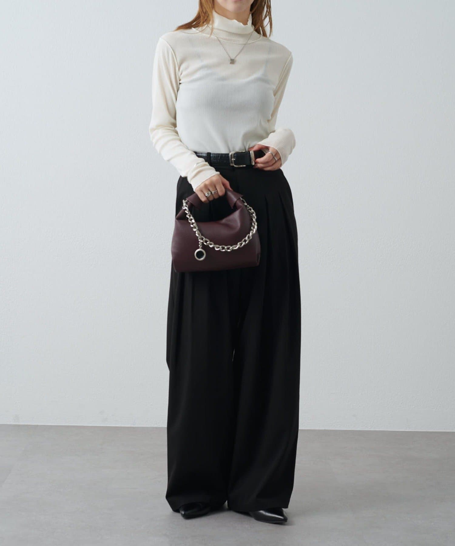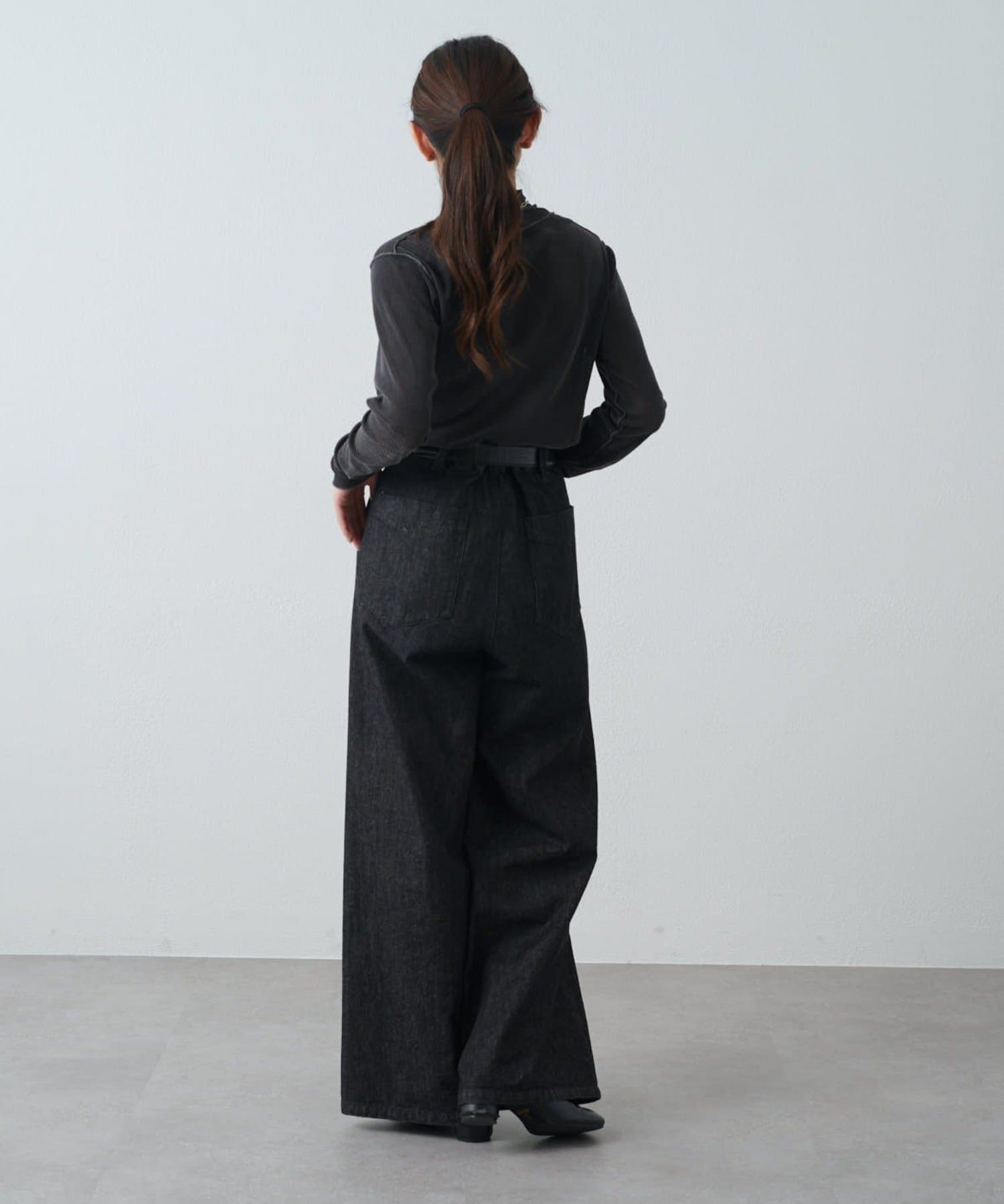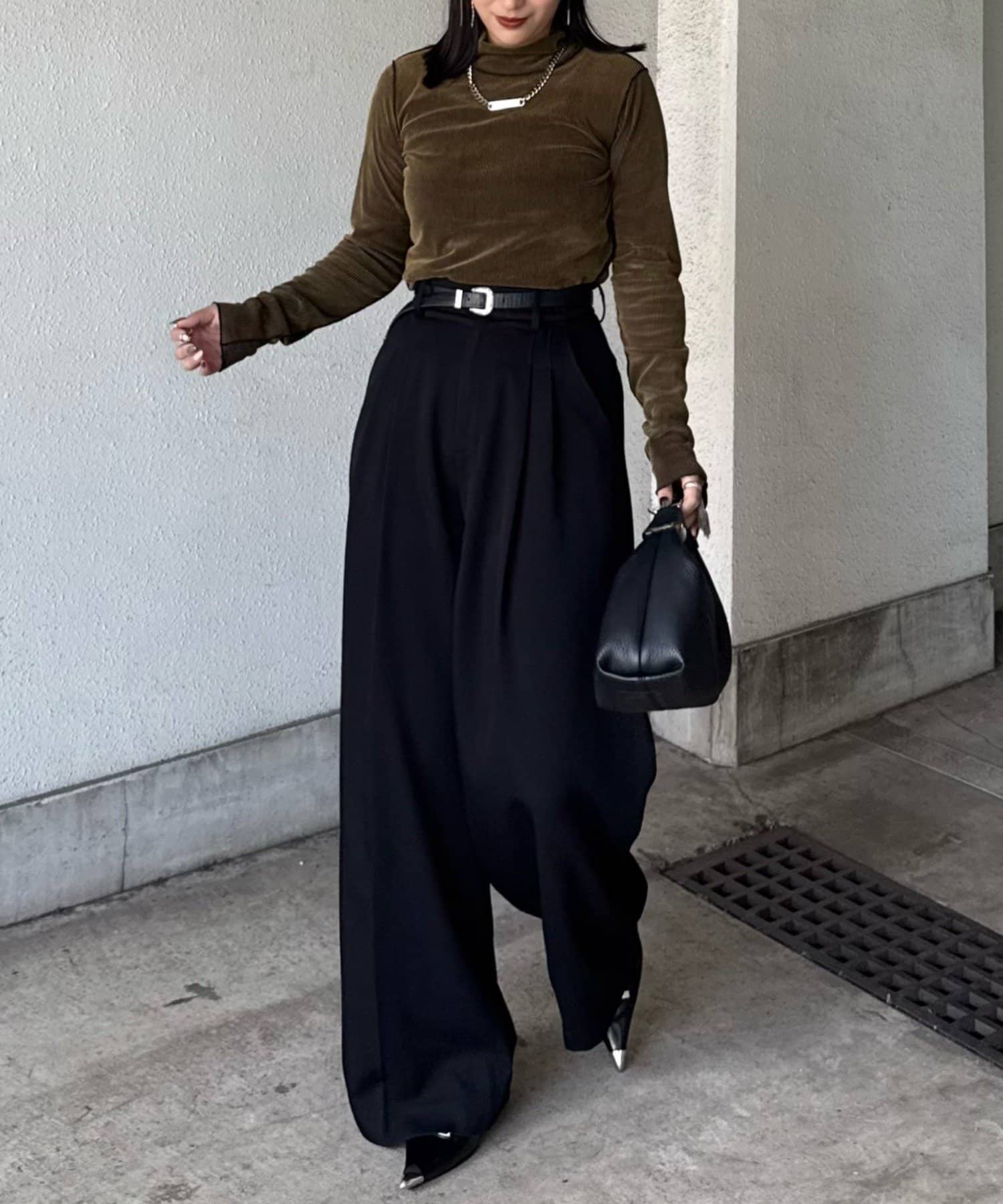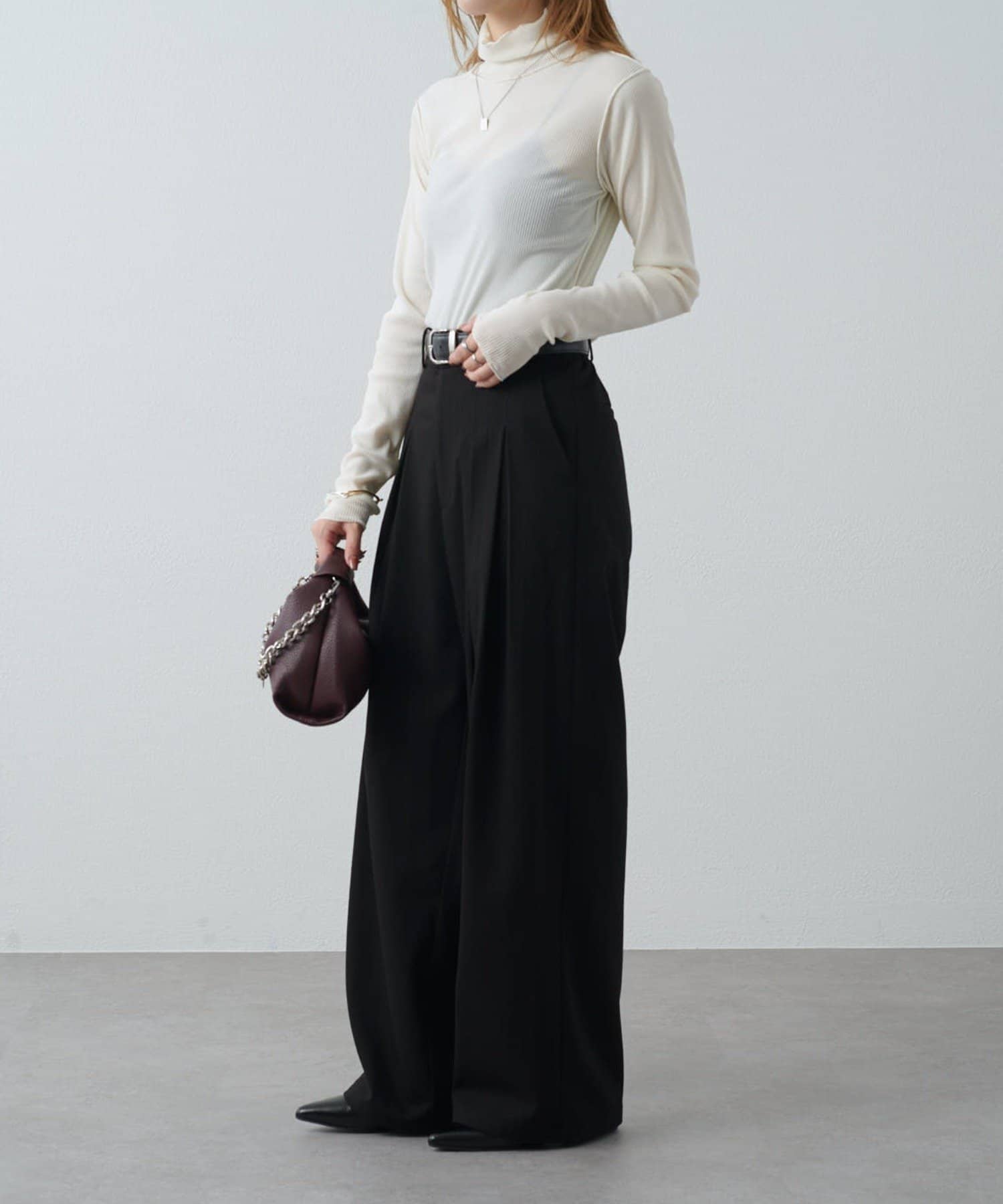 カジュアルスタイル:デニムやワイドパンツに合わせて抜け感のあるコーデに。スウェットになかに仕込んでレイヤードにも。