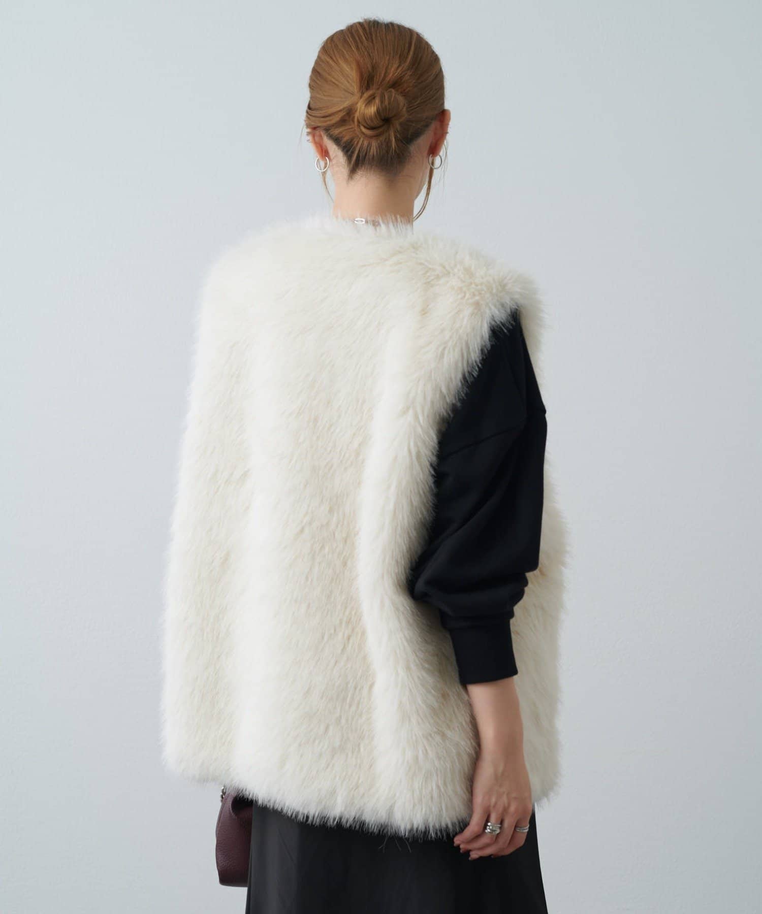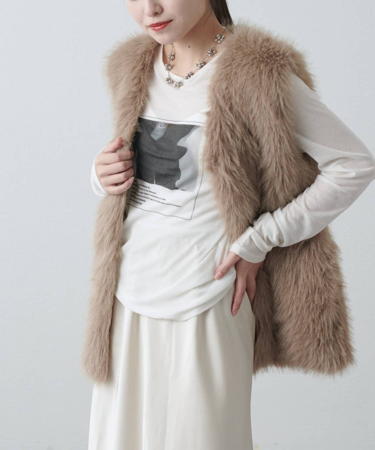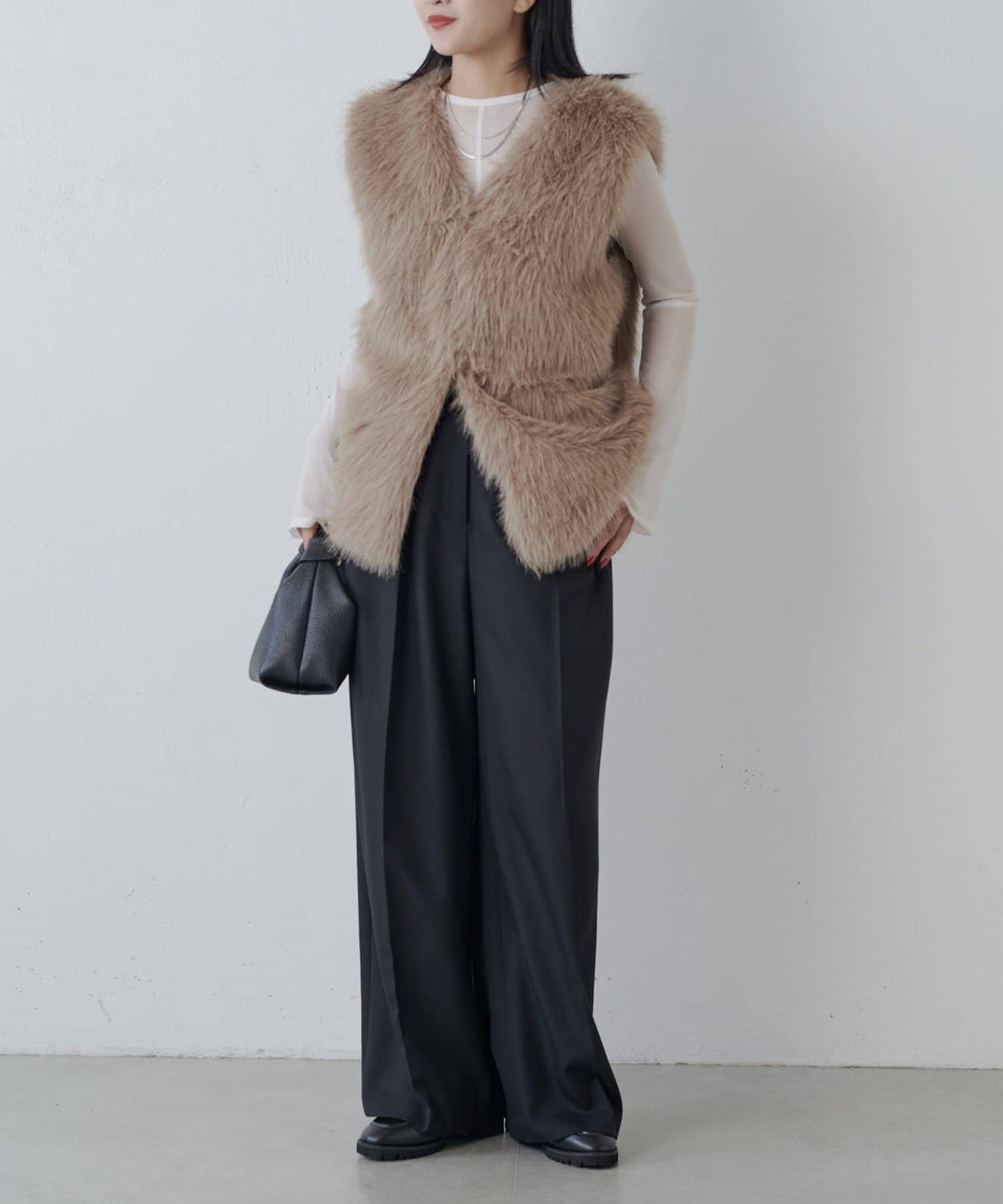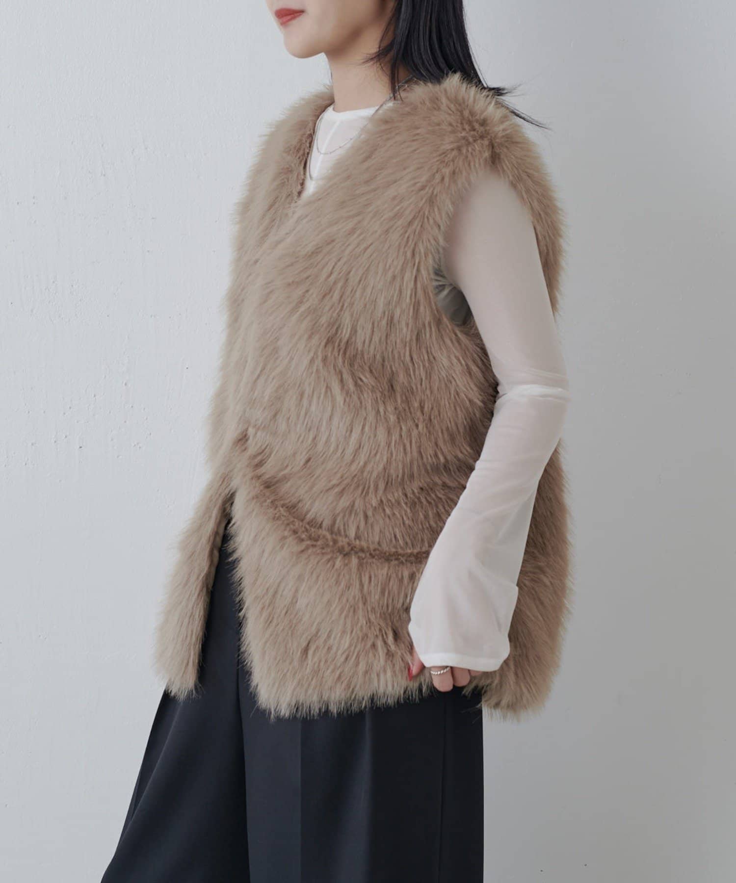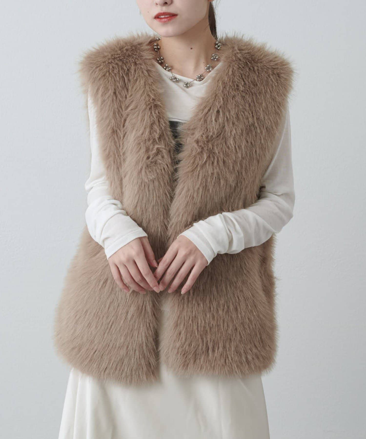 シーズンムード高まるフェイクファーベスト。