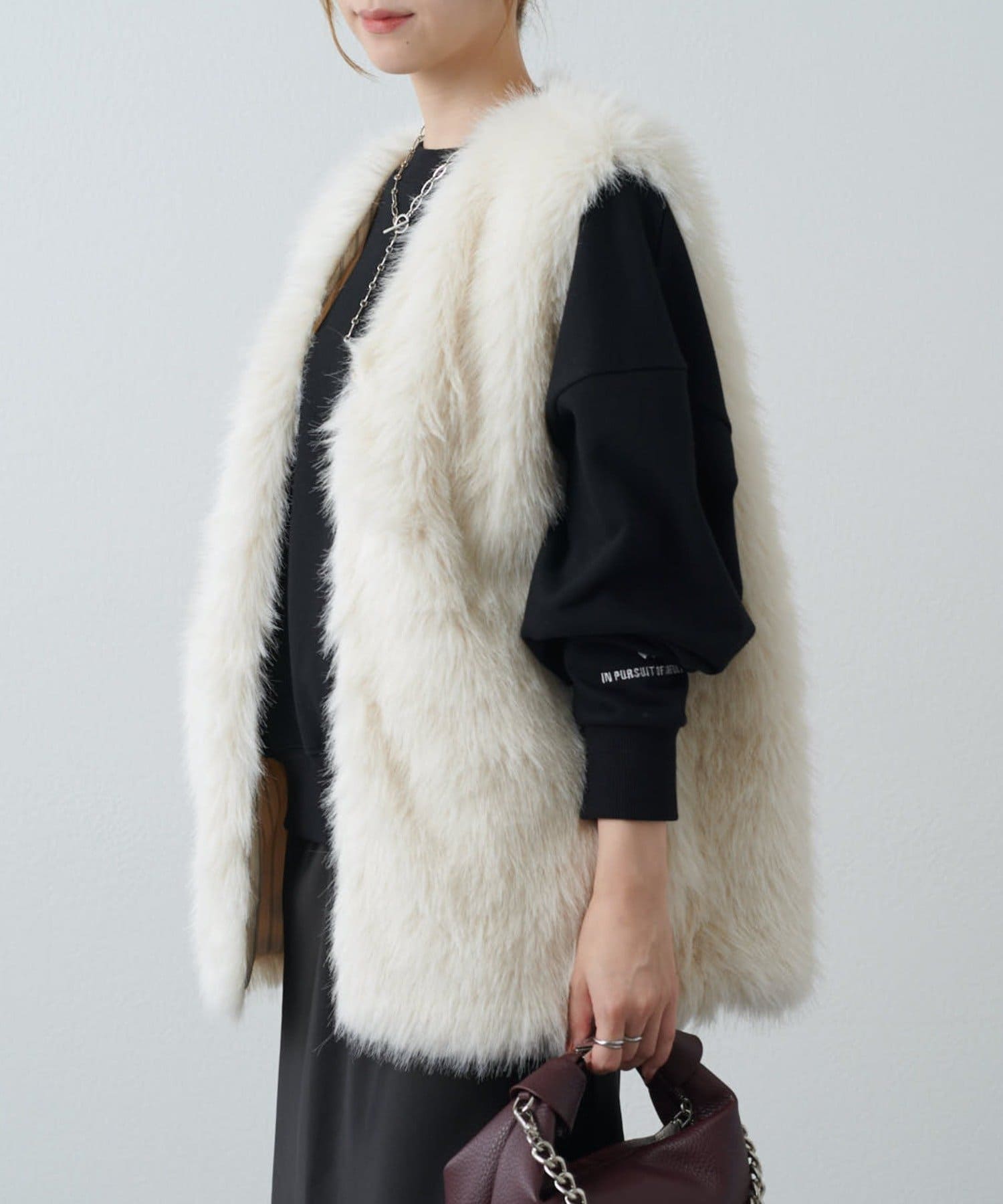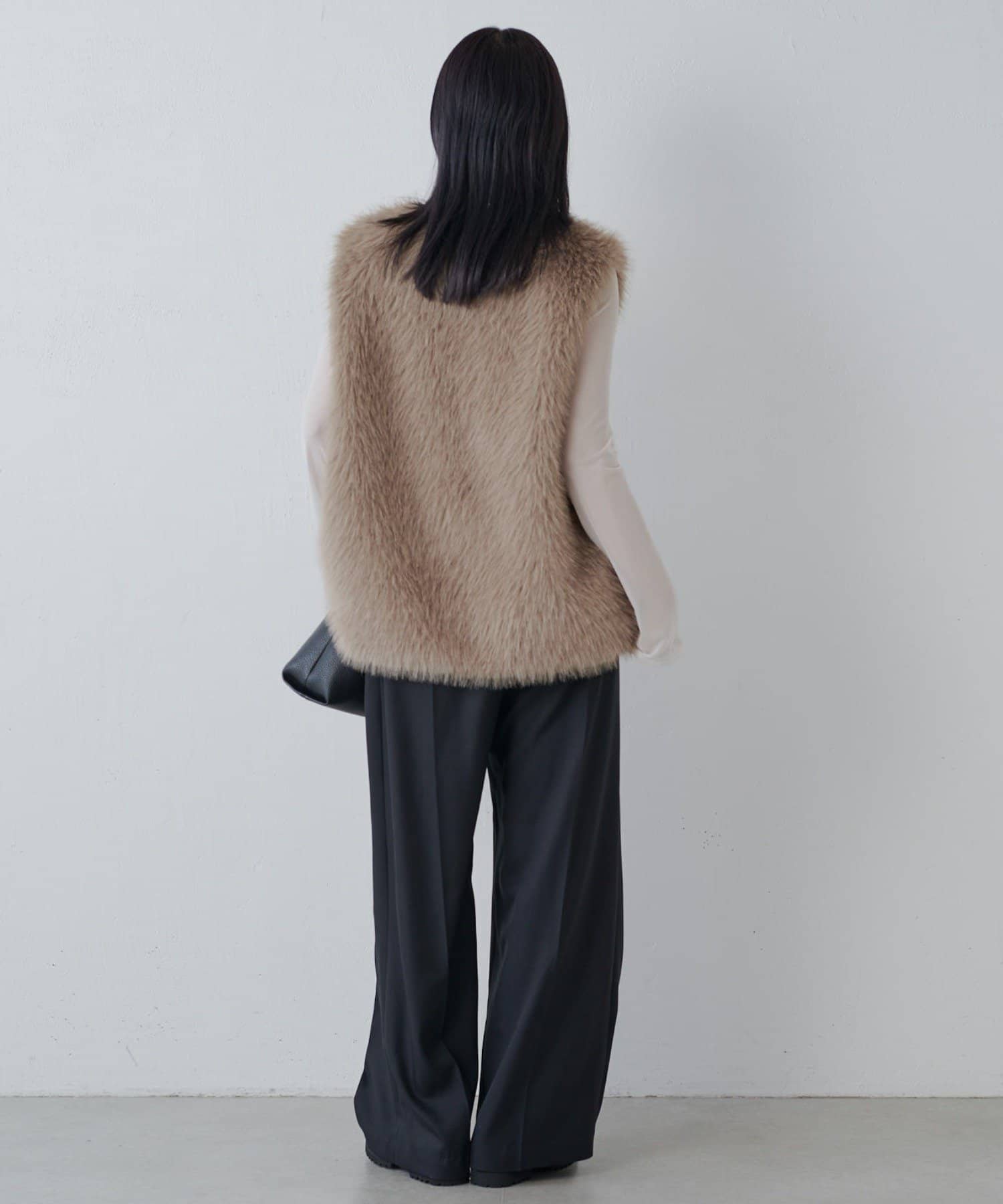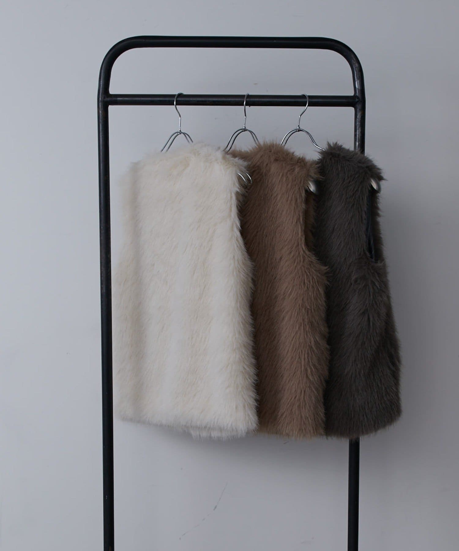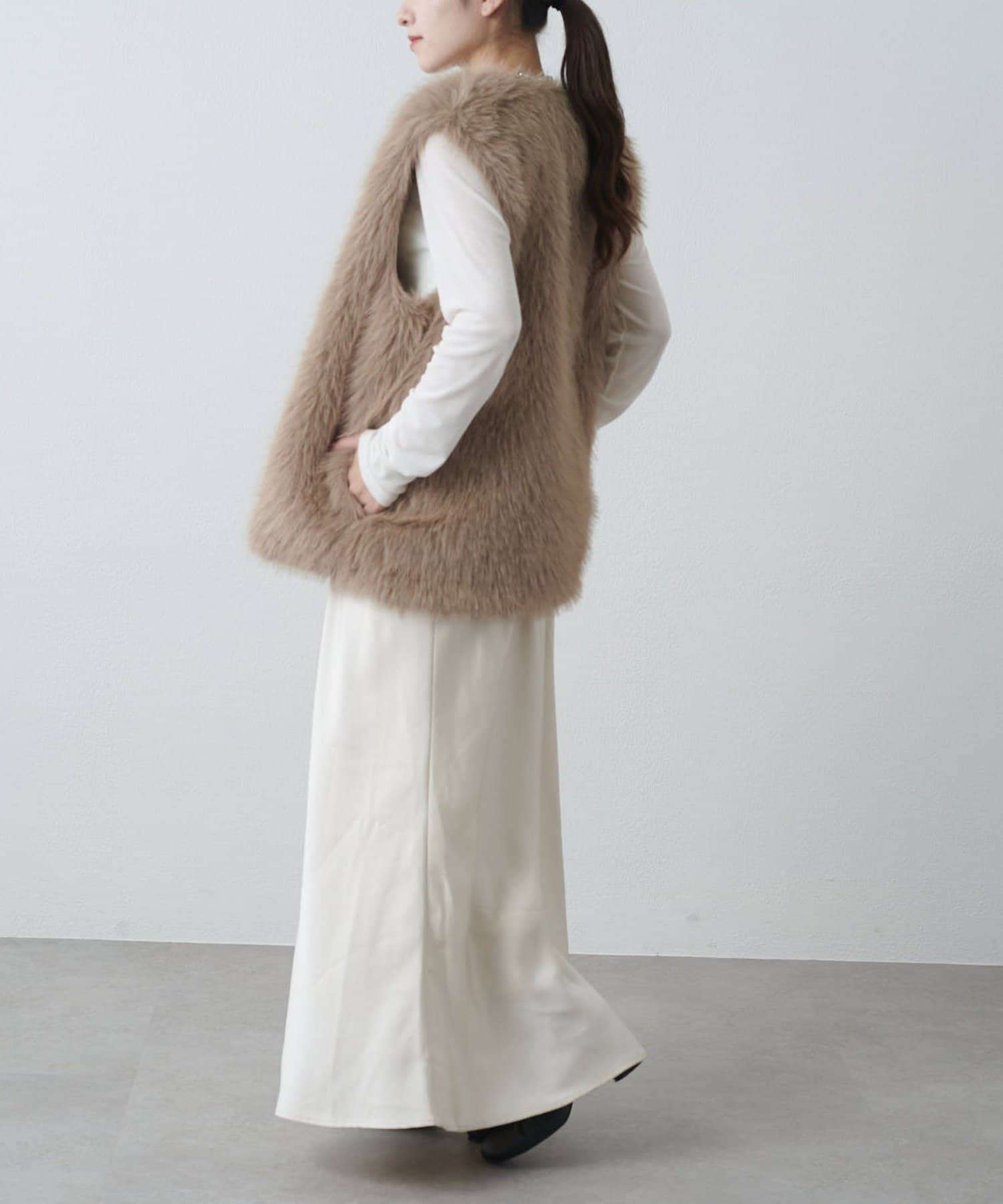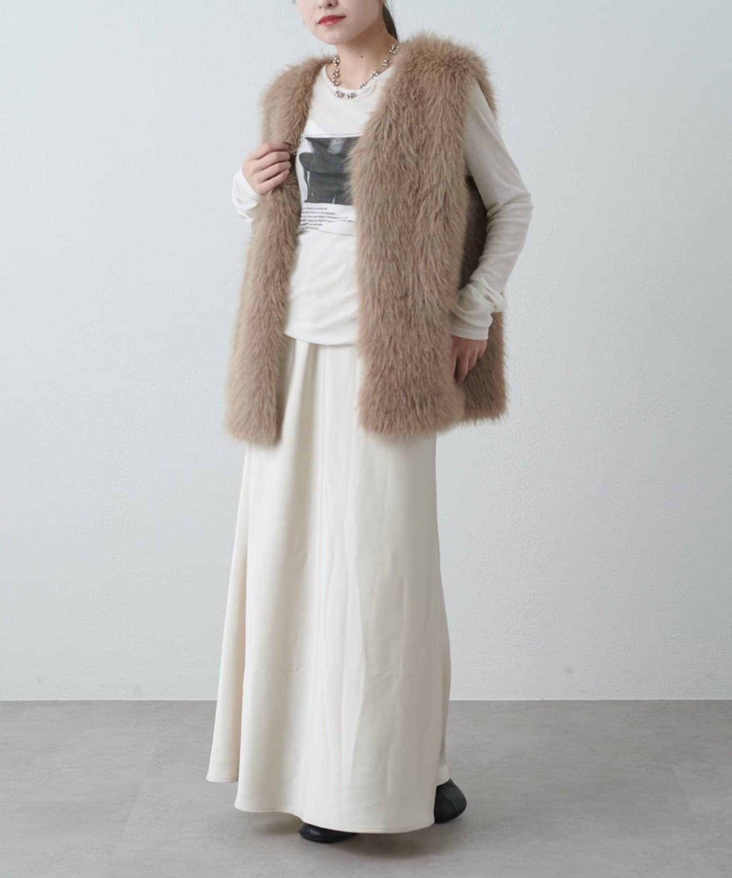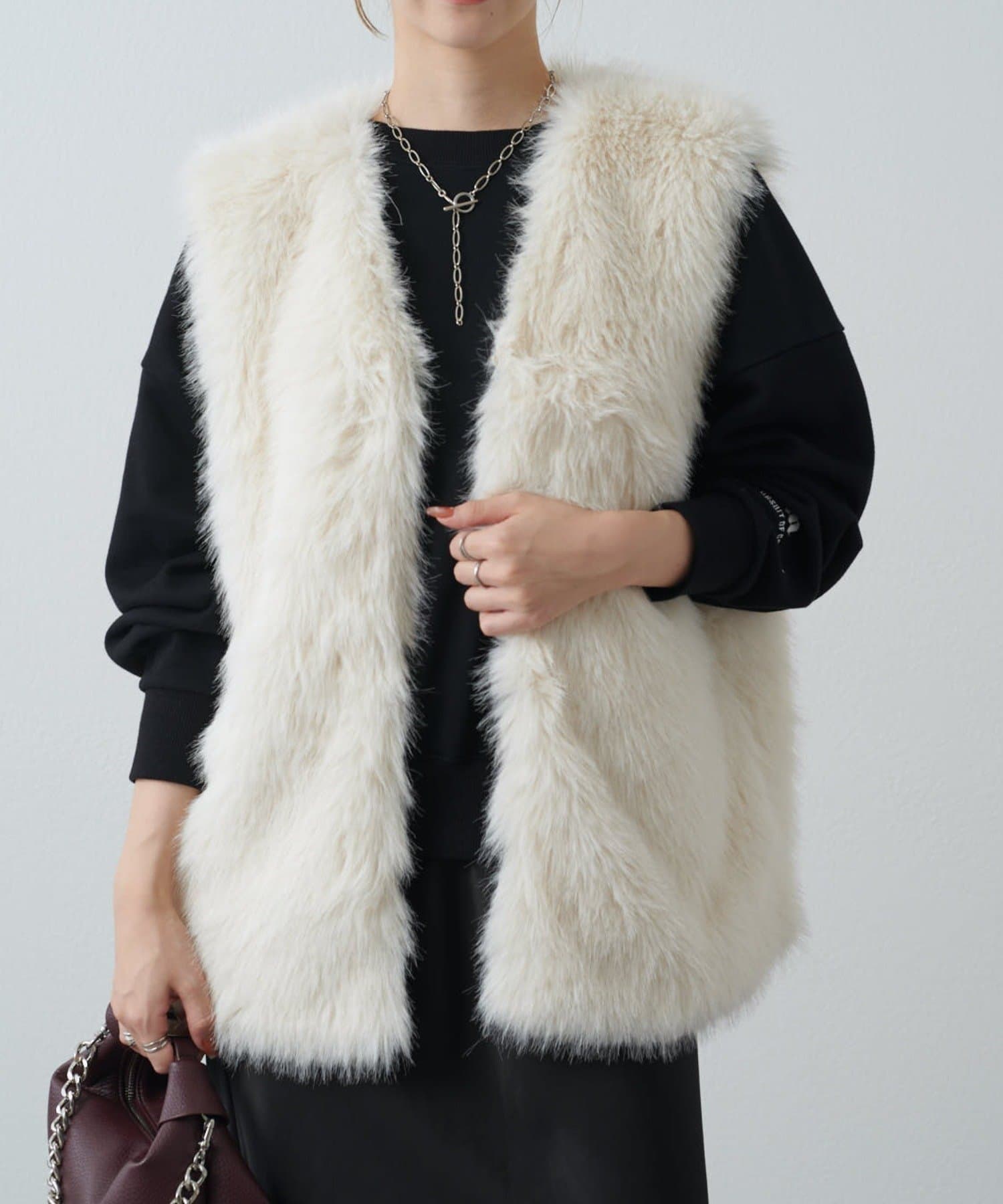 シーズンムード高まるフェイクファーベスト。