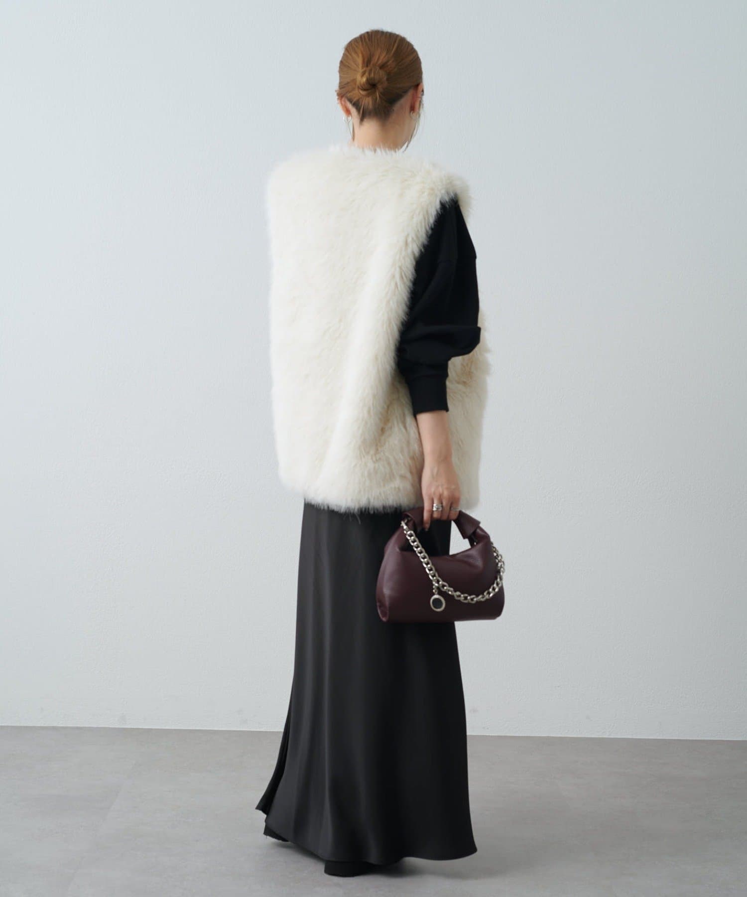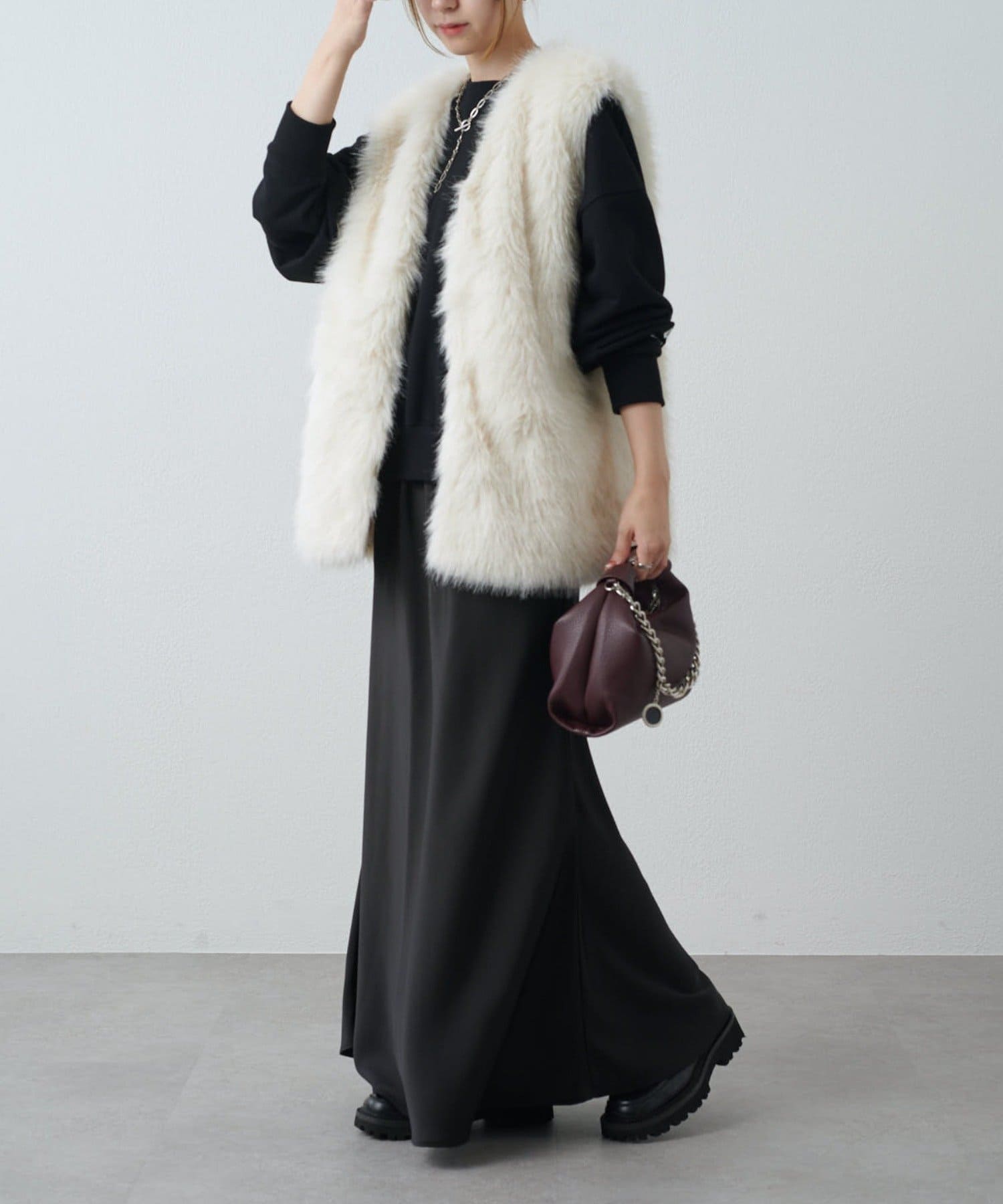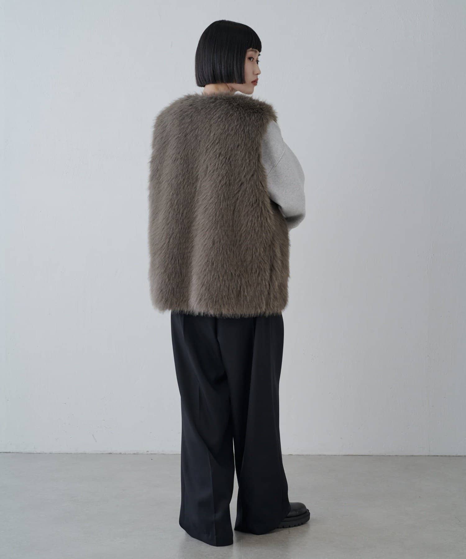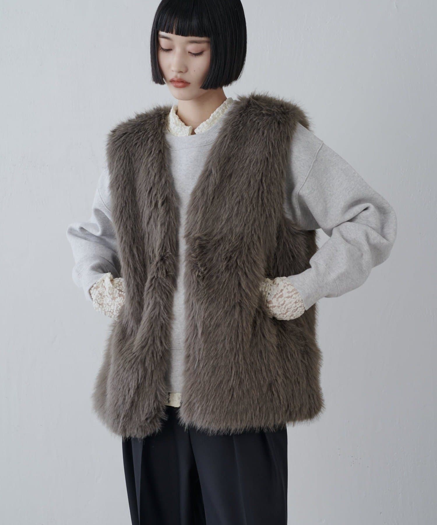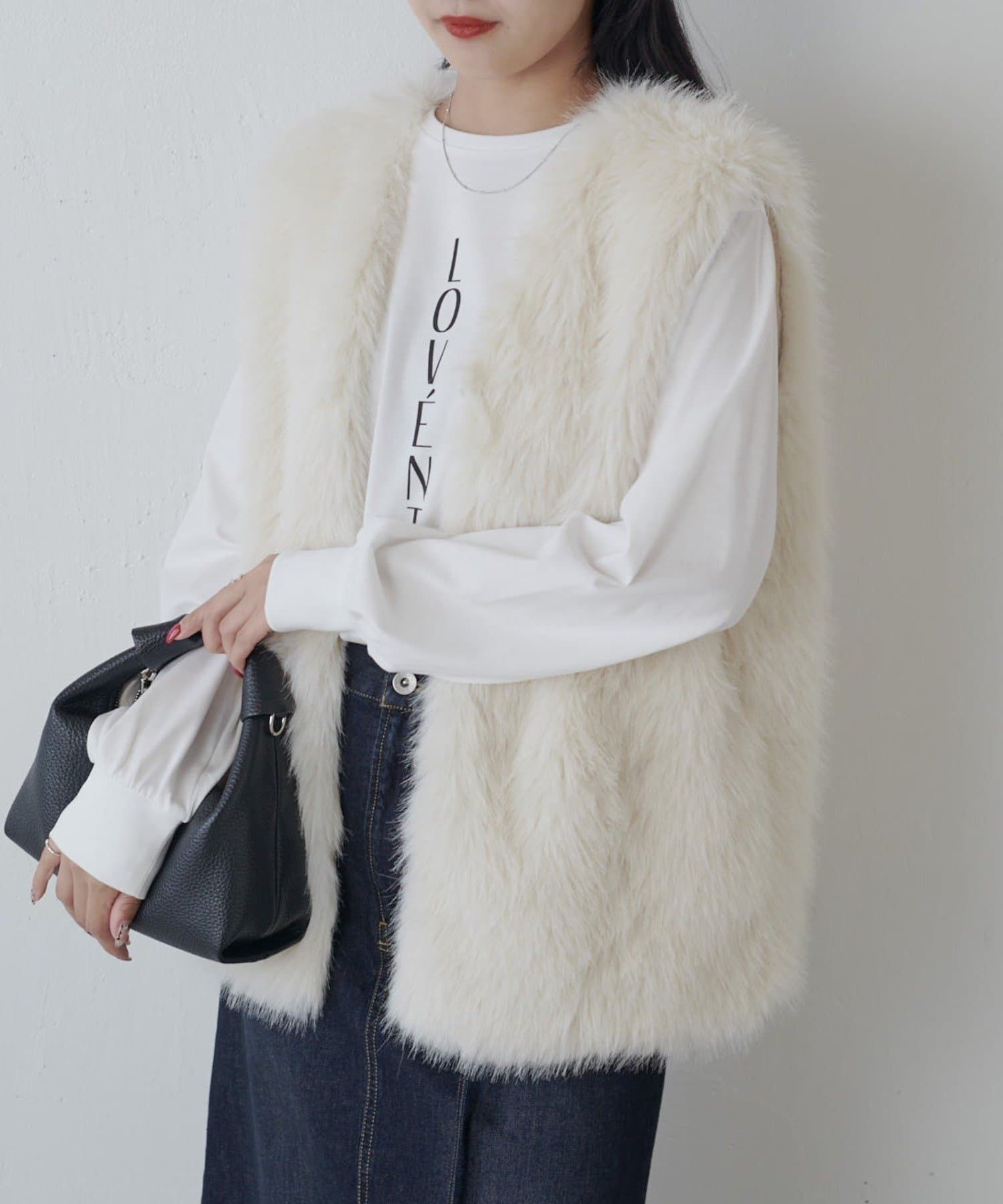 シーズンムード高まるフェイクファーベスト。