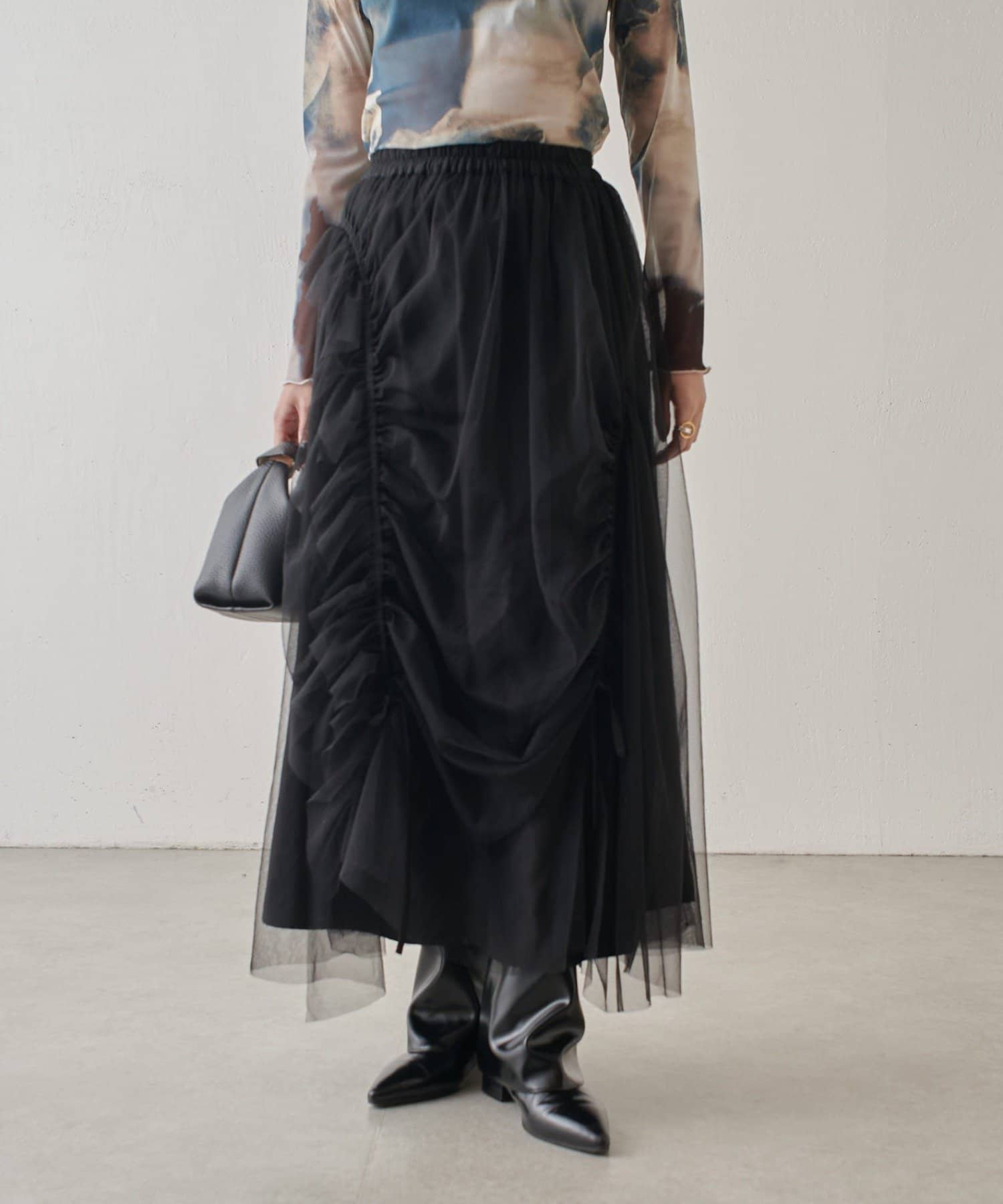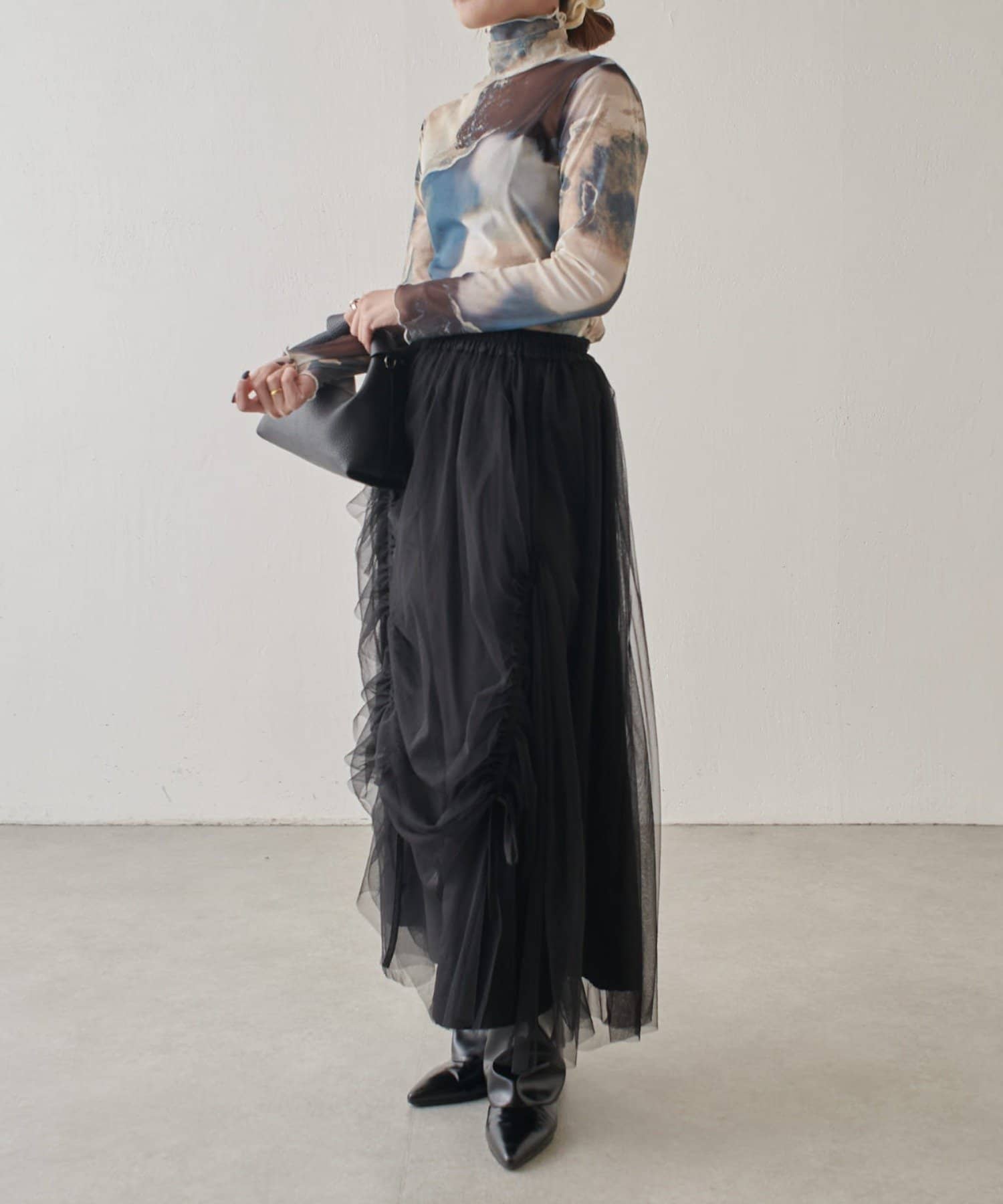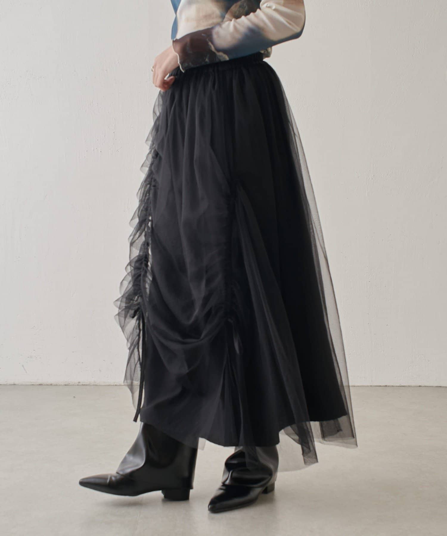 チュールスカートは、フロントデザインにドローコードが付いていてフリルとスリットの入ったデザインとなってます。