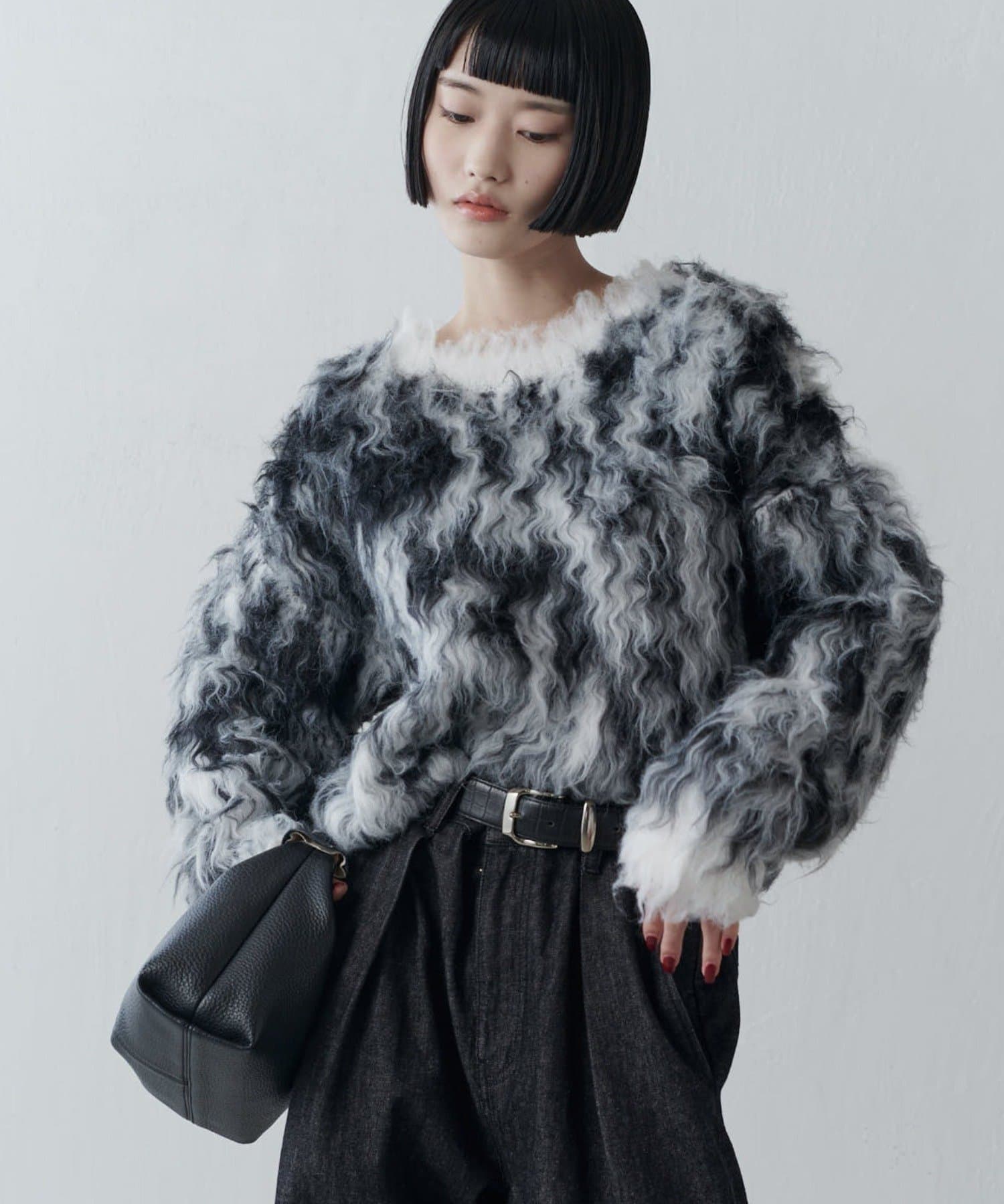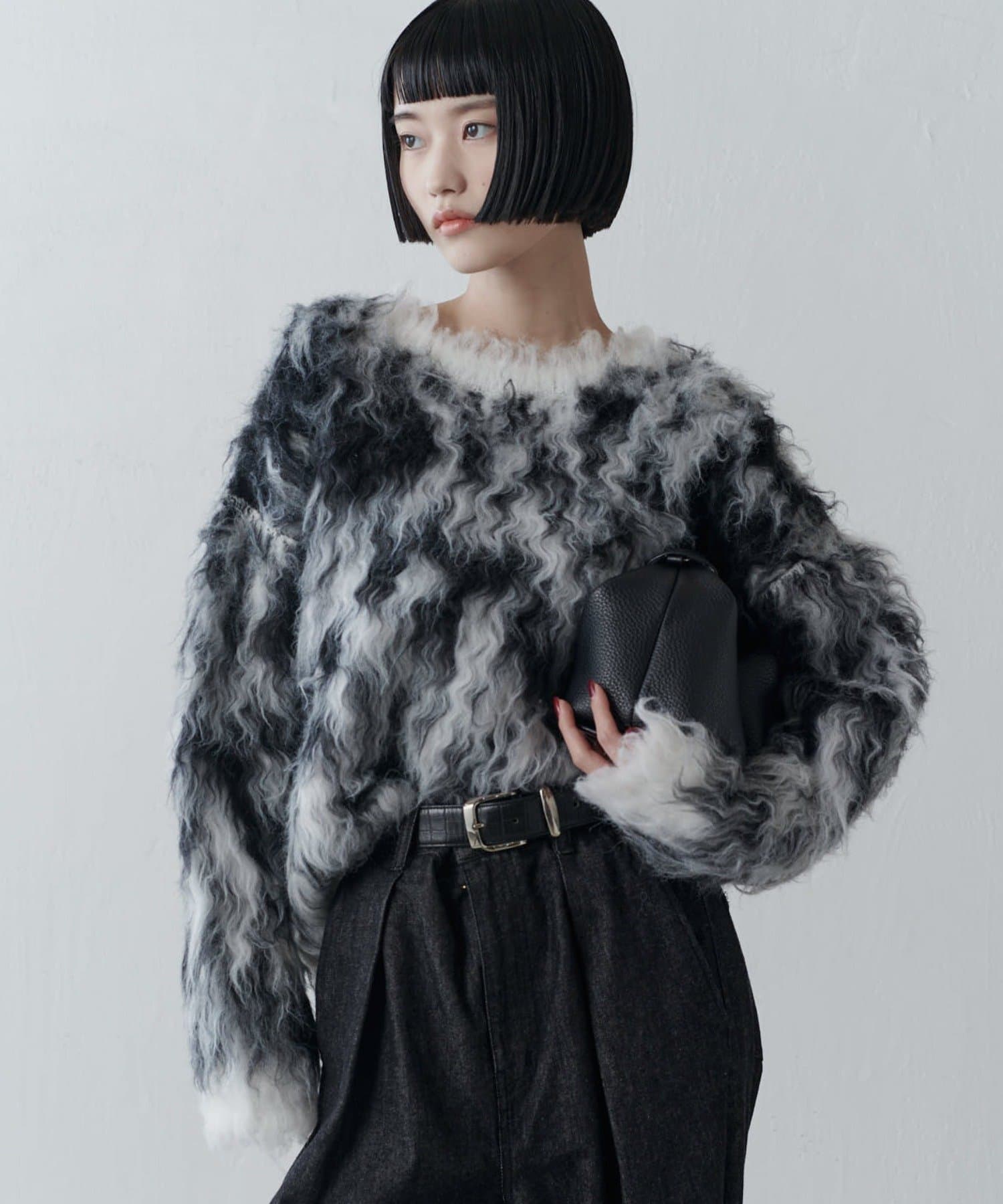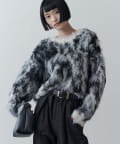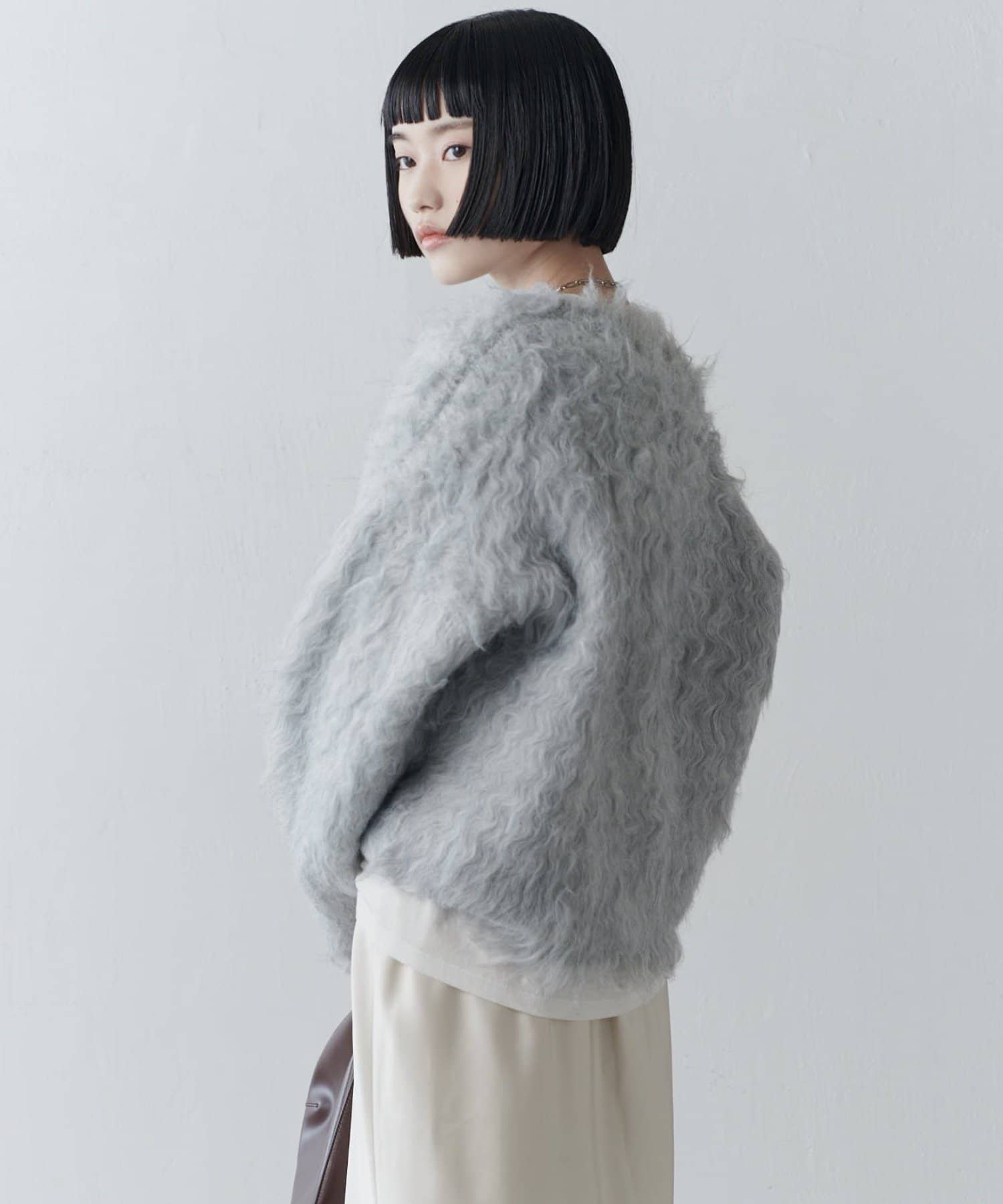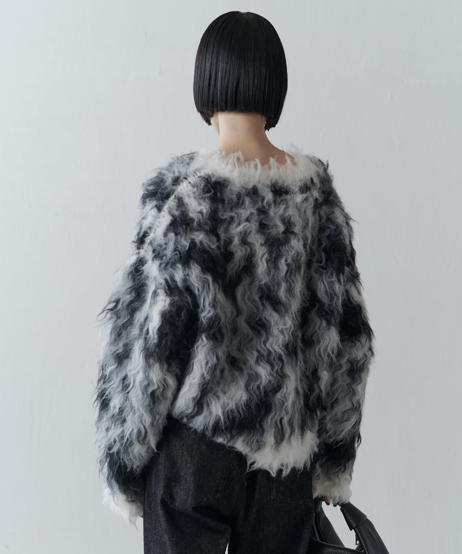 毛足が大胆に長めで、ボリューム感がオシャレな一枚。ミックス柄のなので大人っぽく着れるデザインとなっております。