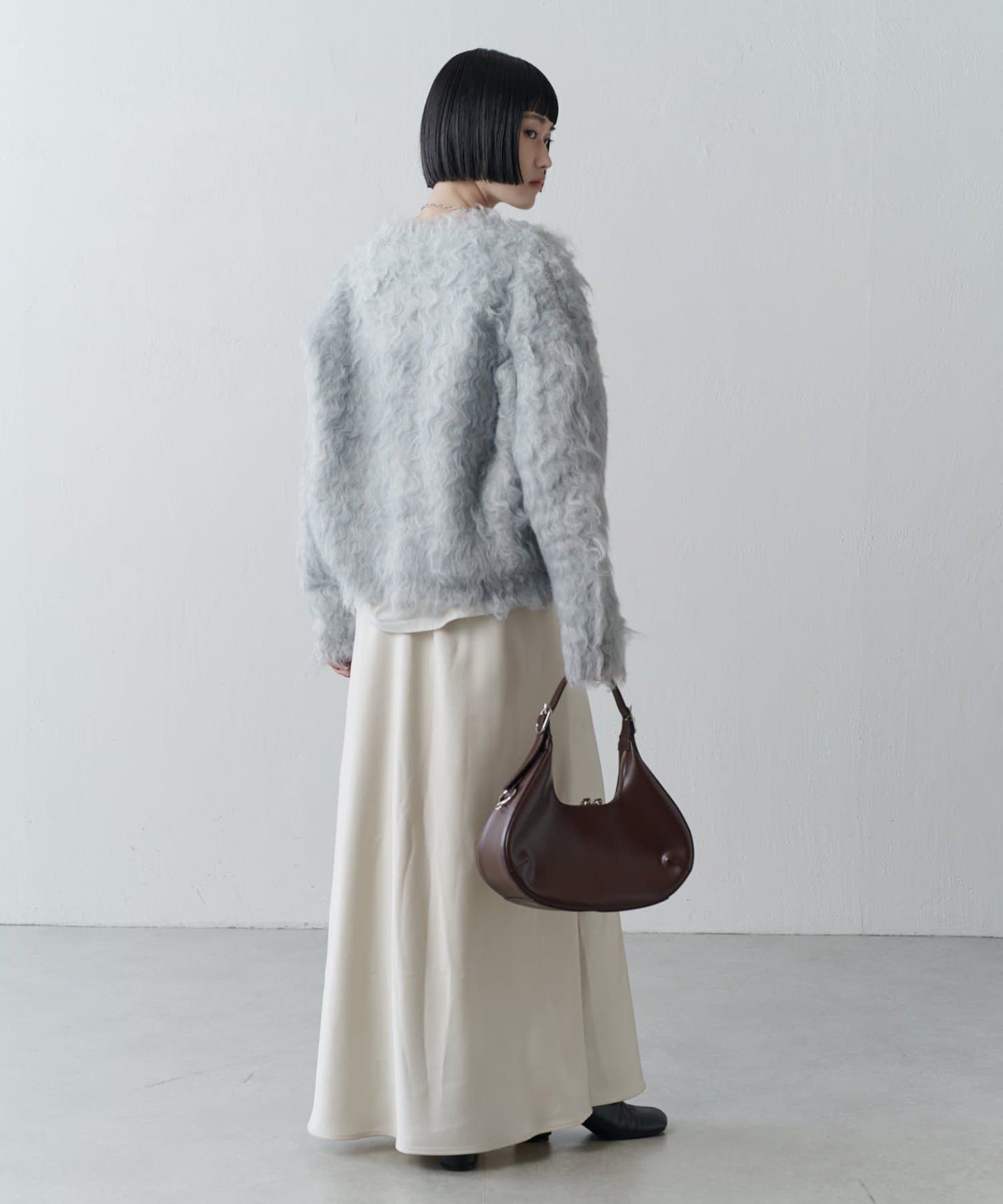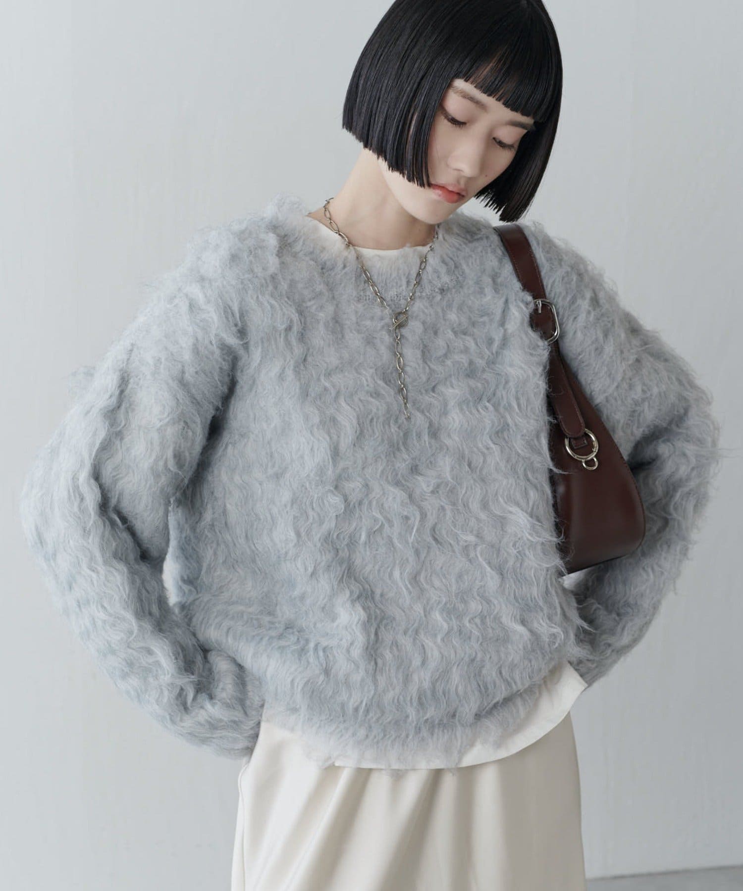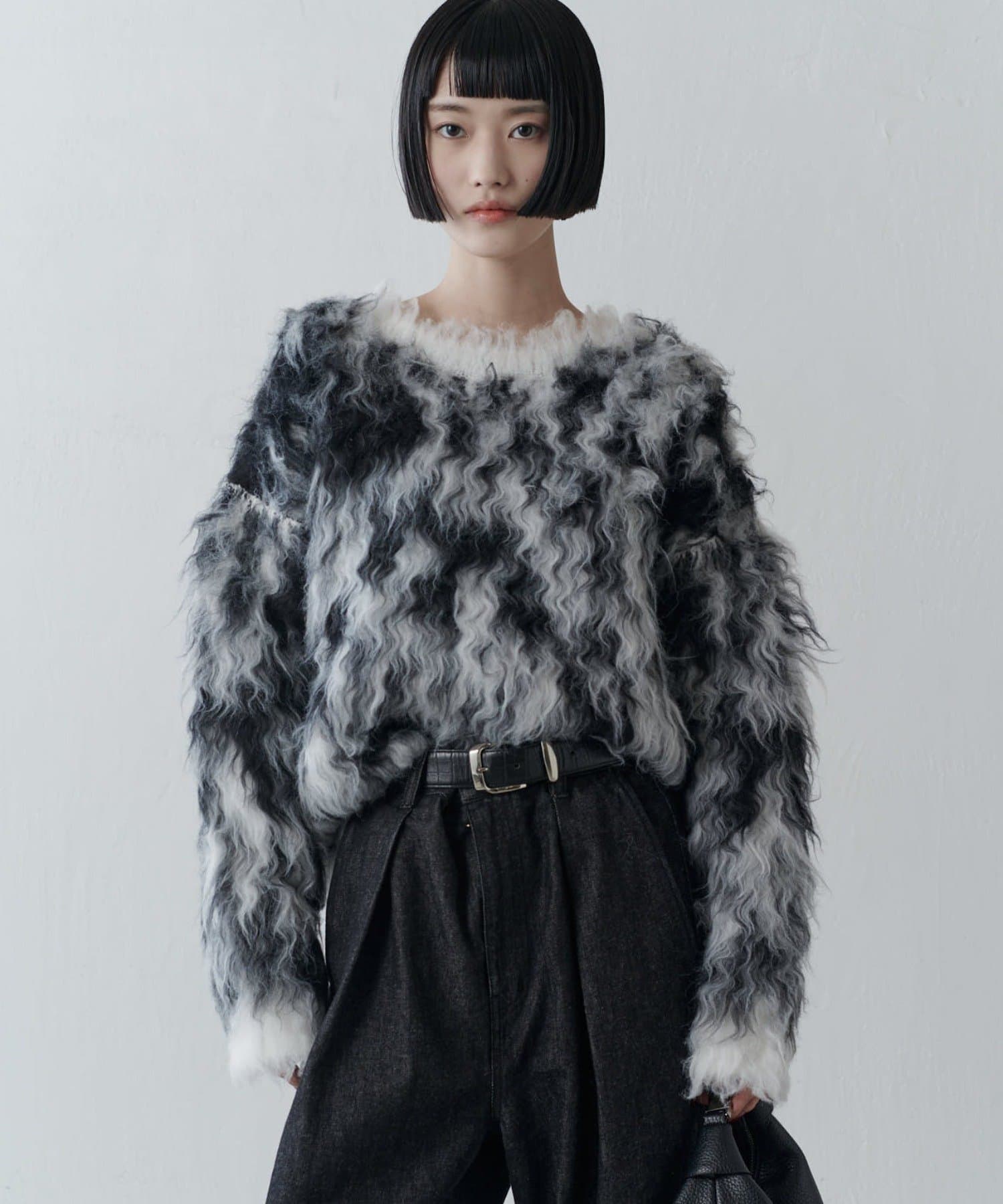 毛足が大胆に長めで、ボリューム感がオシャレな一枚。ミックス柄のなので大人っぽく着れるデザインとなっております。