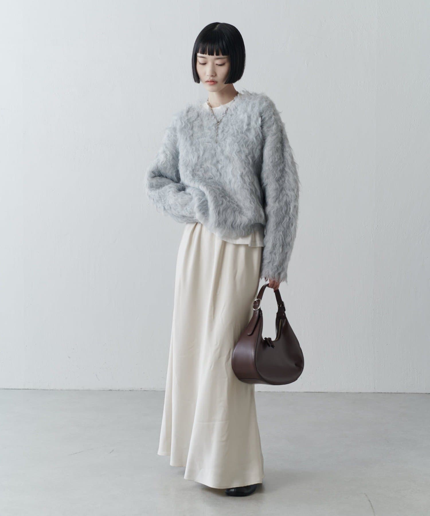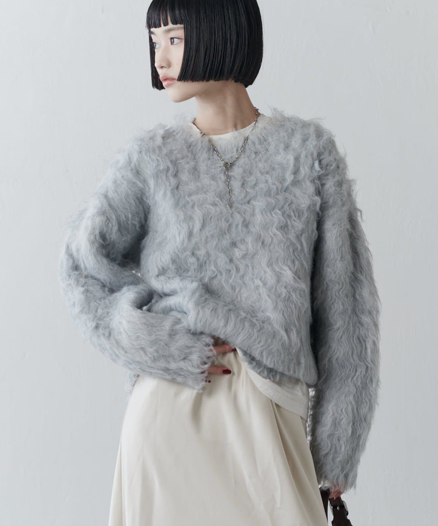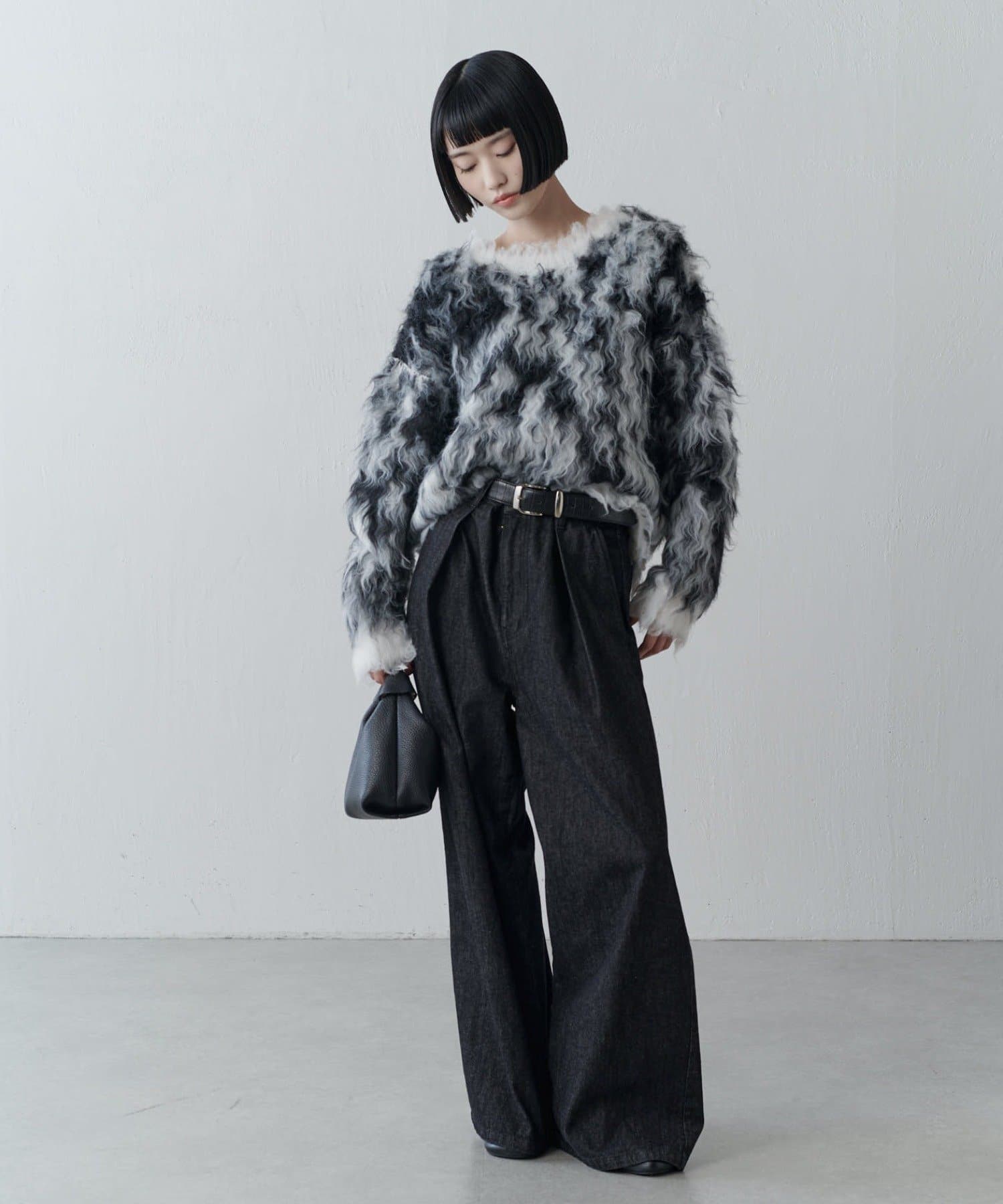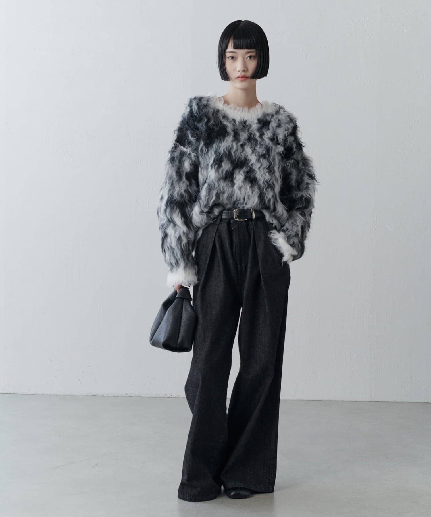 毛足が大胆に長めで、ボリューム感がオシャレな一枚。ミックス柄のなので大人っぽく着れるデザインとなっております。