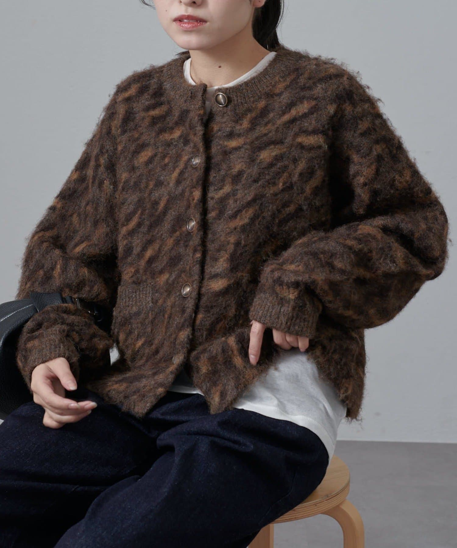 ふんわりと毛足が長いシャギーニットカーディガンで、女性らしくやわらかな雰囲気に。