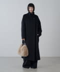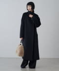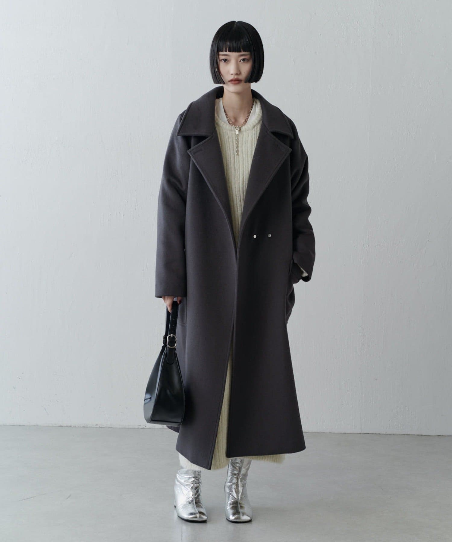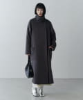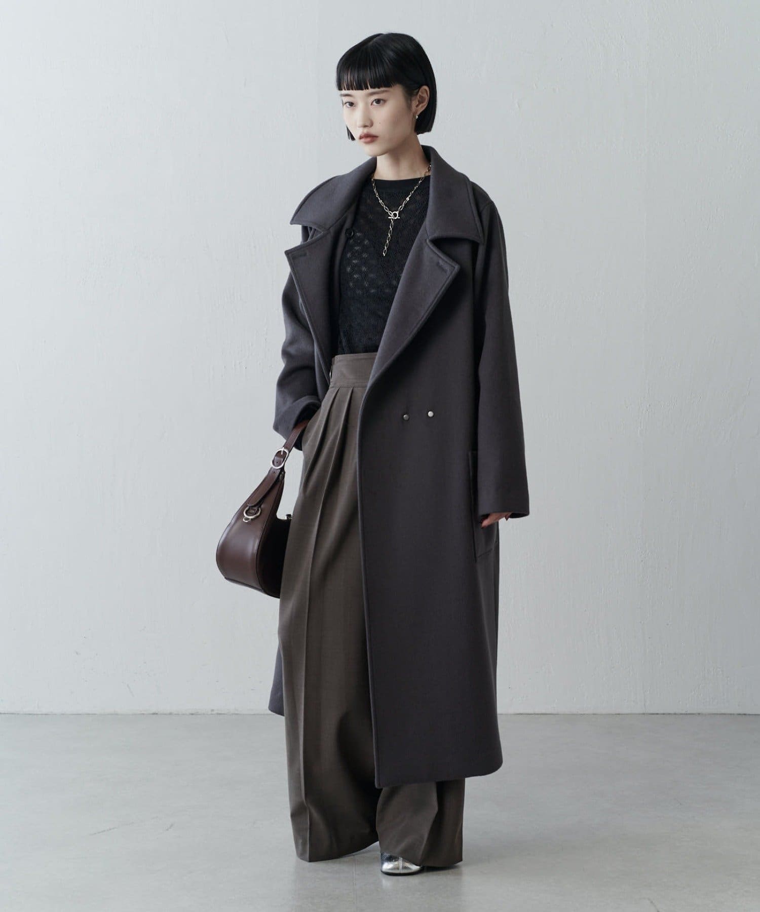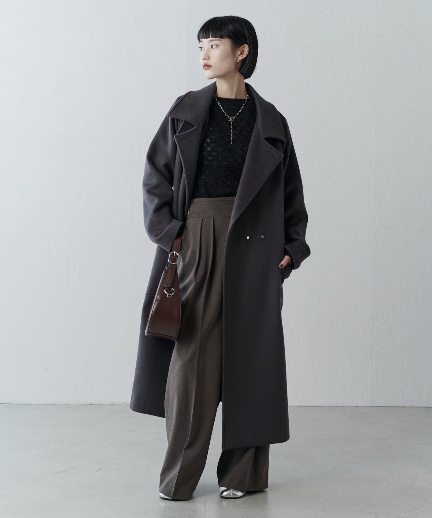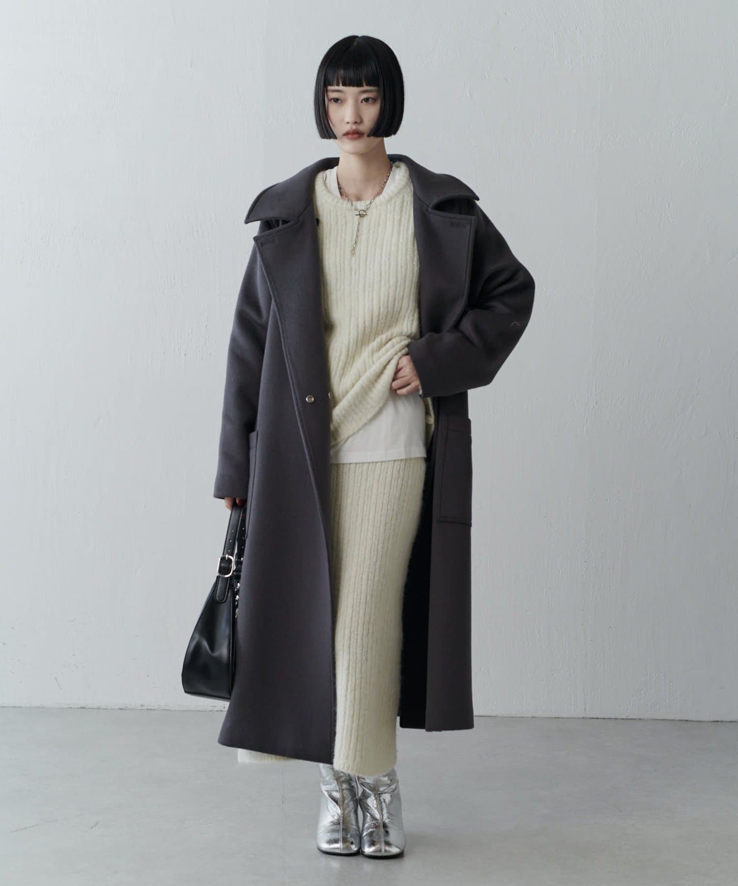 キレイめコーデ:シャギーニットやタートルリブニットをスラックスやロングスカートに合わせたスタイリングの上からバサッと羽織ったスタイリング。