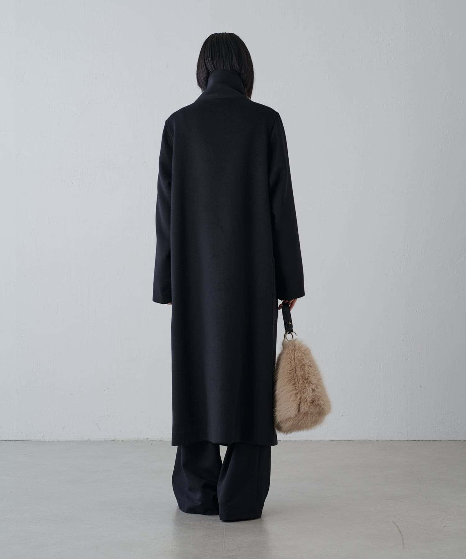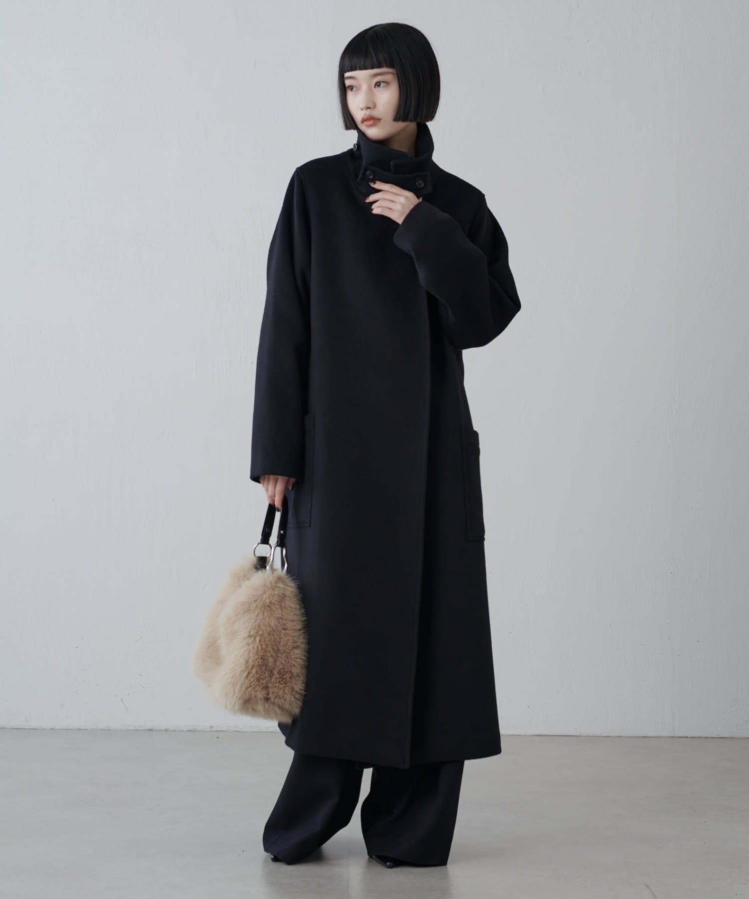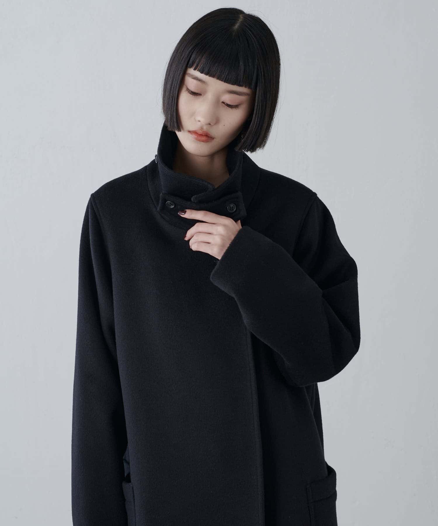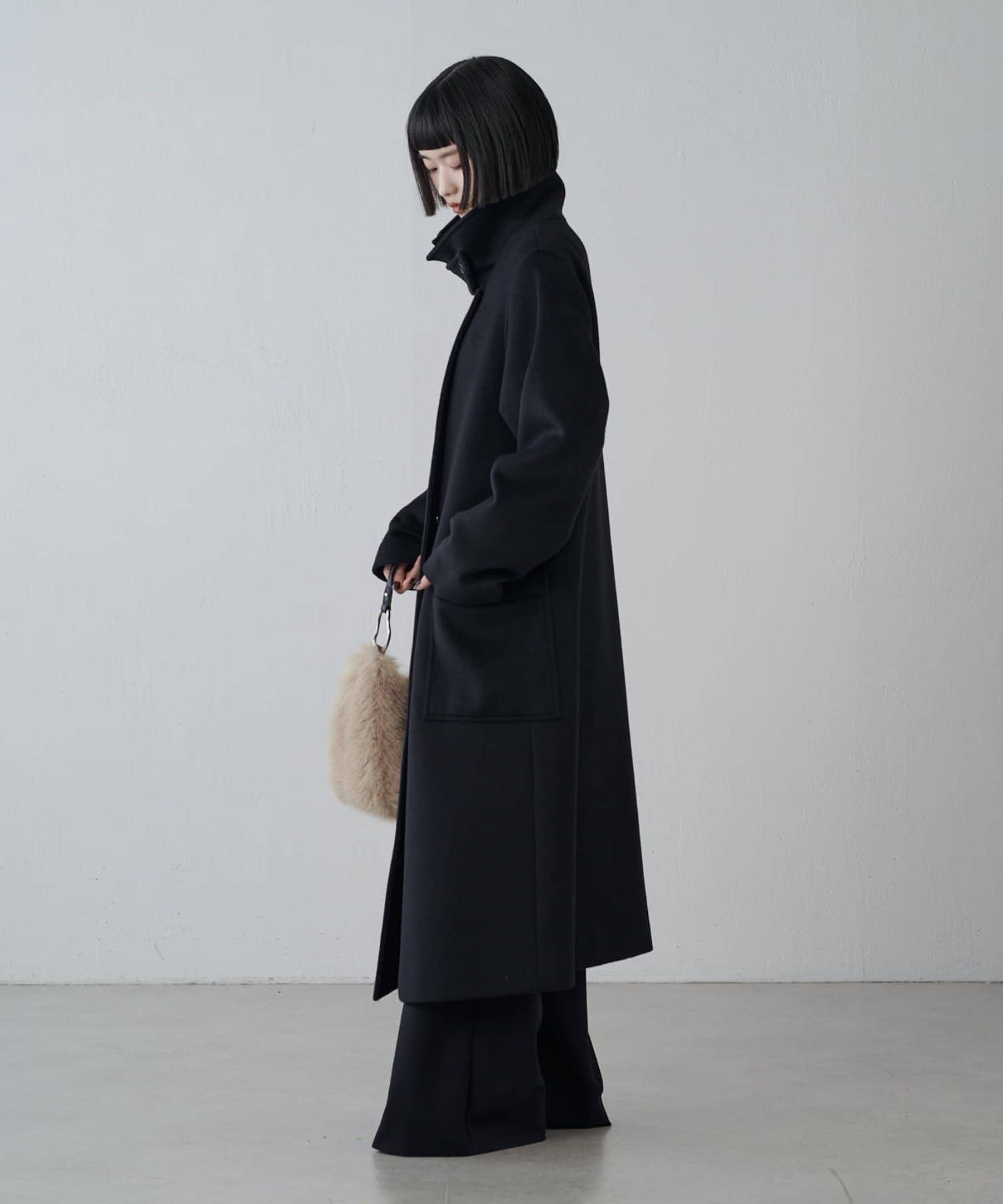 襟部分を立ち上げてチンストラップを留めることで、ハイネックコートとしても使って頂けます。