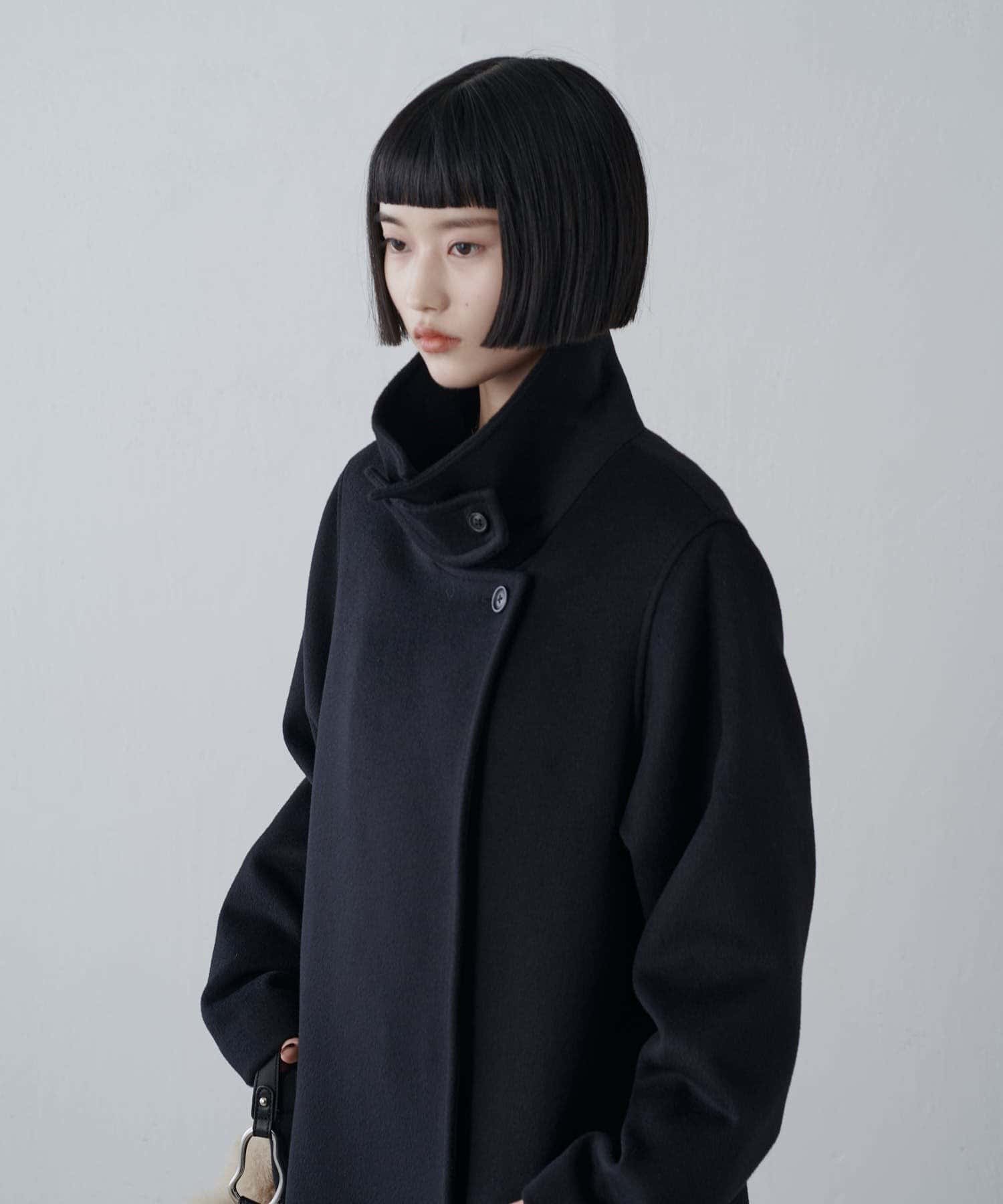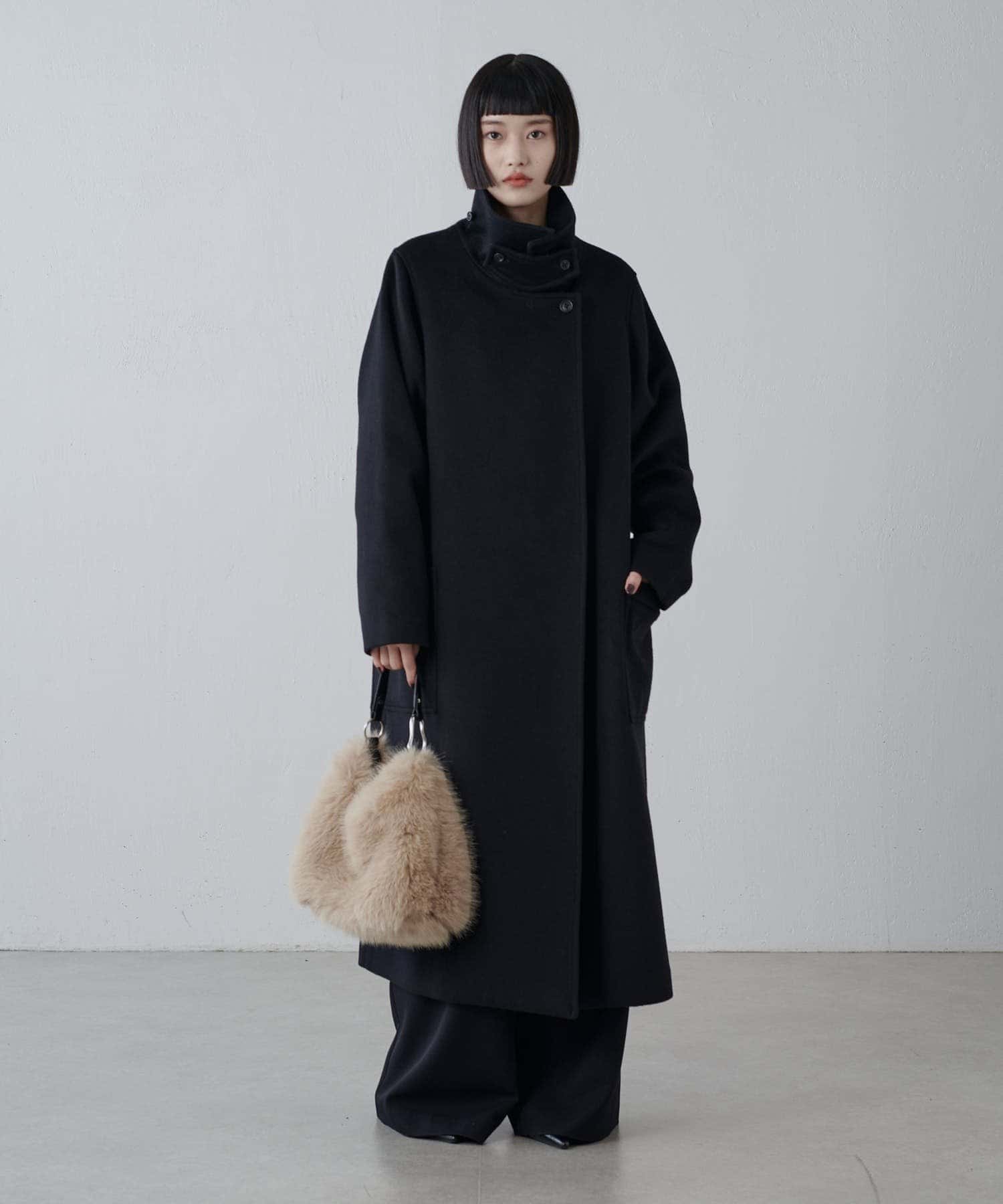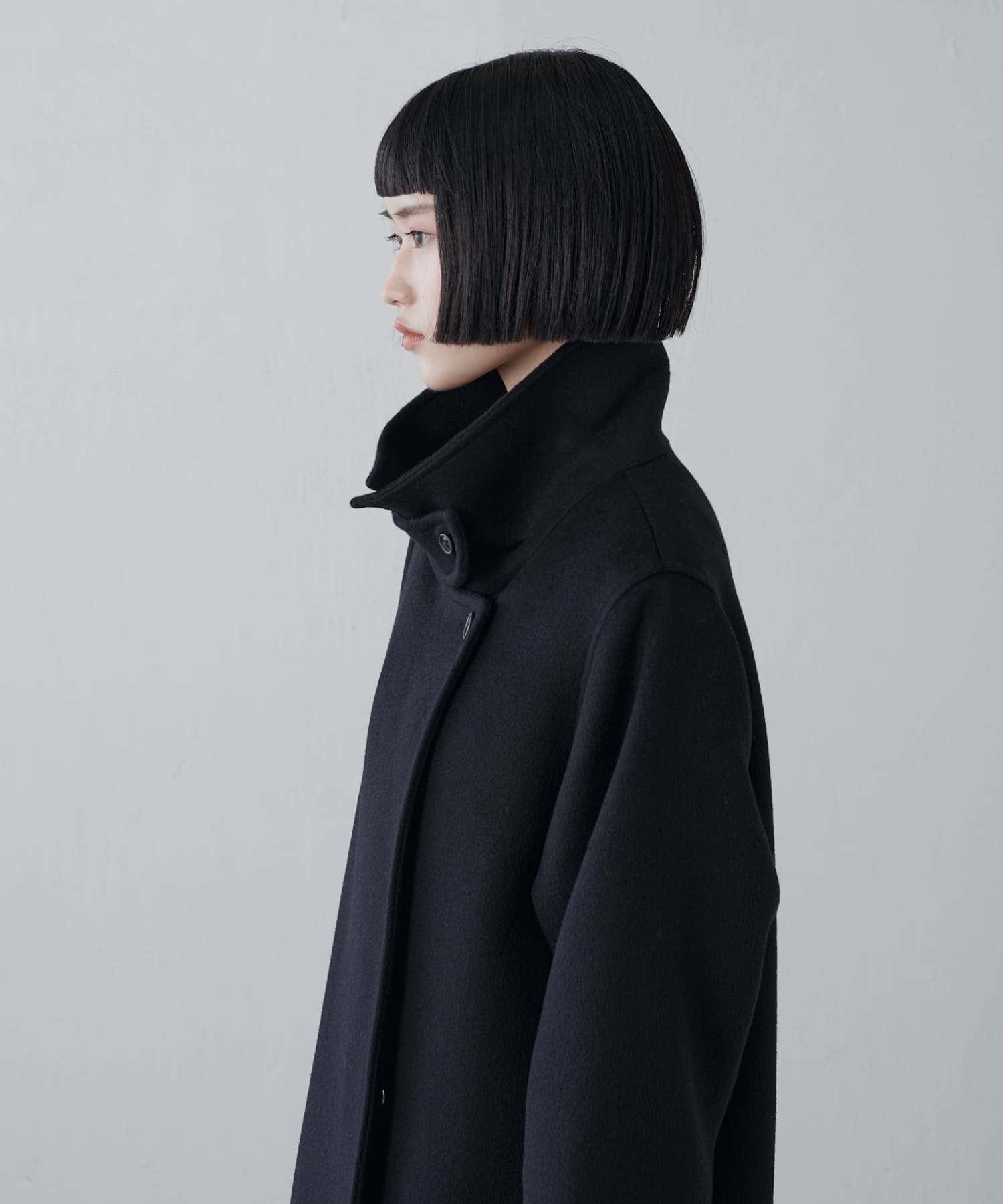 襟部分を立ち上げてチンストラップを留めることで、ハイネックコートとしても使って頂けます。