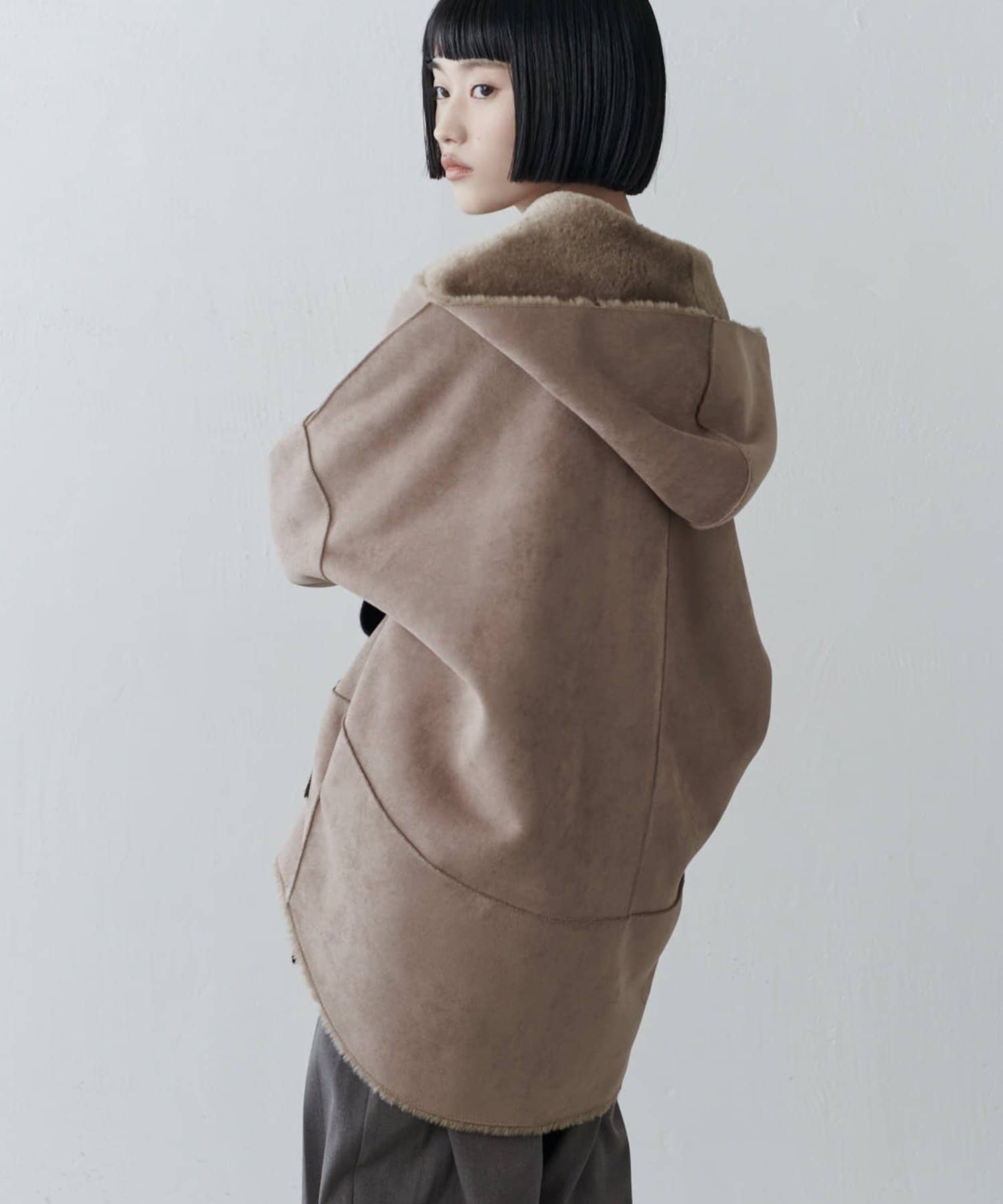 滑らかな風合いと柔らかな質感が特徴のフェイクスエード、毛並みがきれいで柔らかなフェイクファーを組み合わせたボンディングしたフェイクムートン。