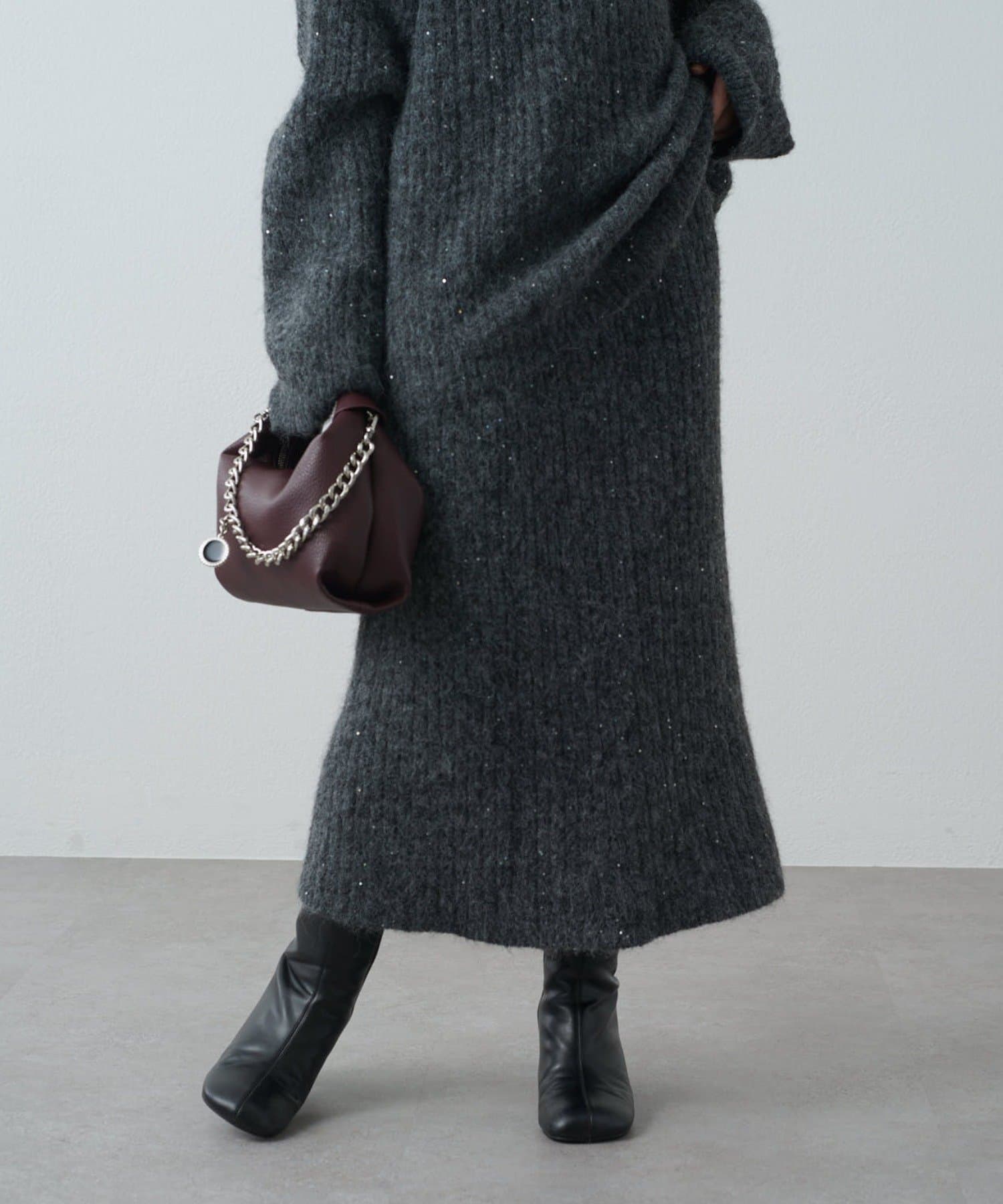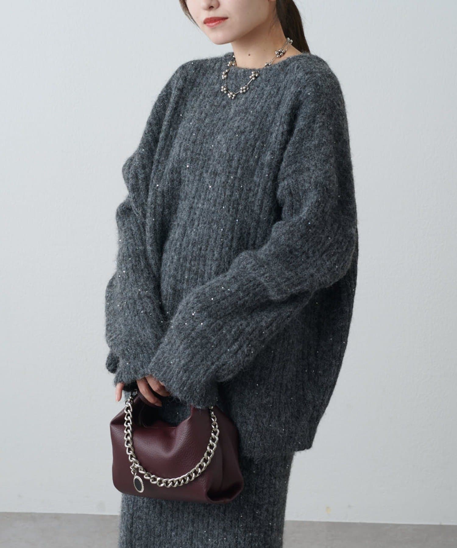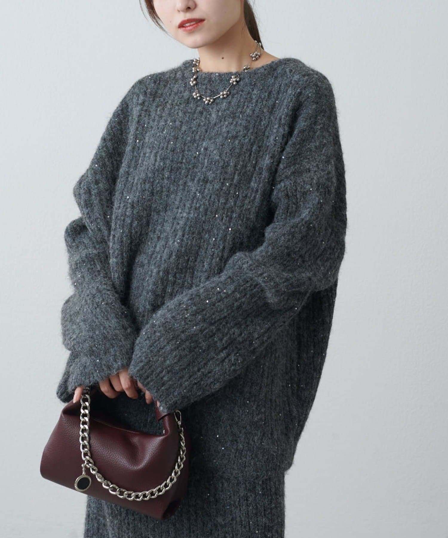 スパンコールが混ざっているニット素材ですが、チクチクしずらい素材感。